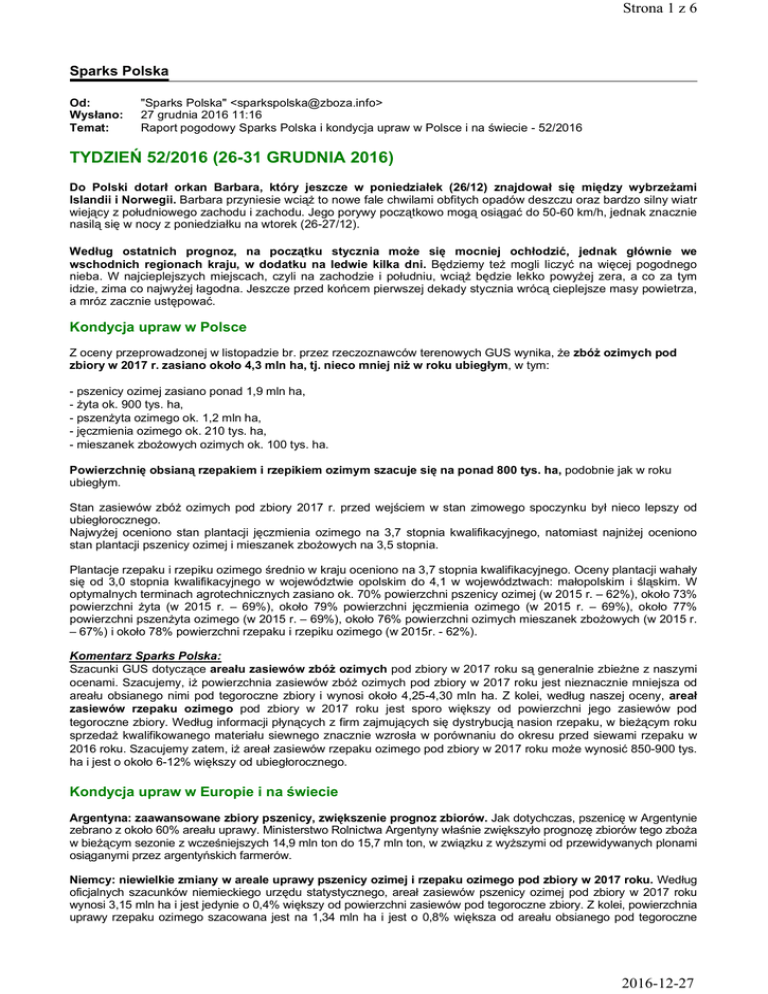 Strona 1 z 6 Sparks Polska Od: Wysłano: Temat: "Sparks Polska" <[email protected]> 27 grudnia 2016 11:16 Raport pogodowy Sparks Polska i kondycja upraw w Polsce i na świecie - 52/2016 TYDZIEŃ 52/2016 (26-31 GRUDNIA 2016) Do Polski dotarł orkan Barbara, który jeszcze w poniedziałek (26/12) znajdował się między wybrzeżami Islandii i Norwegii. Barbara przyniesie wciąż to nowe fale chwilami obfitych opadów deszczu oraz bardzo silny wiatr wiejący z południowego zachodu i zachodu. Jego porywy początkowo mogą osiągać do 50-60 km/h, jednak znacznie nasilą się w nocy z poniedziałku na wtorek (26-27/12). Według ostatnich prognoz, na początku stycznia może się mocniej ochłodzić, jednak głównie we wschodnich regionach kraju, w dodatku na ledwie kilka dni. Będziemy też mogli liczyć na więcej pogodnego nieba. W najcieplejszych miejscach, czyli na zachodzie i południu, wciąż będzie lekko powyżej zera, a co za tym idzie, zima co najwyżej łagodna. Jeszcze przed końcem pierwszej dekady stycznia wrócą cieplejsze masy powietrza, a mróz zacznie ustępować. Kondycja upraw w Polsce Z oceny przeprowadzonej w listopadzie br. przez rzeczoznawców terenowych GUS wynika, że zbóż ozimych pod zbiory w 2017 r. zasiano około 4,3 mln ha, tj. nieco mniej niż w roku ubiegłym, w tym: - pszenicy ozimej zasiano ponad 1,9 mln ha, - żyta ok. 900 tys. ha, - pszenżyta ozimego ok. 1,2 mln ha, - jęczmienia ozimego ok. 210 tys. ha, - mieszanek zbożowych ozimych ok. 100 tys. ha. Powierzchnię obsianą rzepakiem i rzepikiem ozimym szacuje się na ponad 800 tys. ha, podobnie jak w roku ubiegłym. Stan zasiewów zbóż ozimych pod zbiory 2017 r. przed wejściem w stan zimowego spoczynku był nieco lepszy od ubiegłorocznego. Najwyżej oceniono stan plantacji jęczmienia ozimego na 3,7 stopnia kwalifikacyjnego, natomiast najniżej oceniono stan plantacji pszenicy ozimej i mieszanek zbożowych na 3,5 stopnia. Plantacje rzepaku i rzepiku ozimego średnio w kraju oceniono na 3,7 stopnia kwalifikacyjnego. Oceny plantacji wahały się od 3,0 stopnia kwalifikacyjnego w województwie opolskim do 4,1 w województwach: małopolskim i śląskim. W optymalnych terminach agrotechnicznych zasiano ok. 70% powierzchni pszenicy ozimej (w 2015 r. – 62%), około 73% powierzchni żyta (w 2015 r. – 69%), około 79% powierzchni jęczmienia ozimego (w 2015 r. – 69%), około 77% powierzchni pszenżyta ozimego (w 2015 r. – 69%), około 76% powierzchni ozimych mieszanek zbożowych (w 2015 r. – 67%) i około 78% powierzchni rzepaku i rzepiku ozimego (w 2015r. - 62%). Komentarz Sparks Polska: Szacunki GUS dotyczące areału zasiewów zbóż ozimych pod zbiory w 2017 roku są generalnie zbieżne z naszymi ocenami. Szacujemy, iż powierzchnia zasiewów zbóż ozimych pod zbiory w 2017 roku jest nieznacznie mniejsza od areału obsianego nimi pod tegoroczne zbiory i wynosi około 4,25-4,30 mln ha. Z kolei, według naszej oceny, areał zasiewów rzepaku ozimego pod zbiory w 2017 roku jest sporo większy od powierzchni jego zasiewów pod tegoroczne zbiory. Według informacji płynących z firm zajmujących się dystrybucją nasion rzepaku, w bieżącym roku sprzedaż kwalifikowanego materiału siewnego znacznie wzrosła w porównaniu do okresu przed siewami rzepaku w 2016 roku. Szacujemy zatem, iż areał zasiewów rzepaku ozimego pod zbiory w 2017 roku może wynosić 850-900 tys. ha i jest o około 6-12% większy od ubiegłorocznego. Kondycja upraw w Europie i na świecie Argentyna: zaawansowane zbiory pszenicy, zwiększenie prognoz zbiorów. Jak dotychczas, pszenicę w Argentynie zebrano z około 60% areału uprawy. Ministerstwo Rolnictwa Argentyny właśnie zwiększyło prognozę zbiorów tego zboża w bieżącym sezonie z wcześniejszych 14,9 mln ton do 15,7 mln ton, w związku z wyższymi od przewidywanych plonami osiąganymi przez argentyńskich farmerów. Niemcy: niewielkie zmiany w areale uprawy pszenicy ozimej i rzepaku ozimego pod zbiory w 2017 roku. Według oficjalnych szacunków niemieckiego urzędu statystycznego, areał zasiewów pszenicy ozimej pod zbiory w 2017 roku wynosi 3,15 mln ha i jest jedynie o 0,4% większy od powierzchni zasiewów pod tegoroczne zbiory. Z kolei, powierzchnia uprawy rzepaku ozimego szacowana jest na 1,34 mln ha i jest o 0,8% większa od areału obsianego pod tegoroczne 2016-12-27 Strona 2 z 6 zbiory. Wielkość opadów atmosferycznych w Polsce i krajach europejskich w minionym tygodniu (18-24 grudnia 2016) przedstawia poniższa mapa (mm): Odchylenie temperatury od normy w Polsce i innych krajach europejskich w minionym tygodniu (18-24 grudnia 2016) przedstawia poniższa mapa (st.C): 2016-12-27 Strona 3 z 6 Obecność pokrywy śnieżnej w Europie według stanu na dzień 25 grudnia br. przedstawia poniższa mapa: 2016-12-27 Strona 4 z 6 Prognozowane odchylenie temperatur od normy w Polsce i innych krajach europejskich w okresie 26 grudnia 2016 1 stycznia 2017 przedstawia poniższa mapa (st.C): Odchylenie wielkości opadów atmosferycznych od normy w Polsce i krajach europejskich w okresie ostatnich 30 dni (do 25 grudnia br.) przedstawia poniższa mapa (%): 2016-12-27 Strona 5 z 6 Spodziewane wielkości opadów atmosferycznych w Polsce i krajach europejskich w okresie 26 grudnia 2016 - 3 stycznia 2017 (górna mapa) i okresie 3-11 stycznia 2017 (środkowa mapa), a także procentowe odchylenie wielkości opadów od normy w okresie 26 grudnia 2016 - 3 stycznia 2017 (dolna mapa) przedstawiają się następująco: 2016-12-27 Strona 6 z 6 Źródła: Ośrodki Doradztwa Rolniczego, Farmer, IMGW, TwojaPogoda, NOAA, Sparks Polska 2016-12-27