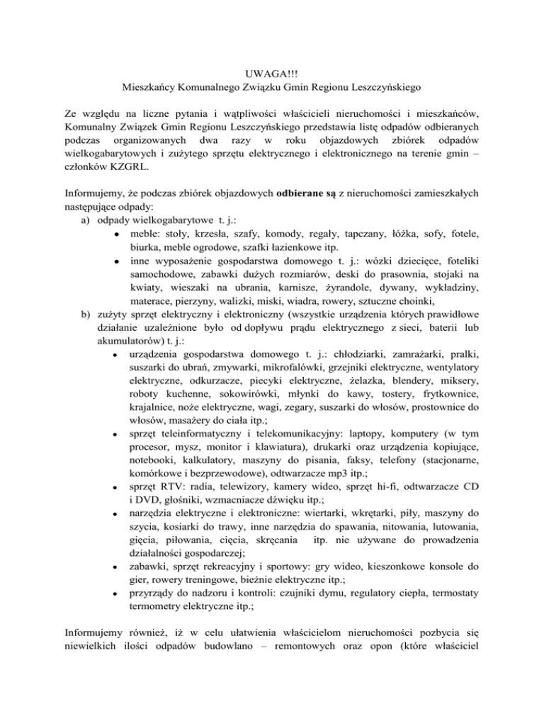 UWAGA!!! Mieszkańcy Komunalnego Związku Gmin Regionu Leszczyńskiego Ze względu na liczne pytania i wątpliwości właścicieli nieruchomości i mieszkańców, Komunalny Związek Gmin Regionu Leszczyńskiego przedstawia listę odpadów odbieranych podczas organizowanych dwa razy w roku objazdowych zbiórek odpadów wielkogabarytowych i zużytego sprzętu elektrycznego i elektronicznego na terenie gmin – członków KZGRL. Informujemy, że podczas zbiórek objazdowych odbierane są z nieruchomości zamieszkałych następujące odpady: a) odpady wielkogabarytowe t. j.: meble: stoły, krzesła, szafy, komody, regały, tapczany, łóżka, sofy, fotele, biurka, meble ogrodowe, szafki łazienkowe itp. inne wyposażenie gospodarstwa domowego t. j.: wózki dziecięce, foteliki samochodowe, zabawki dużych rozmiarów, deski do prasownia, stojaki na kwiaty, wieszaki na ubrania, karnisze, żyrandole, dywany, wykładziny, materace, pierzyny, walizki, miski, wiadra, rowery, sztuczne choinki, b) zużyty sprzęt elektryczny i elektroniczny (wszystkie urządzenia których prawidłowe działanie uzależnione było od dopływu prądu elektrycznego z sieci, baterii lub akumulatorów) t. j.: urządzenia gospodarstwa domowego t. j.: chłodziarki, zamrażarki, pralki, suszarki do ubrań, zmywarki, mikrofalówki, grzejniki elektryczne, wentylatory elektryczne, odkurzacze, piecyki elektryczne, żelazka, blendery, miksery, roboty kuchenne, sokowirówki, młynki do kawy, tostery, frytkownice, krajalnice, noże elektryczne, wagi, zegary, suszarki do włosów, prostownice do włosów, masażery do ciała itp.; sprzęt teleinformatyczny i telekomunikacyjny: laptopy, komputery (w tym procesor, mysz, monitor i klawiatura), drukarki oraz urządzenia kopiujące, notebooki, kalkulatory, maszyny do pisania, faksy, telefony (stacjonarne, komórkowe i bezprzewodowe), odtwarzacze mp3 itp.; sprzęt RTV: radia, telewizory, kamery wideo, sprzęt hi-fi, odtwarzacze CD i DVD, głośniki, wzmacniacze dźwięku itp.; narzędzia elektryczne i elektroniczne: wiertarki, wkrętarki, piły, maszyny do szycia, kosiarki do trawy, inne narzędzia do spawania, nitowania, lutowania, gięcia, piłowania, cięcia, skręcania itp. nie używane do prowadzenia działalności gospodarczej; zabawki, sprzęt rekreacyjny i sportowy: gry wideo, kieszonkowe konsole do gier, rowery treningowe, bieżnie elektryczne itp.; przyrządy do nadzoru i kontroli: czujniki dymu, regulatory ciepła, termostaty termometry elektryczne itp.; Informujemy również, iż w celu ułatwienia właścicielom nieruchomości pozbycia się niewielkich ilości odpadów budowlano – remontowych oraz opon (które właściciel nieruchomości jest zobowiązany przekazywać do Punktu Selektywnego Zbierania Odpadów Komunalnych), w ramach objazdowej zbiórki, bezpośrednio z nieruchomości będą odbierane: wanny, umywalki, muszle toaletowe lub spłuczki, kabiny prysznicowe (nie szklane), brodziki, bidety, baterie łazienkowe (1 sztuka z jednej nieruchomości); opony od samochodów osobowych, rowerów, wózków, motorowerów i motocykli oraz pojazdów o dopuszczalnej masie całkowitej do 3,5 tony, które nie są wykorzystywane do prowadzenia działalności gospodarczej i rolniczej – jednorazowo max 4 sztuki z jednej nieruchomości; ramy i rolety okienne i drzwi - bez szyb (łącznie do 5 sztuk z jednej nieruchomości). Podczas ww. zbiórek nie będą odbierane odpady typu.: odpady zawierające azbest (np. eternit), odpady budowlane i rozbiórkowe (dachówki, deski drewniane, belki, panele, płoty, płytki, grzejniki, kostka brukowa, płyty chodnikowe, cegła, opakowania po farbach i lakierach, folia inne odpady budowlane, części samochodowe (np.: szyby, zderzaki, reflektory, elementy karoserii, fotele i kanapy), opony z pojazdów ciężarowych i maszyn rolniczych, szkło luzem, sprzęt budowlany, urządzenia przemysłowe, motorowery, odzież, świetlówki, baterie i akumulatory, odpady zmieszane. Ponadto informujemy, że zużyty sprzęt elektryczny i elektroniczny można oddać bezpłatnie: w sklepie, w którym kupujemy nowy sprzęt tego samego rodzaju – kupując nowy telewizor oddajemy stary i zepsuty; w punkcie serwisowym; do PSZOK znajdujących się na terenie KZGRL. Lista punktów znajduje się m.in. na stronie internetowej Związku – www.kzgrl.pl w zakładce Odpady; podczas zbiórek organizowanych przez Organizację Odzysku ElektroEko na terenie KZGRL – harmonogramy i sposoby odbioru znajdują się na stronie www.kzgrl.pl w zakładce odpady. UWAGA! Zużyty sprzęt elektryczny i elektroniczny oraz wielkogabaryty pochodzące z nieruchomości niezamieszkałych t.j. wykorzystywanych do działalności gospodarczej, edukacyjnej lub administracyjnej, przyjmowane są między innymi w Zakładzie Zagospodarowania Odpadów w Trzebani (ZZO) lub należących do niego stacji przeładunkowych w Goli i Rawiczu odpłatnie zgodnie z obowiązującym cennikiem w ZZO. Odpady te można także oddać wyspecjalizowanej firmie oferującej usługi odbioru, transportu i przekazania do utylizacji odpadów pochodzących z działalności gospodarczej.
