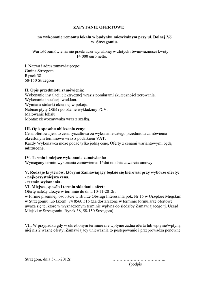 ZAPYTANIE OFERTOWE na wykonanie remontu lokalu w budynku mieszkalnym przy ul. Dolnej 2/6 w Strzegomiu. Wartość zamówienia nie przekracza wyrażonej w złotych równoważności kwoty 14 000 euro netto. I. Nazwa i adres zamawiającego: Gmina Strzegom Rynek 38 58-150 Strzegom II. Opis przedmiotu zamówienia: Wykonanie instalacji elektrycznej wraz z pomiarami skuteczności zerowania. Wykonanie instalacji wod.kan. Wymiana stolarki okiennej w pokoju. Nabicie płyty OSB i położenie wykładziny PCV. Malowanie lokalu. Montaż zlewozmywaka wraz z szafką. III. Opis sposobu obliczenia ceny: Cena ofertowa jest to cena ryczałtowa za wykonanie całego przedmiotu zamówienia określonym terminowo wraz z podatkiem VAT. Każdy Wykonawca może podać tylko jedną cenę. Oferty z cenami wariantowymi będą odrzucone. IV. Termin i miejsce wykonania zamówienia: Wymagany termin wykonania zamówienia: 15dni od dnia zawarcia umowy. V. Rodzaje kryteriów, którymi Zamawiający będzie się kierował przy wyborze oferty: - najkorzystniejsza cena. - termin wykonania . VI. Miejsce, sposób i termin składania ofert: Ofertę należy złożyć w terminie do dnia 10-11-2012r. w formie pisemnej, osobiście w Biurze Obsługi Interesanta pok. Nr 15 w Urzędzie Miejskim w Strzegomiu lub faxem: 74 8560 516 (Za dostarczone w terminie formularze ofertowe uważa się te, które w wyznaczonym terminie wpłyną do siedziby Zamawiającego tj. Urząd Miejski w Strzegomiu, Rynek 38, 58-150 Strzegom). VII. W przypadku gdy w określonym terminie nie wpłynie żadna oferta lub wpłynie/wpłyną niej niż 2 ważne oferty, Zamawiający unieważnia to postępowanie i przeprowadza ponowne. Strzegom, dnia 5-11-2012r. ……………………………….. (podpis Gmina Strzegom Wydział Gospodarki Lokalowej ul. Rynek 38 58-150 Strzegom FORMULARZ ZGŁOSZENIOWY na wykonanie remontu lokalu w budynku mieszkalnym przy ul. Dolnej 2/6 w Strzegomiu. Wypełnia wykonawca: 1. Nazwa i adres wykonawcy: Nazwa …………………………………………………………………………………………………… Adres ……………………………………………………………………………………………………. NIP ……………………………………………………………………………………………………… Nazwa i Nr rachunku bankowego ………………………………………………………………………. …………………………………………………………………………………………………………… 2. Oferuję wykonanie przedmiotu zamówienia za: Cenę netto ………………………………..zł Podatek VAT …………………………….zł Cena brutto ………………………………zł 3. Deklaruję ponadto: 1) termin wykonania zamówienia ……………………...…... 2) okres gwarancji ………………………..………………… 3) warunki płatności : ……………………………………….. IV. Oświadczam, że: 1) zapoznałem się z opisem przedmiotu zamówienia i nie wnoszę do niego zastrzeżeń. 2) w razie wybrania naszej oferty zobowiązujemy się do realizacji zamówienia na warunkach określonych w Formularzu Zapytania z dnia ………….…….. w miejscu i terminie określonym przez zamawiającego. V. Załącznikami do niniejszego formularza stanowiącymi integralną część oferty są: 1. ……………………………………………………….. 2 ............................................................... ……………. 3. ………………………………………………….…… ………………………, dnia ……………….. (podpis wykonawcy)