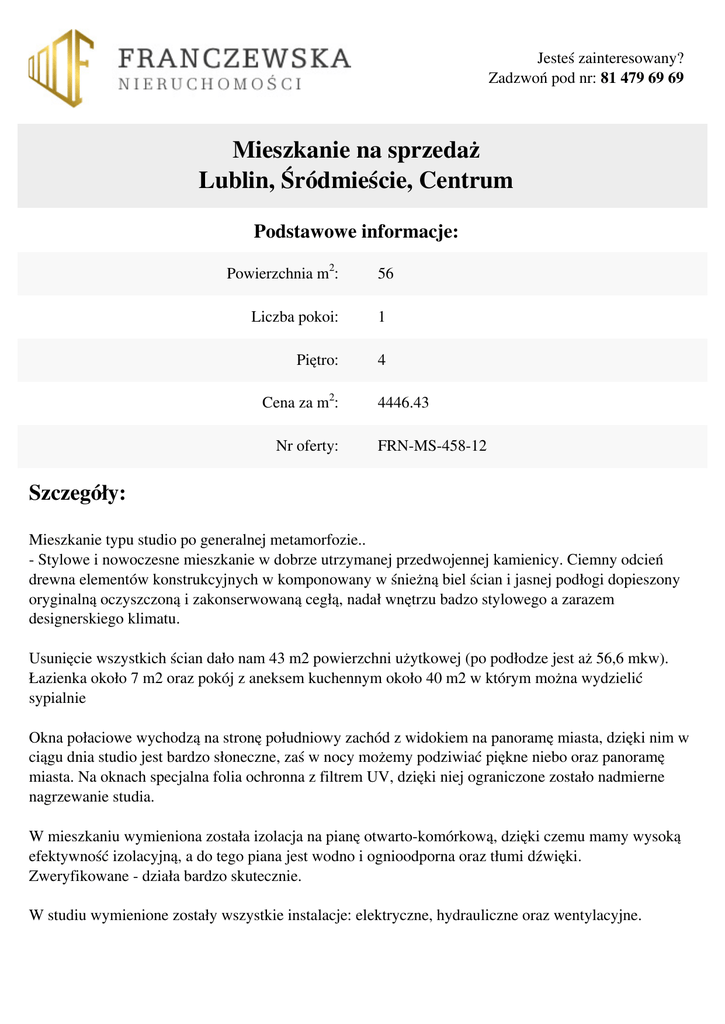 Jesteś zainteresowany? Zadzwoń pod nr: 81 479 69 69 Mieszkanie na sprzedaż Lublin, Śródmieście, Centrum Podstawowe informacje: Powierzchnia m2: 56 Liczba pokoi: 1 Piętro: 4 Cena za m2: Nr oferty: 4446.43 FRN-MS-458-12 Szczegóły: Mieszkanie typu studio po generalnej metamorfozie.. - Stylowe i nowoczesne mieszkanie w dobrze utrzymanej przedwojennej kamienicy. Ciemny odcień drewna elementów konstrukcyjnych w komponowany w śnieżną biel ścian i jasnej podłogi dopieszony oryginalną oczyszczoną i zakonserwowaną cegłą, nadał wnętrzu badzo stylowego a zarazem designerskiego klimatu. Usunięcie wszystkich ścian dało nam 43 m2 powierzchni użytkowej (po podłodze jest aż 56,6 mkw). Łazienka około 7 m2 oraz pokój z aneksem kuchennym około 40 m2 w którym można wydzielić sypialnie Okna połaciowe wychodzą na stronę południowy zachód z widokiem na panoramę miasta, dzięki nim w ciągu dnia studio jest bardzo słoneczne, zaś w nocy możemy podziwiać piękne niebo oraz panoramę miasta. Na oknach specjalna folia ochronna z filtrem UV, dzięki niej ograniczone zostało nadmierne nagrzewanie studia. W mieszkaniu wymieniona została izolacja na pianę otwarto-komórkową, dzięki czemu mamy wysoką efektywność izolacyjną, a do tego piana jest wodno i ognioodporna oraz tłumi dźwięki. Zweryfikowane - działa bardzo skutecznie. W studiu wymienione zostały wszystkie instalacje: elektryczne, hydrauliczne oraz wentylacyjne. Mieszkanie wyposażone m. in. w: * antywłamaniowe drewniane drzwi wejściowe o szer. 100 cm, wyposażone w dwa zamki w systemie jednego klucza z certyfikatem. * zrobiona na zamówienie kuchnia w zabudowie wraz z wysokiej klasy sprzętem AGD * ekonomiczny i inteligentny 100l bojler firmy Ariston * ogrzewanie podłogowe na podczerwień Ścisłe centrum, ale w spokojnej okolicy. Domofon, brama wjazdowa z pilotem na podwórze kamienicy. Lokalizacja świetnie nadaje się na wynajem długo i krótko-terminowy. Szacunkowa stopa wzrostu : od 6,9% do 11,3% netto rocznie. Szacunki po uwzględnieniu czynszu do administracji, ubezpieczeń i podatku od nieruchomości. Ofertę przygotował i prezentuje - Szymon Rubacha, specjalista rynku nieruchomości, tel. 733988090 Chcesz kupić mieszkanie, a ta oferta Cię zainteresowała? Czy wiesz, że zakup nieruchomości to nie tylko spełnienie marzeń i potrzeb, ale pewnie najważniejsza inwestycja Twojego życia? Dlatego bardzo ważne jest bezpieczeństwo i pewność, że kupujesz nieruchomość ze sprawdzonym stanem prawnym. Nie szkoda czasu na przeglądanie setek ofert? My mamy dostęp do baz danych nieruchomości na sprzedaż, dzięki czemu masz pewność, że znajdziemy dla Ciebie ofertę idealnie dopasowaną do Twoich oczekiwań. Tylko jeden dedykowany specjalista przygotuje plan zakupu i zajmie się całym procesem, a doradca finansowy pomoże w uzyskaniu kredytu. Mam pewność, że jeśli zadzwonisz do specjalisty ds. rynku nieruchomości, którego numer znajdziesz poniżej zostawisz swoje sprawy w dobrych rękach. Adrianna Franczewska - Krupa Powyższa oferta nie stanowi oferty w rozumieniu kodeksu cywilnego. Oferta wysłana z systemu Galactica Virgo Powered by TCPDF (www.tcpdf.org)