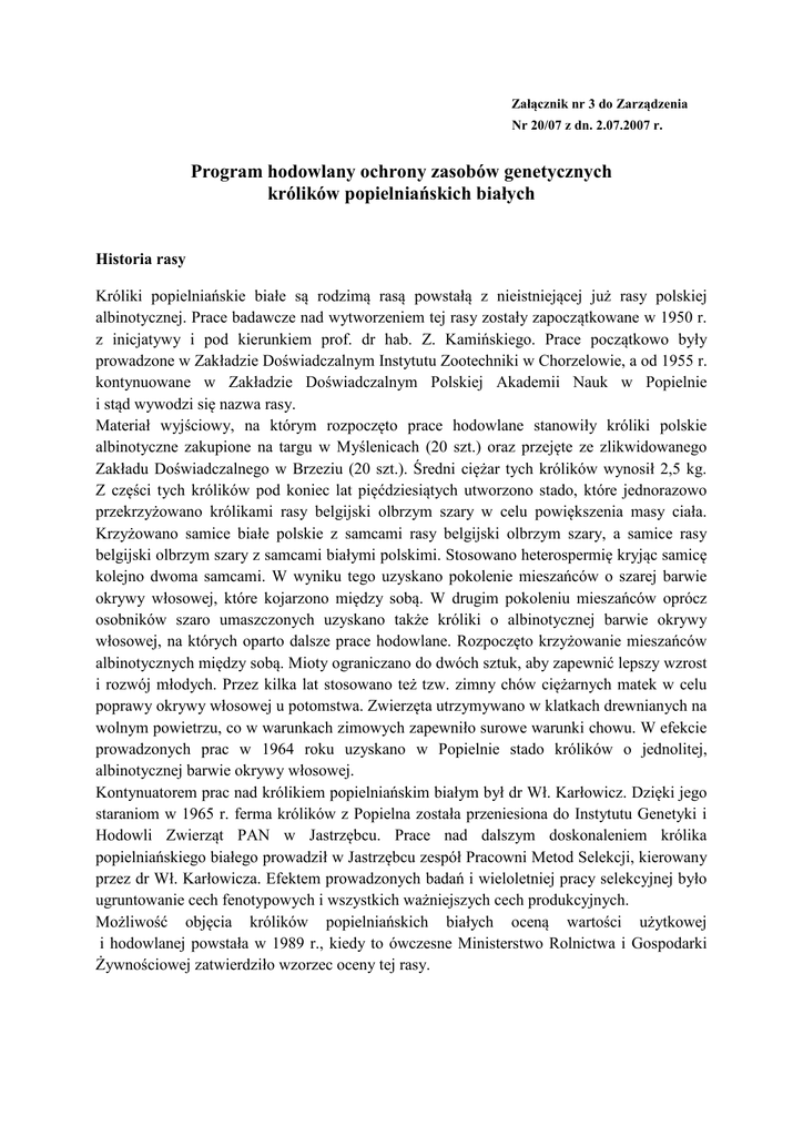 Załącznik nr 3 do Zarządzenia Nr 20/07 z dn. 2.07.2007 r. Program hodowlany ochrony zasobów genetycznych królików popielniańskich białych Historia rasy Króliki popielniańskie białe są rodzimą rasą powstałą z nieistniejącej już rasy polskiej albinotycznej. Prace badawcze nad wytworzeniem tej rasy zostały zapoczątkowane w 1950 r. z inicjatywy i pod kierunkiem prof. dr hab. Z. Kamińskiego. Prace początkowo były prowadzone w Zakładzie Doświadczalnym Instytutu Zootechniki w Chorzelowie, a od 1955 r. kontynuowane w Zakładzie Doświadczalnym Polskiej Akademii Nauk w Popielnie i stąd wywodzi się nazwa rasy. Materiał wyjściowy, na którym rozpoczęto prace hodowlane stanowiły króliki polskie albinotyczne zakupione na targu w Myślenicach (20 szt.) oraz przejęte ze zlikwidowanego Zakładu Doświadczalnego w Brzeziu (20 szt.). Średni ciężar tych królików wynosił 2,5 kg. Z części tych królików pod koniec lat pięćdziesiątych utworzono stado, które jednorazowo przekrzyżowano królikami rasy belgijski olbrzym szary w celu powiększenia masy ciała. Krzyżowano samice białe polskie z samcami rasy belgijski olbrzym szary, a samice rasy belgijski olbrzym szary z samcami białymi polskimi. Stosowano heterospermię kryjąc samicę kolejno dwoma samcami. W wyniku tego uzyskano pokolenie mieszańców o szarej barwie okrywy włosowej, które kojarzono między sobą. W drugim pokoleniu mieszańców oprócz osobników szaro umaszczonych uzyskano także króliki o albinotycznej barwie okrywy włosowej, na których oparto dalsze prace hodowlane. Rozpoczęto krzyżowanie mieszańców albinotycznych między sobą. Mioty ograniczano do dwóch sztuk, aby zapewnić lepszy wzrost i rozwój młodych. Przez kilka lat stosowano też tzw. zimny chów ciężarnych matek w celu poprawy okrywy włosowej u potomstwa. Zwierzęta utrzymywano w klatkach drewnianych na wolnym powietrzu, co w warunkach zimowych zapewniło surowe warunki chowu. W efekcie prowadzonych prac w 1964 roku uzyskano w Popielnie stado królików o jednolitej, albinotycznej barwie okrywy włosowej. Kontynuatorem prac nad królikiem popielniańskim białym był dr Wł. Karłowicz. Dzięki jego staraniom w 1965 r. ferma królików z Popielna została przeniesiona do Instytutu Genetyki i Hodowli Zwierząt PAN w Jastrzębcu. Prace nad dalszym doskonaleniem królika popielniańskiego białego prowadził w Jastrzębcu zespół Pracowni Metod Selekcji, kierowany przez dr Wł. Karłowicza. Efektem prowadzonych badań i wieloletniej pracy selekcyjnej było ugruntowanie cech fenotypowych i wszystkich ważniejszych cech produkcyjnych. Możliwość objęcia królików popielniańskich białych oceną wartości użytkowej i hodowlanej powstała w 1989 r., kiedy to ówczesne Ministerstwo Rolnictwa i Gospodarki Żywnościowej zatwierdziło wzorzec oceny tej rasy. 2 Uzasadnienie konieczności ochrony Wielkość populacji królików popielniańskich białych w 2005 roku wynosiła 78 samic stada podstawowego. Tak niska liczebność populacji tej rodzimej rasy królików, stanowiącej cenny element różnorodności genetycznej tego gatunku, powoduje, że jest ona zagrożona wyginięciem. Cele programu 1) Zachowanie populacji królika popielniańskiego białego i zwiększenie jej liczebności docelowo do minimum 200 szt samic stada podstawowego. 2) Utrzymanie wzorca rasowego oraz specyficznych cech użytkowych takich, jak wysoka płodność i plenność, dobre cechy macierzyńskie, szybkie tempo wzrostu, niskie zużycie paszy. 3) Zachowanie zmienności genetycznej w chronionej populacji. Wzorzec królika popielniańskiego białego [7] masa ciała królika dorosłego: 3,5 - 5,7 kg, masa ciała królika w poszczególnych miesiącach życia: 3 miesiące - 2,5 kg, 4 miesiące - 3,2 kg 5 miesięcy - 3,8 kg 6 miesięcy - 4,0 kg, 7 miesięcy - 4,2 kg , 8 miesięcy - 4,5 kg, budowa ciała: harmonijna budowa ciała, linia grzbietu prosta, tułów walcowaty, dobrze umięśniony o długości 64 cm, zad lekko ścięty; głowa mocno osadzona na krótkiej szyi; kończyny mocne, średnio długie, ogon krótki, przylegający do tułowia, u dorosłych samic (ponad 1 rok) dopuszczalne niewielkie, symetrycznie uformowane podgardle, typ rasowy: głowa lekko wydłużona (średnia długość głowy około 10 cm), uszy delikatne, mocno osadzone, ostro zakończone, średnio owłosione, stojące, długość uszu od 12 cm do 13 cm, barwa okrywy włosowej: barwa włosów pokrywowych jednolicie śnieżnobiała, jakość okrywy włosowej (gęstość, sprężystość, jedwabistość): okrywa włosowa bardzo gęsta i sprężysta, długość włosów pokrywowych od 2,5 cm do 3 cm, specyficzne cechy rasowe (barwa włosów podszyciowych, oczu, pazurków): barwa włosów podszyciowych śnieżnobiała, bez połysku, oczy czerwone, pazurki cieliste. 2 3 Zakres prowadzenia oceny wartości użytkowej zwierząt niezbędny dla realizacji programu Ocena wartości użytkowej królików popielniańskich białych prowadzona będzie łącznie z oceną wartości hodowlanej zgodnie z przepisami obowiązującymi w tym zakresie i będzie obejmowała: 1) użytkowość rozpłodową stada, 2) ocenę fenotypu zwierzęcia dokonywaną w okresie życia zwierzęcia. Ocena użytkowości rozpłodowej będzie obejmowała określenie: 1) liczby samic i samców stada podstawowego na dzień 31 grudnia danego roku kalendarzowego, 2) średniej liczby samic użytkowanych rozpłodowo (suma ilości samic stada podstawowego w poszczególnych miesiącach roku kalendarzowego podzielona przez 12), 3) liczby wszystkich miotów uzyskanych od samic stada podstawowego w danym roku kalendarzowym, 4) liczby młodych urodzonych do dnia 31 grudnia danego roku kalendarzowego, 5) liczby odchowanych młodych z urodzeń do dnia 31 grudnia danego roku kalendarzowego, 6) średniej liczby miotów uzyskanych od jednej samicy (liczba wszystkich miotów uzyskanych od samic stada podstawowego podzielona przez średnią l