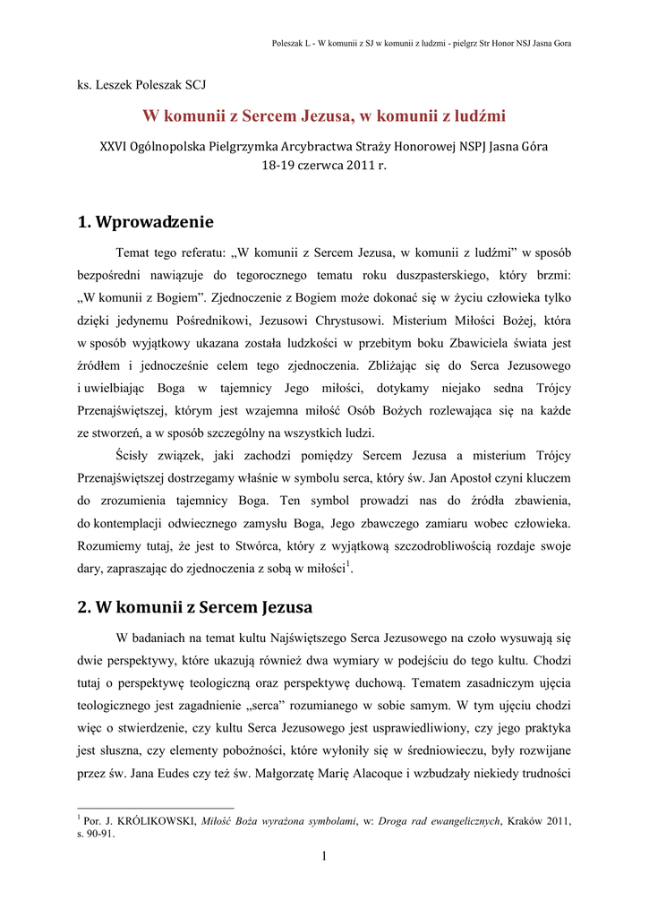 Poleszak L - W komunii z SJ w komunii z ludzmi - pielgrz Str Honor NSJ Jasna Gora ks. Leszek Poleszak SCJ W komunii z Sercem Jezusa, w komunii z ludźmi XXVI Ogólnopolska Pielgrzymka Arcybractwa Straży Honorowej NSPJ Jasna Góra 18-19 czerwca 2011 r. 1. Wprowadzenie Temat tego referatu: „W komunii z Sercem Jezusa, w komunii z ludźmi” w sposób bezpośredni nawiązuje do tegorocznego tematu roku duszpasterskiego, który brzmi: „W komunii z Bogiem”. Zjednoczenie z Bogiem może dokonać się w życiu człowieka tylko dzięki jedynemu Pośrednikowi, Jezusowi Chrystusowi. Misterium Miłości Bożej, która w sposób wyjątkowy ukazana została ludzkości w przebitym boku Zbawiciela świata jest źródłem i jednocześnie celem tego zjednoczenia. Zbliżając się do Serca Jezusowego i uwielbiając Boga w tajemnicy Jego miłości, dotykamy niejako sedna Trójcy Przenajświętszej, którym jest wzajemna miłość Osób Bożych rozlewająca się na każde ze stworzeń, a w sposób szczególny na wszystkich ludzi. Ścisły związek, jaki zachodzi pomiędzy Sercem Jezusa a misterium Trójcy Przenajświętszej dostrzegamy właśnie w symbolu serca, który św. Jan Apostoł czyni kluczem do zrozumienia tajemnicy Boga. Ten symbol prowadzi nas do źródła zbawienia, do kontemplacji odwiecznego zamysłu Boga, Jego zbawczego zamiaru wobec człowieka. Rozumiemy tutaj, że jest to Stwórca, który z wyjątkową szczodrobliwością rozdaje swoje dary, zapraszając do zjednoczenia z sobą w miłości1. 2. W komunii z Sercem Jezusa W badaniach na temat kultu Najświętszego Serca Jezusowego na czoło wysuwają się dwie perspektywy, które ukazują również dwa wymiary w podejściu do tego kultu. Chodzi tutaj o perspektywę teologiczną oraz perspektywę duchową. Tematem zasadniczym ujęcia teologicznego jest zagadnienie „serca” rozumianego w sobie samym. W tym ujęciu chodzi więc o stwierdzenie, czy kultu Serca Jezusowego jest usprawiedliwiony, czy jego praktyka jest słuszna, czy elementy pobożności, które wyłoniły się w średniowieczu, były rozwijane przez św. Jana Eudes czy też św. Małgorzatę Marię Alacoque i wzbudzały niekiedy trudności 1 Por. J. KRÓLIKOWSKI, Miłość Boża wyrażona symbolami, w: Droga rad ewangelicznych, Kraków 2011, s. 90-91. 1 Poleszak L - W komunii z SJ w komunii z ludzmi - pielgrz Str Honor NSJ Jasna Gora teologiczne, powinny być dalej obecne w świadomości i praktyce wiernych. Zasadniczym pytaniem, które się w tym ujęciu wyłania, jak podkreśla znakomity badacz tego kultu ks. Charles André Bernard jest pytanie „dlaczego w kulcie adoracji Chrystusa, należy dać uprzywilejowane miejsce szczególnemu organowi, jakim jest serce?”2. Zupełnie inne podejście reprezentuje perspektywa duchowa, w której to pytanie nie ma takiego znaczenia. W perspektywie duchowej akcent zostaje położony na kontemplację przebitego boku Jezusa Chrystusa, na wpatrywanie się w „Tego, którego przebili” (Za 12, 10). Święty Jan Apostoł, który jako jedyny opisuje scenę przebicia boku Jezusa, nie ogranicza się do zarejestrowania faktów. Wyjątkowe podkreślenie autentyczności wydarzenia oraz jego historyczności stanowi dla niego bazę dla wskazania na symbol, sakrament, który ukazuje rzeczywistość przekraczającą świat ludzkiego poznania3. Oto zapis Janowy: „Gdy podeszli do Jezusa i zobaczyli, że już umarł, nie łamali Mu goleni, tylko jeden z żołnierzy włócznią przebił Mu bok i natychmiast wypłynęła krew i woda. Zaświadczył to ten, który widział, a świadectwo jego jest prawdziwe. On wie, że mówi prawdę, abyście i wy wierzyli. Stało się to bowiem, aby się wypełniło Pismo: «Kość jego nie będzie złamana». I znowu na innym miejscu mówi Pismo: «Będą patrzeć na Tego, którego przebili»” (J 19, 33-37)4. Perspektywa teologiczna i duchowa w podejściu do kultu Najświętszego Serca Jezusowego wyraźnie się od siebie różnią. O ile w pierwszej podkreśla się konieczność usprawiedliwienia różnych aspektów kultu, o tyle w drugiej uwypuklone zostają różne elementy symboliki użytej przez św. Jana Apostoła, takie jak: rana, bok, krew, woda, krzyż, który przyciąga wzrok, Baranek, którego kości nie zostaną złamane. Symbole te pozwalają odkryć niezmierzone bogactwo treści, jaka się kryje w scenie przebicia boku Jezusa Chrystusa. Wiemy, że istotne są oba sposoby odniesienia się do kultu Bożego Serca, ponieważ obydwa pomagają nam zrozumieć jego istotę, znaczenie oraz trwałą aktualność. Ponieważ nasz temat dotyczy zagadnienia zjednoczenia z Sercem Jezusa, skoncentrujemy się tutaj bardziej na ujęciu duchowym, które pozwala odkryć misterium Serca Chrystusa, ściśle powiązane z misterium paschalnym. Rozważając tę prawdę, zarówno 2 Ch. A.BERNARD, Il Cuore di Cristo e i suoi simboli, Roma 1982, s. 12. Por. L. POLESZAK, Serce Zbawiciela. Kult Najświętszego Serca Jezusowego w Zgromadzeniu Księży Najświętszego Serca Jezusowego (1878-2009), Kraków 2011, s. 101. 4 Opis przebicia boku poprzedza scena ukrzyżowania (Por. J 19, 25-30). Występujące tam słowo „Pragnę” (J 19, 28) często jest odnoszone przez egzegetów do pragnienia miłości i wiązane z tekstem paralelnym J 7, 37-39. Szczegółową egzegezę można znaleźć w: M.-D. PHILIPPE, Pragnę. Rozważania o mądrości krzyża, Poznań 1999, s. 11-236; I. DE LA POTTERIE, Il mistero del cuore trafitto. Fondamenti biblici della spiritualità del Cuore di Gesù, Bologna 1988, s. 17-39. 121-136; J. SERVAIS, „Ho sete”. La testimonianza del discepolo dell’amore, w: Il Cuore di Cristo luce e forza. In onore di San Claudio La Colombière. Simposio organizzato dall’Istituto di Spiritualità dell’Università Gregoriana. Roma 21-24 aprile 1993, red. Ch. A. Bernard, Roma 1995, s. 249-270. 3 2 Poleszak L - W komunii z SJ w komunii z ludzmi - pielgrz Str Honor NSJ Jasna Gora Magisterium Kościoła, jak też teologowi