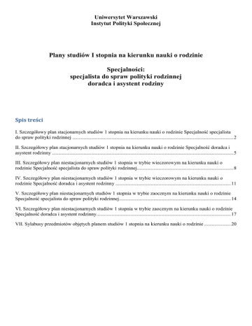 Uniwersytet Warszawski Instytut Polityki Społecznej Plany studiów I stopnia na kierunku nauki o rodzinie Specjalności: specjalista do spraw polityki rodzinnej doradca i asystent rodziny Spis treści I. Szczegółowy plan stacjonarnych studiów 1 stopnia na kierunku nauki o rodzinie Specjalność specjalista do spraw polityki rodzinnej ............................................................................................................................... 2 II. Szczegółowy plan stacjonarnych studiów 1 stopnia na kierunku nauki o rodzinie Specjalność doradca i asystent rodzinny ............................................................................................................................................... 5 III. Szczegółowy plan niestacjonarnych studiów 1 stopnia w trybie wieczorowym na kierunku nauki o rodzinie Specjalność specjalista do spraw polityki rodzinnej............................................................................ 8 IV. Szczegółowy plan niestacjonarnych studiów 1 stopnia w trybie wieczorowym na kierunku nauki o rodzinie Specjalność doradca i asystent rodzinny ........................................................................................... 11 V. Szczegółowy plan niestacjonarnych studiów 1 stopnia w trybie zaocznym na kierunku nauki o rodzinie Specjalność specjalista do spraw polityki rodzinnej ........................................................................................ 14 VI. Szczegółowy plan niestacjonarnych studiów 1 stopnia w trybie zaocznym na kierunku nauki o rodzinie Specjalność doradca i asystent rodzinny.......................................................................................................... 17 VII. Sylabusy przedmiotów objętych planem studiów 1 stopnia na kierunku nauki o rodzinie ..................... 20 I. Szczegółowy plan stacjonarnych studiów 1 stopnia na kierunku nauki o rodzinie Specjalność specjalista do spraw polityki rodzinnej I semestr Liczba punktów Wykład Ćwiczenia Konwersatorium ECTS 30 3 30 2 4 1 4 1 30 6 30 5 60 1 30 4 30 1 90 6 Forma zaliczenia zal/o zal/o Przedmiot Podstawy prawa Technologia informacyjna Ochrona własności intelektualnej BHP Pedagogika Wprowadzenie do psychologii WF* Filozofia Język obcy Przedmioty do wyboru * Fakultatywnie 30 Łączna liczba godzin: 338 Łączna liczba punktów ECTS: 30 zal zal e e zal e Zal/o zal/o II semestr Liczba punktów Wykład Ćwiczenia Konwersatorium ECTS 30 3 30 3 30 30 6 60 1 30 1 30 3 90 6 30 3 30 4 Przedmiot Seksuologia Kwestie społeczne w życiu rodziny Psychologia rodziny WF* Język obcy Polityka społeczna Przedmioty do wyboru Etyka Socjologia * Fakultatywnie 30 Łączna liczba godzin: 390 Łączna liczba punktów ECTS: 30 Forma zaliczenia zal/o zal/o e zal Zal/o zal/o zal/o e e III semestr Przedmiot Socjologia rodziny Finanse gospodarstwa domowego Demografia społeczna Przedmioty do wyboru Wybrane zagadnienia prawa cywilnego i rodzinnego Język obcy Gerontologia społeczna Liczba punktów Wykład Ćwiczenia Konwersatorium ECTS 30 30 6 30 4 30 90 30 30 30 Forma zaliczenia e zal/o 3 6 3 zal/o zal/o zal/o 1 3 Zal/o zal/o Polityka społeczna wobec rodziny Łączna liczba godzin: 330 Łączna liczba punktów ECTS: 30 30 4 e IV semestr Liczba punktów Wykład Ćwiczenia Konwersatorium ECTS 30 2 30 2 30 30 5 90 6 30 2 30 1 2 30 2 30 15 3 4 tygodnie 5 Przedmiot Prawo administracyjne* Zarządzanie publiczne* Metody i techniki badań społecznych Przedmioty do wyboru Zabezpieczenie społeczne Język obcy Język obcy Patologia społeczna i resocjalizacja Praca socjalna i służby społeczne Praktyki zawodowe * przedmioty specjalnościowe Łączna liczba godzin: 345 Łączna liczba punktów ECTS: 30 Forma zaliczenia zal/o zal/o e zal/o e Zal/o e zal/o e Zal/o V semestr Przedmiot Współpraca międzysektorowa* Podstawy zarządzania* Polityka rynku pracy Przedmioty do wyboru Równouprawnienie i dyskryminacja Pomoc społeczna i wsparcie rodziny Seminarium dyplomowe *przedmioty specjalnościowe Łączna liczba godzin: 255 Łączna liczba punktów ECTS: 30 Liczba punktów Wykład Ćwiczenia Konwersatorium ECTS 15 2 30 4 30 4 90 6 30 3 30 6 30 5 Forma zaliczenia zal/o e zal/o zal/o zal/o e zal VI semestr Przedmiot Public relations i marketing społeczny* Przedmioty do wyboru Finansowanie polityki rodzinnej* Seminarium dyplomowe Europejska i porównawcza polityka rodzinna III sektor w polityce rodzinnej Rehabilitacja społeczna i zawodowa osób niepełnosprawnych *przedmioty specjalnościowe Liczba punktów Wykład Ćwiczenia Konwersatorium ECTS 30 4 90 6 30 4 30 5 30 5 15 15 3 3 Forma zaliczenia zal/o zal/o zal/o zal/o e zal/o zal/o Łączna liczba godzin: 240 Łączna liczba punktów ECTS: 30 Łącznie dla całego planu liczba godzin: 1898 Łącznie dla całego planu liczba punktów ECTS: 180 II. Szczegółowy plan stacjonarnych studiów 1 stopnia na kierunku nauki o rodzinie Specjalność doradca i asystent rodzinny I semestr Liczba punktów Wykład Ćwiczenia Konwersatorium ECTS 30 3 30 2 4 1 4 1 30 6 30 5 60 1 30 4 30 1 90 6 Forma zaliczenia zal/o zal/o Przedmiot Podstawy prawa Technologia informacyjna Ochrona własności intelektualnej BHP Pedagogika Wprowadzenie do psychologii WF* Filozofia Język obcy Przedmioty do wyboru * Fakultatywnie 30 Łączna liczba godzin: 338 Łączna liczba punktów ECTS: 31 zal/o zal e e zal e zal/o zal/o II semestr Liczba punktów Wykład Ćwiczenia Konwersatorium ECTS 30 3 30 3 30 30 6 60 1 30 1 30 3 90 6 30 3 30 4 Przedmiot Seksuologia Kwestie społeczne w życiu rodziny Psychologia rodziny WF* Język obcy Polityka społeczna Przedmioty do wyboru Etyka Socjologia * Fakultatywnie 30 Łączna liczba godzin: 390 Łączna liczba punktów ECTS: 30 Forma zaliczenia zal/o zal/o e zal Zal/o zal/o zal/o e e III semestr Przedmiot Socjologia rodziny Finanse gospodarstwa domowego Demografia społeczna Przedmioty do wyboru Wybrane zagadnienia prawa cywilnego i rodzinnego Język obcy 