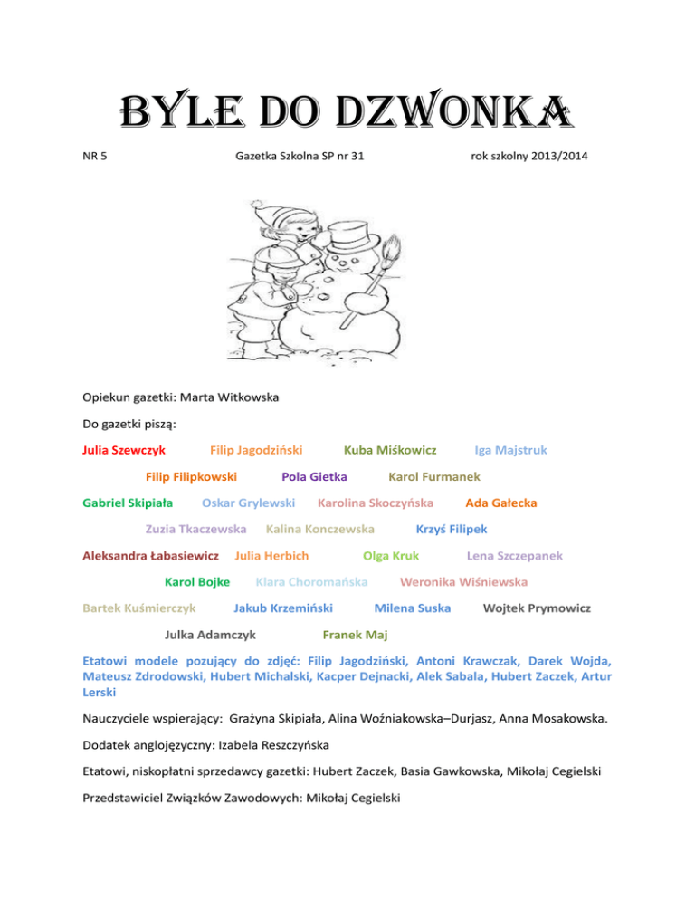 BYLE DO DZWONKA NR 5 Gazetka Szkolna SP nr 31 rok szkolny 2013/2014 Opiekun gazetki: Marta Witkowska Do gazetki piszą: Julia Szewczyk Filip Jagodziński Filip Filipkowski Gabriel Skipiała Pola Gietka Oskar Grylewski Zuzia Tkaczewska Aleksandra Łabasiewicz Karol Bojke Bartek Kuśmierczyk Kuba Miśkowicz Karol Furmanek Karolina Skoczyńska Kalina Konczewska Julia Herbich Klara Choromańska Julka Adamczyk Ada Gałecka Krzyś Filipek Olga Kruk Jakub Krzemiński Iga Majstruk Lena Szczepanek Weronika Wiśniewska Milena Suska Wojtek Prymowicz Franek Maj Etatowi modele pozujący do zdjęć: Filip Jagodziński, Antoni Krawczak, Darek Wojda, Mateusz Zdrodowski, Hubert Michalski, Kacper Dejnacki, Alek Sabala, Hubert Zaczek, Artur Lerski Nauczyciele wspierający: Grażyna Skipiała, Alina Woźniakowska–Durjasz, Anna Mosakowska. Dodatek anglojęzyczny: Izabela Reszczyńska Etatowi, niskopłatni sprzedawcy gazetki: Hubert Zaczek, Basia Gawkowska, Mikołaj Cegielski Przedstawiciel Związków Zawodowych: Mikołaj Cegielski Z CYKLU SAVOIR VIVRE: @- mail Pamiętaj, aby twoje maile były krótkie i zwięzłe. Zanim klikniesz „wyślij”, przeczytaj, co napisałeś. Unikaj korzystania z WIELKICH LITER. Jeśli dostajesz maila od kogoś, kto używa polskich znaków, to ty też ich użyj. Pisząc oficjalne maile ogranicz korzystanie z uśmieszków i emotikonek. Nie wstawiaj flag i wykrzykników w każdym mailu. Zawsze wpisuj temat maila. E-maile możesz zaczynać klasycznie, używając zwrotu „Szanowy/na Pan/Pani“. Unikaj zwrotów w stylu „Siema“, i „Hejka“. Filip Jagodziński, kl. IV c TURNIEJ PING- PONGA W LICZBACH W turnieju brało udział 43 zawodników z klas III. W turnieju uczestniczyło 7 dziewczynek i 36 chłopców. Rozegraliśmy 725 meczy. Rozegraliśmy 1456 setów. Spędziliśmy przy stołach ping- pongowych 96 godzin. Zużyliśmy 2 opakowania piłeczek (ok. 12 sztuk) Zwycięzca rocznika 2004 rozegrał 26 meczy. Półfinaliści rozegrali po 25 meczy. Ćwiećfinalisci rozegrali po 24 mecze. Zwycięzcy rocznika 2004: I miejsce - Artur Sztandera II miejsce - Mikołaj Skirmuntt III miejsce - Bartosz Sulejewski Zwycięzcy rocznika 2005: I miejsce - Julian Rejman II miejsce - Jakub Suchocki III miejsce - Jakub Długosz Łukasz Stefański Z CYKLU: PRZEPISY JULKI Tajska zupa curry z mlekiem kokosowym, dorszem i owocami morza. Składniki dla dwóch osób: 2 łyżeczki oleju kokosowego lub innego roślinnego 2 łyżeczki tajskiej pasty curry (najlepiej czerwonej) 1 łyżeczka tartego imbiru 250 ml bulionu 200 ml (1/2 puszki) mleka kokosowego 200 g filetu z dorsza (może być mrożony) lub innej ryby o białym mięsie bez skóry i kości 150 g mieszanki owoców morza (może być mrożona) lub wybranych np. krewetek, małży lub pierścieni kalmarów 1 łyżeczka soku z limonki 1 łyżeczka cukru trzcinowego 1 łyżeczka sosu rybnego sól do smaku 1 czerwona papryczka chili świeża lub suszona + mielona papryka ostra do smaku Do podania: ryż jaśminowy, ugotowany w osolonej wodzie kolendra do posypania Przygotowanie: Rybę i owoce morza rozmrozić jeśli były zamrożone. W garnku podgrzać olej, dodać pastę curry i smażyć ją ok. 1-2 minuty (garnek można pokryć, aby nie pryskało). Dodać imbir, wlać bulion, mleko kokosowe i zagotować. W międzyczasie dodać sok z limonki, cukier i sos rybny. Gotować przez 3 minuty. Do lekko gotującego się wywaru włożyć pokrojone filety i owoce morza. Gotować bez przykrycia na małym ogniu przez ok. 5 minut dodając sól do smaku. Możemy dodać papryczkę chili i mieloną chili do smaku. Podawać z ryżem i kolendrą. Julka Szewczyk, kl. III a Kiermasz na rzecz Wielkiej Orkiestry Świątecznej Pomocy W dniach 14.01.2014 r. i 15.01.2014 r. odbył się kiermasz, na którym wystawione zostały prace dzieci z klas I-III, które napłynęły z dwunastu szkół z różnych dzielnic na Warszawski Międzyświetlicowy Konkurs Plastyczny „Najpiękniejszy aniołek z masy solnej – druga edycja”. Zebrano 500 zł. Kwota ta zasiliła konto Wielkiej Orkiestry Świątecznej Pomocy. Serdecznie dziękuję dzieciom za pomoc w zorganizowaniu kiermaszu, a Rodzicom za hojność. Grażyna Skipiała KĄCIK LITERACKI Kradzież? Dzień w szkole zapowiadał się jak zwykle. Nie do końca rozbudzony, przekroczyłem próg klasy. Pierwsza miała być matematyka. Ku mojemu zdziwieniu w klasie już czekała na nas pani wychowawczyni. Mimo niewyspania, zauważyłem, że nie miała zadowolonej miny. Po paru słowach wstępu pani oznajmiła nam dość zaskakującą wiadomość. Wyjaśniła nam, co się stało. Obok niej siedziała zapłakana Marta, skarbnik z naszej klasy. Pieniądze, które uzbierała od początku roku zostały skradzione. Wywnioskowaliśmy, że złodziej musi być wśród nas. Od samego nie mogłem w to uwierzyć. Znam koleżanki i kolegów już siedem lat i nigdy bym nie podejrzewał nikogo o zapędy złodziejskie. Trudno było mi się z tym pogodzić. Postanowiłem pomóc rozwikłać zagadkę i odzyskać pieniądze klasy. Miałem dużo szczęścia, bo na przerwie w stołówce minąłem Adasia, starszego kolegę ze zdolnościami detektywistycznymi. Udało mi się go namówić, żeby spróbował rozwiązać problem. Resztę przerw w szkole spędziliśmy na wyjaśnieniu Adasiowi ile pieniędzy zginęło i skąd. Adaś krok po kroku pozbierał w całość wszystkie informacje, które od nas otrzymał. Marta dość nierozważnie, bez żadnego zabezpieczenia, wkładała zebrane pieniądze zwyczajnie w kieszeń swojego plecaka zapinaną na suwak. Marta przechowywała pieniądze w plecaku, bo uważała, że to dobre miejsce. Nigdy nie zdradziła nikomu, gdzie je chowa. Cały dzień w szkole był bardzo pracowity. Wszyscy byli zmęczeni i przejęci sytuacją, w której znalazła się klasa. Liczyliśmy na pomoc Adasia. On obiecał, że zajmie się tym, tylko teraz musi odwiedzić babcię, która miała mu zaszyć dziurę w ulubionych spodniach. Już kładłe