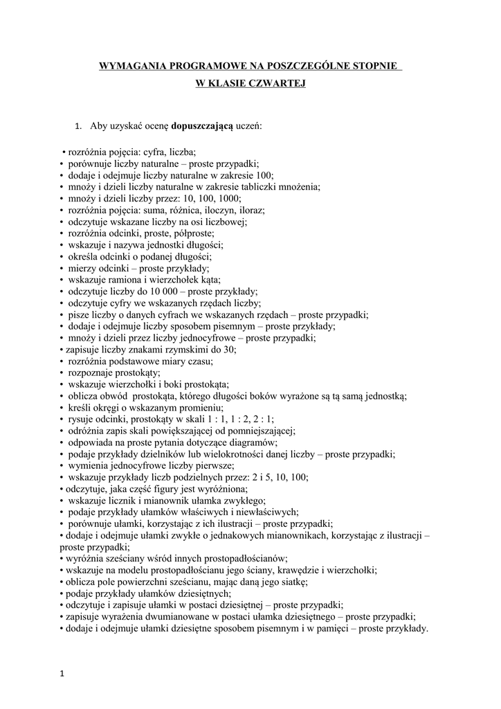 WYMAGANIA PROGRAMOWE NA POSZCZEGÓLNE STOPNIE W KLASIE CZWARTEJ 1. Aby uzyskać ocenę dopuszczającą uczeń: • rozróżnia pojęcia: cyfra, liczba; • porównuje liczby naturalne – proste przypadki; • dodaje i odejmuje liczby naturalne w zakresie 100; • mnoży i dzieli liczby naturalne w zakresie tabliczki mnożenia; • mnoży i dzieli liczby przez: 10, 100, 1000; • rozróżnia pojęcia: suma, różnica, iloczyn, iloraz; • odczytuje wskazane liczby na osi liczbowej; • rozróżnia odcinki, proste, półproste; • wskazuje i nazywa jednostki długości; • określa odcinki o podanej długości; • mierzy odcinki – proste przykłady; • wskazuje ramiona i wierzchołek kąta; • odczytuje liczby do 10 000 – proste przykłady; • odczytuje cyfry we wskazanych rzędach liczby; • pisze liczby o danych cyfrach we wskazanych rzędach – proste przypadki; • dodaje i odejmuje liczby sposobem pisemnym – proste przykłady; • mnoży i dzieli przez liczby jednocyfrowe – proste przypadki; • zapisuje liczby znakami rzymskimi do 30; • rozróżnia podstawowe miary czasu; • rozpoznaje prostokąty; • wskazuje wierzchołki i boki prostokąta; • oblicza obwód prostokąta, którego długości boków wyrażone są tą samą jednostką; • kreśli okręgi o wskazanym promieniu; • rysuje odcinki, prostokąty w skali 1 : 1, 1 : 2, 2 : 1; • odróżnia zapis skali powiększającej od pomniejszającej; • odpowiada na proste pytania dotyczące diagramów; • podaje przykłady dzielników lub wielokrotności danej liczby – proste przypadki; • wymienia jednocyfrowe liczby pierwsze; • wskazuje przykłady liczb podzielnych przez: 2 i 5, 10, 100; • odczytuje, jaka część figury jest wyróżniona; • wskazuje licznik i mianownik ułamka zwykłego; • podaje przykłady ułamków właściwych i niewłaściwych; • porównuje ułamki, korzystając z ich ilustracji – proste przypadki; • dodaje i odejmuje ułamki zwykłe o jednakowych mianownikach, korzystając z ilustracji – proste przypadki; • wyróżnia sześciany wśród innych prostopadłościanów; • wskazuje na modelu prostopadłościanu jego ściany, krawędzie i wierzchołki; • oblicza pole powierzchni sześcianu, mając daną jego siatkę; • podaje przykłady ułamków dziesiętnych; • odczytuje i zapisuje ułamki w postaci dziesiętnej – proste przypadki; • zapisuje wyrażenia dwumianowane w postaci ułamka dziesiętnego – proste przypadki; • dodaje i odejmuje ułamki dziesiętne sposobem pisemnym i w pamięci – proste przykłady. 1 2. Aby uzyskać ocenę dostateczną uczeń musi spełnić wszystkie warunki do uzyskania oceny dopuszczającej oraz uczeń: • dodaje, odejmuje, mnoży i dzieli liczby naturalne w zakresie 1000 – proste przykłady; • zmienia kolejność składników w dodawaniu i czynników w mnożeniu, by ułatwić obliczenia; • mnoży liczby w przypadkach typu 40 ・30; • dzieli liczby w przypadkach typu 1200 : 60; • rozwiązuje proste zadania z zastosowaniem porównywania różnicowego i ilorazowego; • zaznacza liczby na osi liczbowej przy danej jednostce; • zapisuje iloczyn jednakowych czynników w postaci potęgi; • zapisuje potęgi w postaci iloczynu – proste przypadki; • oblicza wartości potęg o podstawie i wykładniku naturalnym – proste przykłady; • oblicza wartości wyrażeń arytmetycznych (dwa, trzy działania); • stosuje kalkulator w niektórych obliczeniach; • szacuje wyniki prostych obliczeń; • rozwiązuje proste zadania zamknięte i otwarte w zakresie czterech działań; • wyróżnia punkty należące i nienależące do prostej; • nazywa proste, półproste i odcinki; • rozpoznaje proste prostopadłe i równoległe; • kreśli odcinki, proste równoległe i prostopadłe na kratkowanym papierze; • mierzy i porównuje odcinki; • rozróżnia kąty ostre, proste i rozwarte; • rysuje kąty ostre, proste i rozwarte; • odczytuje i nazywa kąty; • mierzy kąty za pomocą kątomierza i rysuje kąty o danej mierze; • czyta liczby do 100 000 zapisane w dziesiątkowym systemie pozycyjnym i pisze je słowami • odczytuje duże liczby zaznaczone na osi liczbowej; • zaznacza na osi liczbowej liczby naturalne; • wykonuje dzielenie z resztą i sprawdza je za pomocą mnożenia – proste przykłady; • stosuje algorytmy działań pisemnych; • rozwiązuje proste zadania tekstowe z zastosowaniem obliczeń pisemnych i pamięciowych; • rozwiązuje proste zadania dotyczące porównywania różnicowego i ilorazowego z zastosowaniem działań pisemnych; • zapisuje wieki, numery rozdziałów za pomocą znaków rzymskich; • posługuje się podstawowymi miarami czasu; • rysuje prostokąty i kwadraty o podanych wymiarach; • kreśli przekątne prostokąta; • opisuje własności kwadratu i prostokąta; • porównuje boki prostokąta za pomocą cyrkla; • wskazuje środek, promień, średnicę i cięciwę w kole oraz w okręgu; • wypełnia prostokąty kwadratami jednostkowymi; • podaje zależności między jednostkami pola – proste przypadki; • oblicza pole prostokąta, gdy dane są długości boków wyrażone jednakowymi jednostkami; • rysuje odcinki, kwadraty i prostokąty w skali; • rysuje w skali okręgi o danej długości promienia lub średnicy; • odczytuje z mapy lub planu rzeczywiste odległości między miastami lub obiektami – proste przypadki; • podaje przykłady skali powiększającej lub pomniejszającej; 2 • odczytuje dane z prostych diagramów obrazkowych lub słupkowych; • przedstawia dane na diagramach obrazkowych – proste przypadki; • wybiera z dowolnego zbioru dzielniki lub wielokrotności danej liczby – proste przypadki; • podaje przykłady dzielników lub wielokrotności danej liczby; • podaje jednocyfrowe i dwucyfrowe przykłady liczb pierwszych; • rozróżnia liczby pierwsze i liczby złożone; • podaje przykłady liczb podzielnych przez: 2, 5, 