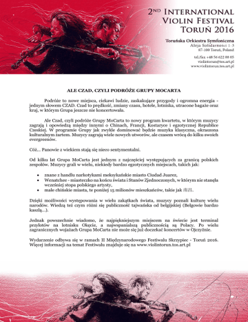 ALE CZAD, CZYLI PODRÓŻE GRUPY MOCARTA Podróże to nowe miejsca, ciekawi ludzie, zaskakujące przygody i ogromna energia jednym słowem CZAD. Czad to prędkość, zmiany czasu, hotele, lotniska, utracone bagaże oraz kraj, w którym Grupa jeszcze nie koncertowała. Ale Czad, czyli podróże Grupy MoCarta to nowy program kwartetu, w którym muzycy zagrają i opowiedzą między innymi o Chinach, Francji, Kostaryce i egzotycznej Republice Czeskiej. W programie Grupy jak zwykle dominować będzie muzyka klasyczna, okraszona kulturalnym żartem. Muzycy zagrają wiele nowych utworów, ale czasem wrócą do kilku swoich evergreenów. Cóż... Panowie z wiekiem stają się nieco sentymentalni. Od kilku lat Grupa MoCarta jest jednym z najczęściej występujących za granicą polskich zespołów. Muzycy grali w wielu, niekiedy bardzo egzotycznych miejscach, takich jak: znane z handlu narkotykami meksykańskie miasto Ciudad Juarez, Wenatchee - miasteczko na końcu świata i Stanów Zjednoczonych, w którym nie stanęła wcześniej stopa polskiego artysty, małe chińskie miasta, te poniżej 15 milionów mieszkańców, takie jak 南昌. Dzięki możliwości występowania w wielu zakątkach świata, muzycy poznali kulturę wielu narodów. Wiedzą też czym różni się publiczność tajwańska od belgijskiej (Belgowie bardzo kaszlą...). Jednak powszechnie wiadomo, że najpiękniejszym miejscem na świecie jest terminal przylotów na lotnisku Okęcie, a najwspanialszą publicznością są Polacy. Po wielu zagranicznych wojażach Grupa MoCarta nie może się już doczekać koncertów w Ojczyźnie. Wydarzenie odbywa się w ramach II Międzynarodowego Festiwalu Skrzypiec - Toruń 2016. Więcej informacji na temat Festiwalu znajduje się na www.violintorun.tos.art.pl