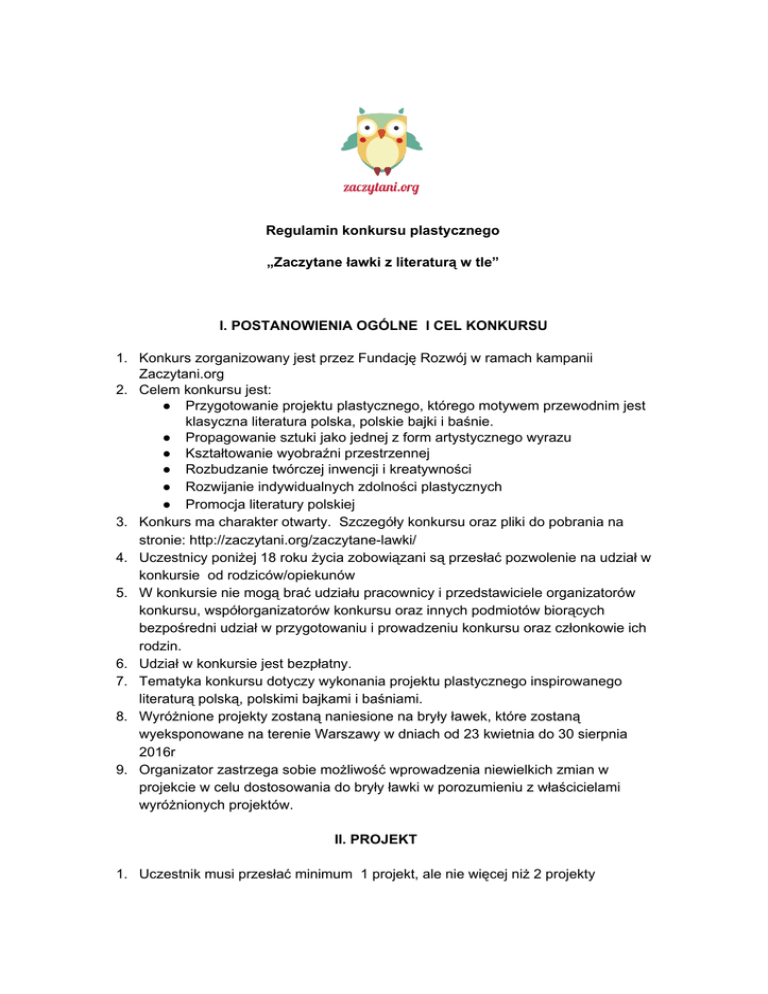 Regulamin konkursu plastycznego „Zaczytane ławki z literaturą w tle” I. POSTANOWIENIA OGÓLNE I CEL KONKURSU 1. Konkurs zorganizowany jest przez Fundację Rozwój w ramach kampanii Zaczytani.org 2. Celem konkursu jest: ● Przygotowanie projektu plastycznego, którego motywem przewodnim jest klasyczna literatura polska, polskie bajki i baśnie. ● Propagowanie sztuki jako jednej z form artystycznego wyrazu ● Kształtowanie wyobraźni przestrzennej ● Rozbudzanie twórczej inwencji i kreatywności ● Rozwijanie indywidualnych zdolności plastycznych ● Promocja literatury polskiej 3. Konkurs ma charakter otwarty. Szczegóły konkursu oraz pliki do pobrania na stronie: http://zaczytani.org/zaczytanelawki/ 4. Uczestnicy poniżej 18 roku życia zobowiązani są przesłać pozwolenie na udział w konkursie od rodziców/opiekunów 5. W konkursie nie mogą brać udziału pracownicy i przedstawiciele organizatorów konkursu, współorganizatorów konkursu oraz innych podmiotów biorących bezpośredni udział w przygotowaniu i prowadzeniu konkursu oraz członkowie ich rodzin. 6. Udział w konkursie jest bezpłatny. 7. Tematyka konkursu dotyczy wykonania projektu plastycznego inspirowanego literaturą polską, polskimi bajkami i baśniami. 8. Wyróżnione projekty zostaną naniesione na bryły ławek, które zostaną wyeksponowane na terenie Warszawy w dniach od 23 kwietnia do 30 sierpnia 2016r 9. Organizator zastrzega sobie możliwość wprowadzenia niewielkich zmian w projekcie w celu dostosowania do bryły ławki w porozumieniu z właścicielami wyróżnionych projektów. II. PROJEKT 1. Uczestnik musi przesłać minimum 1 projekt, ale nie więcej niż 2 projekty oraz przesłać wypełnioną kartę uczestnika na adres : [email protected] , która dostępna będzie na stronie http://zaczytani.org/zaczytanelawki/ 2. Wymagania techniczne: ● ● ● ● ● ● Przy tworzeniu projektu prosimy się posługiwać załączonym modelem i siatką projektową Projekt musi spełniać następujące parametry: minimalne wymiary: Siedzisko: 140cm x 84cm Oparcie: 137cm x 62cm Tył: 130 cm x 84cm Projekty powinny być zrobione w rozdzielczości co najmniej 150DPI, preferowana rozdzielczość to 250DPI., kolory CMYK format PDF, JPG ● Prace (podglądy projektów w formacie PDF, JPG, wielkość pliku do 2 MB o rozdzielczości 1200 x 800 pikseli) należy wysłać na adres: [email protected] ● Po ogłoszeniu wyników konkursu laureaci zobowiązują się do przesłania projektu w pliku źródłowym (pliki ai; cdr) gotowego do druku na wskazany przez Organizatora adres. 3. Uczestnik, zgłaszając się do konkursu oświadcza, iż przysługują mu wyłączne i nieograniczone prawa autorskie do nadesłanych prac. Ponadto oświadcza, że wyraża zgodę na wielokrotne, nieodpłatne publikowanie wyróżnionych prac oraz opublikowanie jego imienia, nazwiska w materiałach promocyjnych związanych z konkursem, w wydawnictwach oraz na stronach internetowych, a także na ich wykorzystywanie w celach promocyjnych i marketingowych, w szczególności na utrwalanie, modyfikowanie i zwielokrotnianie fotografii każdą techniką, w tym m. in. drukarską, reprograficzną, zapisu magnetycznego, cyfrową, audiowizualną, na jakichkolwiek nośnikach, bez ograniczeń co do ilości i wielkości nakładu, oraz rozpowszechnianie prac poprzez publiczne udostępnianie w internecie. 4. Organizator zastrzega sobie prawo do wykluczenia z udziału w Konkursie prac konkursowych sprzecznych z przepisami prawa, dobrymi obyczajami lub z innych względów powodujących, że nie nadają się one do publicznej prezentacji oraz organizator zastrzega sobie prawo do zmiany ilości naniesionych projektów. III. HARMONOGRAM KONKURSU 1. Czas trwania konkursu od 23 lutego do 23 marca 2016r. 2. Rozstrzygnięcie Konkursu i opublikowanie wyróżnionych prac nastąpi 28 marca 2016r na oficjalnej stronie www.zaczytani.org oraz na Facebooku. 3. Do oceny zgłoszonych projektów Organizator powoła jury. 4. Przez jury zostanie wyróżnionych 10 projektów 5. Decyzje Jury są ostateczne i nie przysługuje od nich odwołanie. 6. Kryteria oceny jury ● jakość techniczna ● jakość walorów estetycznych i artystycznych ● uwzględnienie idei i celów Konkursu ● niebanalna interpretacja tematu 7. Organizator Konkursu kontaktować będzie się z laureatami Konkursu telefonicznie lub za pośrednictwem poczty elektronicznej. V. ODPOWIEDZIALNOŚĆ ORGANIZATORA 1. Organizator nie ponosi odpowiedzialności za ewentualne problemy techniczne, w szczególności związane ze zgłaszanymi pracami, które mogłyby mieć wpływ na wypełnienie warunków uczestnictwa w Konkursie. 2. Udział w konkursie jest równoznaczny z wyrażeniem przez osoby uczestniczące zgody na przetwarzanie przez organizatora konkursie ich danych osobowych na potrzeby konkursu oraz w celach marketingowych (ustawa o ochronie danych osobowych z dn. 29.08.1997 r. Dz.U. Nr 133, poz. 833 z póz. zm.). 3. Nadesłanie prac jest jednoznaczne z akceptacją niniejszego Regulaminu.