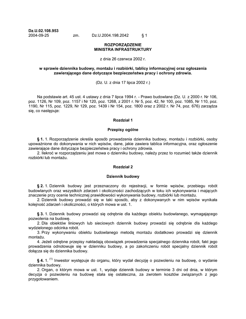 Dz.U.02.108.953 2004-09-25 zm. Dz.U.2004.198.2042 §1 ROZPORZ DZENIE MINISTRA INFRASTRUKTURY z dnia 26 czerwca 2002 r. w sprawie dziennika budowy, monta u i rozbiórki, tablicy informacyjnej oraz ogłoszenia zawieraj cego dane dotycz ce bezpiecze stwa pracy i ochrony zdrowia. (Dz. U. z dnia 17 lipca 2002 r.) Na podstawie art. 45 ust. 4 ustawy z dnia 7 lipca 1994 r. - Prawo budowlane (Dz. U. z 2000 r. Nr 106, poz. 1126, Nr 109, poz. 1157 i Nr 120, poz. 1268, z 2001 r. Nr 5, poz. 42, Nr 100, poz. 1085, Nr 110, poz. 1190, Nr 115, poz. 1229, Nr 129, poz. 1439 i Nr 154, poz. 1800 oraz z 2002 r. Nr 74, poz. 676) zarz dza si , co nast puje: Rozdział 1 Przepisy ogólne § 1. 1. Rozporz dzenie okre la sposób prowadzenia dziennika budowy, monta u i rozbiórki, osoby upowa nione do dokonywania w nich wpisów, dane, jakie zawiera tablica informacyjna, oraz ogłoszenie zawieraj ce dane dotycz ce bezpiecze stwa pracy i ochrony zdrowia. 2. Ilekroć w rozporz dzeniu jest mowa o dzienniku budowy, nale y przez to rozumieć tak e dziennik rozbiórki lub monta u. Rozdział 2 Dziennik budowy § 2. 1. Dziennik budowy jest przeznaczony do rejestracji, w formie wpisów, przebiegu robót budowlanych oraz wszystkich zdarze i okoliczno ci zachodz cych w toku ich wykonywania i maj cych znaczenie przy ocenie technicznej prawidłowo ci wykonywania budowy, rozbiórki lub monta u. 2. Dziennik budowy prowadzi si w taki sposób, aby z dokonywanych w nim wpisów wynikała kolejno ć zdarze i okoliczno ci, o których mowa w ust. 1. § 3. 1. Dziennik budowy prowadzi si odr bnie dla ka dego obiektu budowlanego, wymagaj cego pozwolenia na budow . 2. Dla obiektów liniowych lub sieciowych dziennik budowy prowadzi si odr bnie dla ka dego wydzielonego odcinka robót. 3. Przy wykonywaniu obiektu budowlanego metod monta u dodatkowo prowadzi si dziennik monta u. 4. Je eli odr bne przepisy nakładaj obowi zek prowadzenia specjalnego dziennika robót, fakt jego prowadzenia odnotowuje si w dzienniku budowy, a po zako czeniu robót specjalny dziennik robót doł cza si do dziennika budowy. § 4. 1. Inwestor wyst puje do organu, który wydał decyzj o pozwoleniu na budow , o wydanie dziennika budowy. 2. Organ, o którym mowa w ust. 1, wydaje dziennik budowy w terminie 3 dni od dnia, w którym decyzja o pozwoleniu na budow stała si ostateczna, za zwrotem kosztów zwi zanych z jego przygotowaniem. (1) § 5. 1. Dziennik budowy ma format A-4, ponumerowane strony i jest zabezpieczony przed zdekompletowaniem. Strony dziennika budowy przeznaczone do wpisów s podwójne - oryginał i kopia z perforacj umo liwiaj c łatwe jej wyrywanie. 2. Na poszczególne strony dziennika budowy organ wydaj cy dziennik nanosi piecz cie. § 6. 1. Na stronie tytułowej dziennika budowy organ, o którym mowa w § 4 ust. 1, zamieszcza numer, dat wydania oraz liczb stron dziennika, imi i nazwisko lub nazw (firm ) inwestora, rodzaj i adres budowy, rozbiórki lub monta u, numer i dat wydania pozwolenia na budow oraz pouczenie o sposobie prowadzenia dziennika i odpowiedzialno ci okre lonej w art. 93 pkt 4 ustawy z dnia 7 lipca 1994 r. Prawo budowlane. 2. Na pierwszej stronie dziennika budowy inwestor zamieszcza imi i nazwisko lub nazw (firm ) wykonawcy lub wykonawców oraz osób sprawuj cych kierownictwo budowy i robót budowlanych, nadzór autorski i inwestorski, podaj c ich specjalno ci i numery uprawnie budowlanych. Osoby te potwierdzaj podpisem i dat przyj cie powierzonych im obowi zków. 3. Kolejne strony dziennika budowy przeznacza si na wpisy dotycz ce przebiegu robót budowlanych. Ka dy wpis oznacza dat i podpisuje osoba dokonuj ca wpisu, z podaniem imienia, nazwiska, wykonywanej funkcji i nazwy jednostki organizacyjnej lub organu, który reprezentuje. 4. Je eli w trakcie wykonywania robót budowlanych nast puje zmiana kierownika budowy, kierownika robót, inspektora nadzoru inwestorskiego lub projektanta sprawuj cego nadzór autorski, w dzienniku budowy dokonuje si wpisu okre laj cego stan zaawansowania i zabezpieczenia przekazywanej budowy, rozbiórki lub monta u. Wpis ten potwierdza si dat i podpisami osoby przekazuj cej i przejmuj cej obowi zki. 5. Pod ka dym wpisem w dzienniku budowy osoby, których wpis dotyczy, potwierdzaj podpisem i dat zapoznanie si z jego tre ci . 6. Kierownik budowy stwierdza wpisem w dzienniku budowy fakt zamkni cia dziennika lub jego kontynuacj w nast pnym, kolejno numerowanym tomie. § 7. 1. Wpisów w dzienniku budowy dokonuje si w sposób trwały i czytelny na oryginałach i kopiach stron, zamieszczaj c je w porz dku chronologicznym, w sposób uniemo liwiaj cy dokonanie pó niejszych uzupełnie . 2. W razie konieczno ci wprowadzenia poprawek do dokonanych ju wpisów, nale y niewła ciwy tekst skre lić w sposób umo liwiaj cy jego odczytanie i wprowadzić wła ciw tre ć, z uzasadnieniem wprowadzonej zmiany. Skre lenia i poprawki s dokonywane w formie wpisu do dziennika budowy. 3. Dokonywanie wpisów na odwrocie ponumerowanych stron jest zabronione. § 8. 1. Protokoły zwi zane z budow lub sporz dzane w trakcie wykonywania robót budowlanych wpisuje si do dziennika budowy. 2. Dopuszcza si sporz dzanie protokołów, o których mowa w ust. 1, na oddzielnych arkuszach. Arkusze te nale y doł czyć w sposób trwały do oryginału dziennika budowy i jego kopii lub zamie cić w oddzielnym zbiorze, dokonuj c w dzienniku budowy wpisu o fakcie ich prowadzenia. § 9. 1. Do dokonywania wpisów w dzienniku budowy upowa nieni s : inwestor, inspektor nadzoru inwestorskiego, projektant, kierownik budowy, kierownik robót budowlanych, osoby wykonuj ce czynno ci geodezyjne na terenie budowy, pracownicy organów nadzoru budowlanego i innych organów uprawnionych do kontroli przestrzegania przepisów na budowie - w ramach dokonywanych czynno ci kontrolnych. 2. Osoby, o których mowa w § 6 ust. 5, upowa nione s do dokonywania wpisów w dzienniku budowy w zakresie, o którym mowa w tym przepisie. 1) 2) 3) 4) 5) 6) 7) § 10. Pracownicy organów na