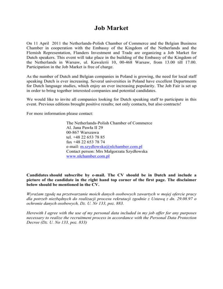 Job Market On 11 April 2011 the Netherlands-Polish Chamber of Commerce and the Belgian Business Chamber in cooperation with the Embassy of the Kingdom of the Netherlands and the Flemish Representation, Flanders Investment and Trade are organizing a Job Market for Dutch speakers. This event will take place in the building of the Embassy of the Kingdom of the Netherlands in Warsaw, ul. Kawalerii 10, 00-468 Warsaw, from 13.00 till 17.00. Participation in the Job Market is free of charge. As the number of Dutch and Belgian companies in Poland is growing, the need for local staff speaking Dutch is ever increasing. Several universities in Poland have excellent Departments for Dutch language studies, which enjoy an ever increasing popularity. The Job Fair is set up in order to bring together interested companies and potential candidates. We would like to invite all companies looking for Dutch speaking staff to participate in this event. Previous editions brought positive results; not only contacts, but also contracts! For more information please contact: The Netherlands-Polish Chamber of Commerce Al. Jana Pawła II 29 00-867 Warszawa tel. +48 22 653 78 85 fax +48 22 653 78 74 e-mail: [email protected] Contact person: Mrs Małgorzata Szydłowska www.nlchamber.com.pl Candidates should subscribe by e-mail. The CV should be in Dutch and include a picture of the candidate in the right hand top corner of the first page. The disclaimer below should be mentioned in the CV. Wyrażam zgodę na przetwarzanie moich danych osobowych zawartych w mojej ofercie pracy dla potrzeb niezbędnych do realizacji procesu rekrutacji zgodnie z Ustawą z dn. 29.08.97 o ochronie danych osobowych, Dz. U. Nr 133, poz. 883. Herewith I agree with the use of my personal data included in my job offer for any purposes necessary to realize the recruitment process in accordance with the Personal Data Protection Decree (Dz. U. No 133, poz. 833)