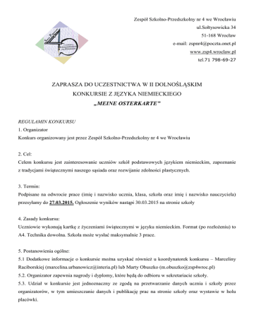Zespół Szkolno-Przedszkolny nr 4 we Wrocławiu ul.Sołtysowicka 34 51-168 Wrocław e-mail: [email protected] www.zsp4.wroclaw.pl tel.71 798-69-27 ZAPRASZA DO UCZESTNICTWA W II DOLNOŚLĄSKIM KONKURSIE Z JĘZYKA NIEMIECKIEGO „MEINE OSTERKARTE” REGULAMIN KONKURSU 1. Organizator Konkurs organizowany jest przez Zespół Szkolno-Przedszkolny nr 4 we Wrocławiu 2. Cel: Celem konkursu jest zainteresowanie uczniów szkół podstawowych językiem niemieckim, zapoznanie z tradycjami świątecznymi naszego sąsiada oraz rozwijanie zdolności plastycznych. 3. Termin: Podpisane na odwrocie prace (imię i nazwisko ucznia, klasa, szkoła oraz imię i nazwisko nauczyciela) przesyłamy do 27.03.2015. Ogłoszenie wyników nastąpi 30.03.2015 na stronie szkoły 4. Zasady konkursu: Uczniowie wykonują kartkę z życzeniami świątecznymi w języku niemieckim. Format (po rozłożeniu) to A4. Technika dowolna. Szkoła może wysłać maksymalnie 3 prace. 5. Postanowienia ogólne: 5.1 Dodatkowe informacje o konkursie można uzyskać również u koordynatorek konkursu – Marceliny Raciborskiej ([email protected]) lub Marty Obuszko ([email protected]) 5.2. Organizator zapewnia nagrody i dyplomy, które będą do odbioru w sekretariacie szkoły. 5.3. Udział w konkursie jest jednoznaczny ze zgodą na przetwarzanie danych ucznia i szkoły przez organizatorów, w tym umieszczanie danych i publikację prac na stronie szkoły oraz wystawie w holu placówki.