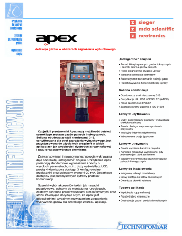 detekcja gazów w obszarach zagrożenia wybuchowego „Inteligentne” czujniki • Ponad 40 wykrywanych gazów toksycznych i szeroki zakres gazów palnych • Pełna diagnostyka długości „życia” • Wstępna kalibracja kartridżów • Automatyczne rozpoznanie rodzaju gazu • Przechowywanie historii kalibracji i pracy Solidna konstrukcja • Obudowa ze stali nierdzewnej 316 • Certyfikacja UL, CSA i CENELEC (ATEX) • Klasa szczelności IP66/67 • Zaprojektowany zgodnie z IEC 61508 Łatwy w użytkowaniu • Duży, podświetlany graficzny wyświetlacz ciekłokrystaliczny Czujniki i przetworniki Apex mają możliwość detekcji szerokiego zestawu gazów palnych i toksycznych. Solidna obudowa ze stali nierdzewnej 316, certyfikowana dla stref zagrożenia wybuchowego, jest przystosowana do użycia tych urządzeń w takich aplikacjach jak wydobycie i dystrybucja ropy naftowej i gazu oraz przetwórstwo chemiczne. Zaawansowana i innowacyjna technologia wykrywania daje naprawdę „inteligentne” czujniki. Urządzenia Apex posiadają standardowe wyposażenie i cechy o wysokich parametrach, m.in.: duży wyświetlacz LCD, prostą 4-klawiszową obsługę, 3 konfigurowalne przekaźniki oraz izolowany sygnał 4-20 mA. Dodatkowo dostępny jest przemysłowych cyfrowy protokół komunikacji. Szeroki wybór akcesoriów takich jak nasadki przepływowe, uchwyty do montażu na rurociągach, zestawy ochronne przed warunkami atmosferycznymi oraz stożki zbierające decyduje o tym, że Apex jest odpowiednim i wydajnym rozwiązaniem zagadnienia wykrywania gazów dla szerokiego zakresu aplikacji. • Prosta obsługa za pomocą czterech przycisków • Intuicyjny interfejs użytkownika • Wbudowane opcje językowe Łatwy w utrzymaniu • Prosta wymiana kartridża czujnika • Kartridże mogą być wymieniane, gdy jednostka jest pod zasilaniem • Wspólny sterownik dla czujników gazów palnych i toksycznych Łatwy do instalowania • Integralny uchwyt montażowy • Łatwy dostęp do listew zaciskowych • Dwa duże dławiki kablowe Typowe aplikacje • Wydobycie ropy naftowej • Przetwórstwo chemiczne • Dystrybucja gazu i produktów naftowych DANE TECHNICZNE Zasilanie 24 VDC nominalnie (18-32 VDC) Pobór mocy 3,0W dla czujników toksycznych 4,6W dla czujników katalitycznych 4,6W dla czujników półprzewodnikowych Wyjścia wyjścia przekaźnikowe A1,A2 oraz Fault – obciążalność 2A, 30 VDC, normalnie zwarte lub otwarte, normalnie zasilane lub nie zasilane 4-20 mA wyjście typu „sink”, typu „scurce” lub izolowane Materiał wykonania, masa Stal nierdzewna 316; 5,25 kg Dokładność Bazowa ±3%, przy 50% pełnej skali ±4% Powtarzalność ±2% przy 50% pełnej skali Liniowość <5% pełnej skali Czas odpowiedzi (typowy) Czujnik katalityczny: T50<5s, T90<10s Czujniki gazów toksycznych: T50<12s, T90<30s Stabilność (typowa) Temperaturowa Czasowa Temp. pracy <±5% pełnej skali (zero), <±5% pełnej skali (zakres) <±3% pełnej skali / rok (zero), <±4% pełnej skali / rok (zakres) -40 do +65°C (dla czujników gazów toksycznych zakres zależny od danej celki) Wyświetlacz LCD pracuje od –20˚C do +65˚C Wilgotność 0-99% (brak kondensacji) Stopień ochrony IP66/67 (Nema 4X / Nema 6) Poziom bezpieczeństwa Urządzenie zgodne z IEC 61508 (SIL Level 2) Zgodność EMC EN50270 Normy operacyjne EN61779, EN45544, EN50104, CSA C22.2 No.152 Certyfikat - CENELEC Ex II 2G EEx d ia IIC CSA Class 1, Division 1, grupy B, C, D UL Class 1, Division 1, grupy B, C, D, Class 1 (Zone 1) dla wszystkich certyfikatów: T4 (-40 do +80°C), T5 (-40 do +55°C) Dostępne gazy i zakresy (w przypadku innych gazów należy kontaktować się z TECHNOPOMIAR; niektóre typy czujników są w fazie wdrażania do produkcji) Gaz Wzór Zakres Typ celki Gaz Wzór Zakres Typ celki Arsenowodór Boroetan Trójchlorek borowy Trójfluorek borowy Brom Tlenek etylenu Chlorek winylu Tlenek propylenu Tetrahydrotiofen Chlor AsH3 B2H6 BCl3 BF3 Br2 CH2-CH2-O CH2=CHCl C3H6O C4H8S Cl2 0-0,2ppm 0-0,4ppm 0-6ppm 0-4ppm 0-0,4ppm 0-4ppm 0-4ppm 0-80ppm 0-40ppm 0-2ppm; 0-5ppm; 0-15ppm ECC ECC ECC ECC ECC ECC ECC ECC ECC ECC Bromowodór Chlorowodór Cyjanowodór Fluorowodór Trójfluorek azotu Amoniak HBr HCl HCN HF NF3 NH3 0-12ppm 0-20ppm 0-20ppm 0-12ppm 0-40ppm 0-50ppm; 0-100ppm; 0-400ppm; 0-1000ppm ECC ECC ECC ECC ECC ECC/TF Trójfluorek chloru Dwutlenek chloru Tlenek węgla ClF3 ClO2 CO ECC ECC ECC NO NO2 O2 O3 PH3 SF6 SiH2Cl2 0-100ppm 0-12ppm 0-21% V/V 0-0,4ppm 0-1,2ppm 0-4000ppm 0-10ppm ECC ECC ECC ECC/TF ECC ECC ECC Dwutlenek węgla CO2 ECC Silan SiH4 0-20ppm ECC Fosgen COCl2 0-0,4ppm 0-0,4ppm 0-100ppm; 0-200pmm; 0-500ppm 0-3000ppm; 0-2%V/V 0-0,4ppm Tlenek azotu Dwutlenek azotu Tlen Ozon Fosfina Sześciofluorek siarki Dwuchlorosilan ECC Si(OCH2CH3)4 0-40ppm ECC Fluor F2 0-4ppm ECC Ortokrzemian czteroetylu (TEOS) Dwutlenek siarki SO2 0-8ppm; 0-15ppm ECC Germanowodór Wodór Siarkowodór GeH4 H2 H2S ECC ECC ECC/TF CFC Lotne związki organiczne różne różne różne różne do ustalenia do ustalenia Selenek wodoru H2Se 0-0,8ppm 0-1000ppm 0-20ppm; 0-50ppm; 0-100ppm 0-0,2ppm Gazy palne różne 0-100% LEL CAT/TF ECC CAT- cz. katalityczny, ECC- cz. elektrochemiczny, TF- cz. półprzewodnikowy ul. Buforowa 4C, 52-131 Wrocław tel. +4871 332 98 00, faks +4871 332 98 30 www.technopomiar.pl; [email protected]