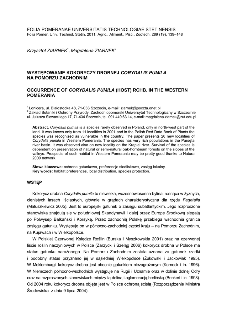 FOLIA POMERANAE UNIVERSITATIS TECHNOLOGIAE STETINENSIS Folia Pomer. Univ. Technol. Stetin. 2011, Agric., Aliment., Pisc., Zootech. 289 (19), 139–148 Krzysztof ZIARNEK1, Magdalena ZIARNEK2 WYSTĘPOWANIE KOKORYCZY DROBNEJ CORYDALIS PUMILA NA POMORZU ZACHODNIM OCCURRENCE OF CORYDALIS PUMILA (HOST) RCHB. IN THE WESTERN POMERANIA 1 Lonicera, ul. Białostocka 48, 71-033 Szczecin, e-mail: [email protected] Zakład Botaniki i Ochrony Przyrody, Zachodniopomorski Uniwersytet Technologiczny w Szczecinie ul. Juliusza Słowackiego 17, 71-434 Szczecin, tel. 091 449 63 14, e-mail: [email protected] 2 Abstract. Corydalis pumila is a species rarely observed in Poland, only in north-west part of the land. It was known only from 11 localities in 2001 and in the Polish Red Data Book of Plants the species was recognized as vulnerable in the country. The paper presents 20 new localities of Corydalis pumila in Western Pomerania. The species has very rich populations in the Parsęta river basin. It was observed also on new locality on the Krąpiel river. Survival of the species is dependent on preservation of natural or semi-natural oak-hornbeam forests on the slopes of the valleys. Prospects of such habitat in Western Pomerania may be pretty good thanks to Natura 2000 network. Słowa kluczowe: ochrona gatunkowa, preferencje siedliskowe, zasięg lokalny. Key words: habitat preferences, local distribution, species protection. WSTĘP Kokorycz drobna Corydalis pumila to niewielka, wczesnowiosenna bylina, rosnąca w Ŝyznych, cienistych lasach liściastych, głównie w grądach charakterystyczna dla rzędu Fagetalia (Matuszkiewicz 2005). Jest to europejski gatunek o zasięgu subatlantyckim. Jego rozproszone stanowiska znajdują się w południowej Skandynawii i dalej przez Europę Środkową sięgają po Półwysep Bałkański i Korsykę. Przez zachodnią Polskę przebiega wschodnia granica zasięgu gatunku. Występuje on w północno-zachodniej części kraju – na Pomorzu Zachodnim, na Kujawach i w Wielkopolsce. W Polskiej Czerwonej Księdze Roślin (Burska i Myszkowskia 2001) oraz na czerwonej liście roślin naczyniowych w Polsce (Zarzycki i Szeląg 2006) kokorycz drobna w Polsce ma status gatunku naraŜonego. Na Pomorzu Zachodnim została uznana za gatunek rzadki i podobny status przyznano jej w sąsiedniej Wielkopolsce (śukowski i Jackowiak 1995). W Meklemburgii kokorycz drobna jest obecnie gatunkiem niezagroŜonym (Korneck i in. 1996). W Niemczech północno-wschodnich występuje na Rugii i Uznamie oraz w dolinie dolnej Odry oraz na rozproszonych stanowiskach między tą doliną i aglomeracją berlińską (Benkert i in. 1998). Od 2004 roku kokorycz drobna objęta jest w Polsce ochroną ścisłą (Rozporządzenie Ministra Środowiska z dnia 9 lipca 2004). 140 K. Ziarnek i M. Ziarnek Ze względu na rzadkość występowania kokoryczy drobnej zarówno w Polsce, jak i generalnie w obrębie jej niewielkiego zasięgu – poznanie jej rozmieszczenia, zasobów i biologii ma istotne znaczenie dla planowania jej skutecznej ochrony. Celem tej pracy jest przedstawienie aktualnych danych o występowaniu na Pomorzu Zachodnim, istotnie uzupełniających i zmieniających wiedzę o zasobach tego gatunku, a takŜe ustalenie istotnych warunków i sposobów ich utrzymania. Dotychczasowe dane publikowane o rozmieszczeniu kokoryczy drobnej na Pomorzu Zachodnim Pierwsze notowanie kokoryczy drobnej na Pomorzu Zachodnim pochodzi z parku w Rudnie pod Połczynem (Müller C. 1886). Kolejne stanowisko stwierdził w rejonie Świnoujścia Ruthe (1889). Oba te notowania podają Ascherson i Graebner (1898–99) oraz Hegi (1958). TakŜe Wilhelm Müller w pierwszym wydaniu „Flora von Pommern” (1898) podał za Carlem Müllerem (1886) stanowisko z Rudna oraz drugie – za Ruthem (1889) – ze Świnoujścia. W trzecim wydaniu wspomnianego dzieła (1911) wymienia juŜ jednak cztery stanowiska: ze Szczecinka, z Połchowa, Połczyna i Białogardu. Nie jest jasne, czy dwa ostatnie notowania to nowe stanowiska, czy teŜ zapis taki jest wynikiem pomyłki – stanowisko w Rudnie zapisywane było we wcześniejszych pracach jako Rudno pod Połczynem (Müller C. 1886) lub jako Rudno pod Białogardem (Müller W. 1898). W 1921 roku Holzfuss opublikował informację o występowaniu kokoryczy drobnej w dolinie Krąpieli w rejonie Ulikowa, natomiast w 1927 roku – o stanowisku w lesie miejskim (Stadtwalde) w powiecie Sławno. Burska i Myszkowska (2001) interpretują tę ostatnią lokalizację jako rejon wsi Stary Kraków. Garcke w „Illustrierte Flora von Deutschland” (1922) powtórzył znane juŜ stanowiska z rejonu Połczyna i Świnoujścia oraz podał informację o występowaniu tego gatunku w dolinie Odry na całym odcinku od Frankfurtu nad Odrą do Angermünde. Z okolic miejscowości Kamieniec, znajdującej się w tym obszarze, obfite stanowisko kokoryczy drobnej opisała w 1973 roku Jasnowska, badane i opisywane szczegółowo takŜe później (Burska i Myszkowska 1991, 2001). W 1975 roku Ćwikliński gatunek ten podał z grądów koło Recza, stanowisko to w 2004 roku Popiela oznaczyła jako potwierdzone. Ostatnie doniesienia o stanowiskach kokoryczy drobnej wskazują na jej występowanie w grądzie przy rzece Chociel w rejonie wsi Kępno (Osadowski 1999) oraz w dolinie Krąpieli koło wsi Trąbki (Popiela i Prajs 1998). Burska i Myszkowska w Polskiej Czerwonej Księdze Roślin z 2001 roku podają jako odszukane i potwierdzone następujące stanowiska: w Ostrym Bardzie koło Połczyna-Zdroju i w Białogardzie, w Połczynie-Zdroju oraz w Kamieńcu. Autorki nie stwierdziły występowania kokoryczy drobnej na stanowiskach w Świnoujściu (za Ruthem 1889), Połchowie koło Kamienia Pomorskiego i Turowie koło Szczecinka (za Müllerem 1911), w Starym Krakowie koło Sławna (za Holzfussem 1927) oraz w Reczu (za Ćwiklińskim 1975). Pominięte w Polskiej Czerwonej Księdze Roślin stanowisko kokoryczy drobnej podane przez Holzfussa (1921) z doliny Kr