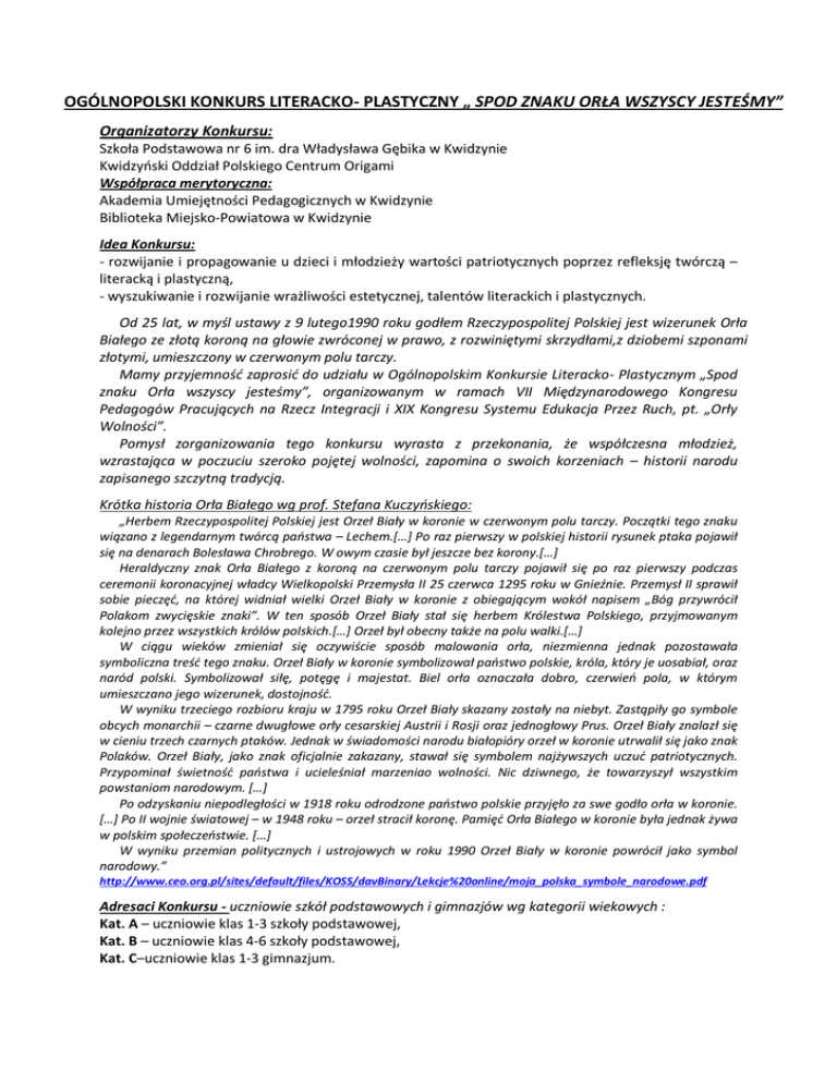 OGÓLNOPOLSKI KONKURS LITERACKO- PLASTYCZNY „ SPOD ZNAKU ORŁA WSZYSCY JESTEŚMY” Organizatorzy Konkursu: Szkoła Podstawowa nr 6 im. dra Władysława Gębika w Kwidzynie Kwidzyński Oddział Polskiego Centrum Origami Współpraca merytoryczna: Akademia Umiejętności Pedagogicznych w Kwidzynie Biblioteka Miejsko-Powiatowa w Kwidzynie Idea Konkursu: - rozwijanie i propagowanie u dzieci i młodzieży wartości patriotycznych poprzez refleksję twórczą – literacką i plastyczną, - wyszukiwanie i rozwijanie wrażliwości estetycznej, talentów literackich i plastycznych. Od 25 lat, w myśl ustawy z 9 lutego1990 roku godłem Rzeczypospolitej Polskiej jest wizerunek Orła Białego ze złotą koroną na głowie zwróconej w prawo, z rozwiniętymi skrzydłami,z dziobemi szponami złotymi, umieszczony w czerwonym polu tarczy. Mamy przyjemność zaprosić do udziału w Ogólnopolskim Konkursie Literacko- Plastycznym „Spod znaku Orła wszyscy jesteśmy”, organizowanym w ramach VII Międzynarodowego Kongresu Pedagogów Pracujących na Rzecz Integracji i XIX Kongresu Systemu Edukacja Przez Ruch, pt. „Orły Wolności”. Pomysł zorganizowania tego konkursu wyrasta z przekonania, że współczesna młodzież, wzrastająca w poczuciu szeroko pojętej wolności, zapomina o swoich korzeniach – historii narodu zapisanego szczytną tradycją. Krótka historia Orła Białego wg prof. Stefana Kuczyńskiego: „Herbem Rzeczypospolitej Polskiej jest Orzeł Biały w koronie w czerwonym polu tarczy. Początki tego znaku wiązano z legendarnym twórcą państwa – Lechem.[…] Po raz pierwszy w polskiej historii rysunek ptaka pojawił się na denarach Bolesława Chrobrego. W owym czasie był jeszcze bez korony.[…] Heraldyczny znak Orła Białego z koroną na czerwonym polu tarczy pojawił się po raz pierwszy podczas ceremonii koronacyjnej władcy Wielkopolski Przemysła II 25 czerwca 1295 roku w Gnieźnie. Przemysł II sprawił sobie pieczęć, na której widniał wielki Orzeł Biały w koronie z obiegającym wokół napisem „Bóg przywrócił Polakom zwycięskie znaki”. W ten sposób Orzeł Biały stał się herbem Królestwa Polskiego, przyjmowanym kolejno przez wszystkich królów polskich.[…] Orzeł był obecny także na polu walki.[…] W ciągu wieków zmieniał się oczywiście sposób malowania orła, niezmienna jednak pozostawała symboliczna treść tego znaku. Orzeł Biały w koronie symbolizował państwo polskie, króla, który je uosabiał, oraz naród polski. Symbolizował siłę, potęgę i majestat. Biel orła oznaczała dobro, czerwień pola, w którym umieszczano jego wizerunek, dostojność. W wyniku trzeciego rozbioru kraju w 1795 roku Orzeł Biały skazany zostały na niebyt. Zastąpiły go symbole obcych monarchii – czarne dwugłowe orły cesarskiej Austrii i Rosji oraz jednogłowy Prus. Orzeł Biały znalazł się w cieniu trzech czarnych ptaków. Jednak w świadomości narodu białopióry orzeł w koronie utrwalił się jako znak Polaków. Orzeł Biały, jako znak oficjalnie zakazany, stawał się symbolem najżywszych uczuć patriotycznych. Przypominał świetność państwa i ucieleśniał marzeniao wolności. Nic dziwnego, że towarzyszył wszystkim powstaniom narodowym. […] Po odzyskaniu niepodległości w 1918 roku odrodzone państwo polskie przyjęło za swe godło orła w koronie. […] Po II wojnie światowej – w 1948 roku – orzeł stracił koronę. Pamięć Orła Białego w koronie była jednak żywa w polskim społeczeństwie. […] W wyniku przemian politycznych i ustrojowych w roku 1990 Orzeł Biały w koronie powrócił jako symbol narodowy.” http://www.ceo.org.pl/sites/default/files/KOSS/davBinary/Lekcje%20online/moja_polska_symbole_narodowe.pdf Adresaci Konkursu - uczniowie szkół podstawowych i gimnazjów wg kategorii wiekowych : Kat. A – uczniowie klas 1-3 szkoły podstawowej, Kat. B – uczniowie klas 4-6 szkoły podstawowej, Kat. C–uczniowie klas 1-3 gimnazjum. Warunki przystąpienia do Konkursu Udział w Konkursie polega na wyborze jednej z proponowanych form: - pracy literackiej - w formie wiersza lub legendy, - pracy plastycznej - wykonanej dowolną techniką malarską lub techniką origamipłaskie z koła lub kwadratu. Powstałe pod kierunkiem nauczycieli (bez pomocy osób trzecich)indywidualne prace uczniów powinny być inspirowane tematyką patriotyczną, uwzględniające symbole narodowe oraz rozumienie słowa „wolność”. Mile widziane będą akcenty związane z symbolem Orła Białego z różnych okresów naszej historii. Wymagania dotyczące prac konkursowych i terminarz Prace literackie w formie wiersza lub legendy powinny być zapisane czcionką Times New Roman rozm. 12 (maksymalnie 2 strony formatu A-4). Prace plastyczne nie powinny przekraczać formatu A-2. Prace uczestników powinny być opatrzone metryczką zawierającą nazwę konkursu: Ogólnopolski Konkurs Literacko-Plastyczny pt. Spod znaku Orła wszyscy jesteśmy”,kategorię:A lub B lub C oraz następujące dane:Imię i nazwisko ucznia, nazwę i adres szkoły oraz imię i nazwisko nauczyciela. Każda szkoła, po uprzedniej selekcji, może zgłosić do konkursu 1- 5 prac literackich i 1- 5 prac plastycznych, dołączając Kartę zgłoszenia (Załączniki nr 1 i nr 2) oraz dodatkowozgłoszenie prac literackich w formie elektronicznej na adres:[email protected]. Termin nadsyłania prac literackich i plastycznych upływa 27 kwietnia 2015 r.o godz. 15.00 (przyjmując datęwpływu prac do organizatora). Zgłoszenie do konkursu jest jednoznaczne ze zgodą na upublicznienie prac w formie przewidzianej przez organizatora, tj.podczas wystawy towarzyszącej I Kwidzyńskiemu Świętu Muzyki pt.„Orły Wolności”. Prace uszkodzone podczas transportu w wyniku niewłaściwego zabezpieczenia oraz niespełniające ww. wymogów nie będą oceniane. Oceny prac konkursowych dokona zewnętrzne jury, a o wynikach obrad poinformuje laureatów drogą telefoniczną lub ma