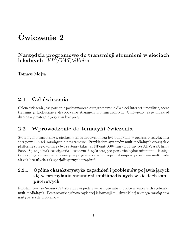Cwiczenie 2 Narzedzia programowe do transmisji strumieni w sieciach lokalnych -VIC/VAT/SVideo Tomasz Mojsa 2.1 Cel cwiczenia Celem cwiczenia jest poznanie podstawowego oprogramowania dla sieci Internet umo_zliwiajacego transmisje, kodowanie i dekodowanie strumieni multimedialnych. Omowiono tak_ze przyklad dzialania prostego algorytmu kompresji. 2.2 Wprowadzenie do tematyki cwiczenia Systemy multimedialne w sieciach komputerowych moga byc budowane w oparciu o rozwiazania sprzetowe lub te_z rozwiazania programowe. Przykladem systemow multimedialnych opartych o platforme sprzetowa moga byc systemy takie jak NPoint-6000 rmy TSL czy te_z ATV/AVA rmy Fore. Sa to jednak rozwiazania kosztowne i wykraczajace poza niezbedne minimum. Istnieje tak_ze oprogramowanie zapewniajace programowa kompresje i dekompresje strumieni multimedialnych bez u_zycia tak specjalistycznych urzadzen. 2.2.1 Ogolna charakterystyka zagadnien i problemow pojawiajacych sie w przesylaniu strumieni multimedialnych w sieciach komputerowych Problem Gwarantowanej Jakosci stanowi podstawowe wyzwanie w budowie wszystkich systemow multimedialnych. Dostarczanie cyfrowo zapisanej informacji multimedialnej wymaga rozwiazania nastepujacych problemow: 1 Zapewnienienia gwarantowanego pasma w sieci lub dynamiczna adaptacje do zmian w jej przepustowosci Zapewnienienia gwarantowanego czasu procesora przeznaczonego do dekodowania i kodowania dzwieku i obrazu, Dodatkowe wymagania jakie musza spelniac systemy multimedialne to: Precyzyjny dobor algorytmow kompresji, Zapewnienie synchronizacji strumieni audio i video, Zapewnienie mo_zliwosci zestawiania polacze n. 2.2.2 Problem "gwarantowanej jakosci" w sieciach komputerowych Wiekszosc systemow multimedialnych budowana jest w taki sposob, aby traala do najszerszego grona odbiorcow. Pociaga to za soba koniecznosc wykorzystywania najbardziej rozpowszechnionych protokolow sieciowych. Typowym protokolem wykorzystywanym w transmisji strumieni jest protokol UDP/IP. Protokol IPv4 nie zapewnia gwarantowanej przepustowosci i zestawienia permanentnego lacza o stalych zarezerwowanych parametrach. W przypadku du_zego obciaz_ enia sieci wystepuja opoznienia w przesylaniu informacji lub wrecz jej gubienie i brak mo_zliwosci odtworzenia przesylanych fragmentow ramek. Niektore aplikacje dla ominiecia tego ograniczenia wykorzystuja protokol na poziomie aplikacji - RTP. Poniewa_z RTP jest zintegrowany z aplikacjami mo_ze dzialac on nad takimi stosami protokolow jak UDP/IP, RMTP/RTIP oraz AAL5/ATM. Znakomita wiekszosc systemow multimedialnych pracuje nad protokolem UDP/IP u_zywajac wlasnie RTP. Czesto mo_zliwa tak_ze jest te_z praca tego protokolu w trybie transmisji indywidualnej i grupowej(w tym integracja z MBONE'm). MBONE to wirtualna siec, ktora sklada sie z domen transmisji grupowej, ktore moga bezposrednio wspierac rozglaszanie (np. sieci Ethernet), polaczonych poprzez tunele typu punkt-punkt pomiedzy zwykle jedna wybrana maszyna w danej domenie. Pakiety transmisji grupowej sa opakowywane na czas transmisji przez tunele w taki sposob, z_ e sa one postrzegane na czas transmisji przez tunel jako pakiety unicastowe (dolaczany jest inny header IP, adres przeznaczenia jest ustawiany jako adres konca tunelu (multicastowego routera) w innej domenie) 2.2.3 Problem "gwarantowanego czasu procesora" Problem ten w przypadku wiekszosci systemow operacyjnych ogolnego przeznaczenia pozostaje nadal otwarty. Ilosc aplikacji dzialajacych na danej maszynie wplywa znaczaco na szybkosc i jakosc obrazow. Dla zapewnienia odpowiedniej jakosci konieczne byloby ingerowanie w przydzielanie czasu procesora aplikacjom. Nie w ka_zdym systemie operacyjnym jest to mo_zliwe. 2.2.4 Metody kompresji danych i podstawowe informacje na temat statycznych obrazow Ka_zdy statyczny obraz mo_ze byc zasadniczo charakteryzowany przez 4 wartosci: 2 Szerokosc w pikselach, Wysokosc w pikselach, Liczba kanalow. Ka_zdy kanal w wielokanalowym obrazie musi miec te same wymiary, Rodzaj danych u_zywanych do opisu jednego kanalu. Typowo jest to bit, 1 lub 2 bajty. Niektore formaty narzucaja scisle ograniczenie na wymiary obrazu. Obrazy w ro_znych formatach moga byc przechowywane sekwencyjnie wedlug kanalu lub wedlug kolejnosci piksli. Obrazy, zawierajace 8 lub 16 bitowe dane do opisu piksla w 1 kanale, sa typowo przechowywane w sekwencyjnie wg. porzadku. Obrazy do opisu 1 kanalu u_zywajace 1 bit typowo sa zapisywane w sekwencyjny sposob kanalami. Dodatkowo odgrywa role przestrzen kolorow (Color Space) . Dla RGB kanaly sa przechowywane w postaci najpierw czerwony, zielony, niebieski. Dla przestrzeni kolorow YCbCr luminancja jest w pierwszym kanale, chrominancja Cb/Cr w drugim i trzecim. Luminancja jest to wielkosc fotometryczna okreslajaca gestosc natez_ enia swiatla, Chrominancja jest to kalorymetryczna cecha barwy okreslana jako roz_ nica pomiedzy nia a biela odniesienia o tej samej jaskrawosci (luminancji). Do najbardzie rozpowszechnionych formatow plikow w jakich przechowywuje sie kompresowane sekwencje obrazu nale_za: CellB, JPEG, H261, MPEG-1. 2.2.5 CellB Cechy charakterystyczne przykladowego opisanego poni_zej de/kodera CellB to: Szybkie dekodowanie i wyswietlanie zwlaszcza na indeksowanych w buerach ramek, Male wykorzystanie CPU, Dobrej jakosci obraz. Kompresja wewnatrz ramki odbywa sie na 4x4 blokach piksli u_zywajac tzw. cel kodow. Kompresja miedzy ramkami odbywa sie u_zywajac skip kodow. Obraz musi miec rozmiar bedacy wielokrotnoscia 4x4. Kompresja odbywa sie od strony lewej do prawej, od gory do dolu. Jesli kompresor odnajdzie tzw. celce (fragment 4x4 piksle) bez referencji do poprzedniej celce w poprzednim obrazie koduje ja u_zywajac czterobajtowy kod celki. Kod celki koduje dwa kolory (wyra_zone poprzez Chrominacje Cb/Cr i luminacje Y0/Y1) 3 Indeks do tabeli Cb/Cr 16 bit mask Indeks do tabeli Y/Y Rysunek 2.1: Cell kod przypisywany celce 4x4 Byte 0 Byte 1 Cb value Cr value Rysunek 2.2: Wektor w tabeli chrominancji i 16 bitowa maske, okreslajca, ktor