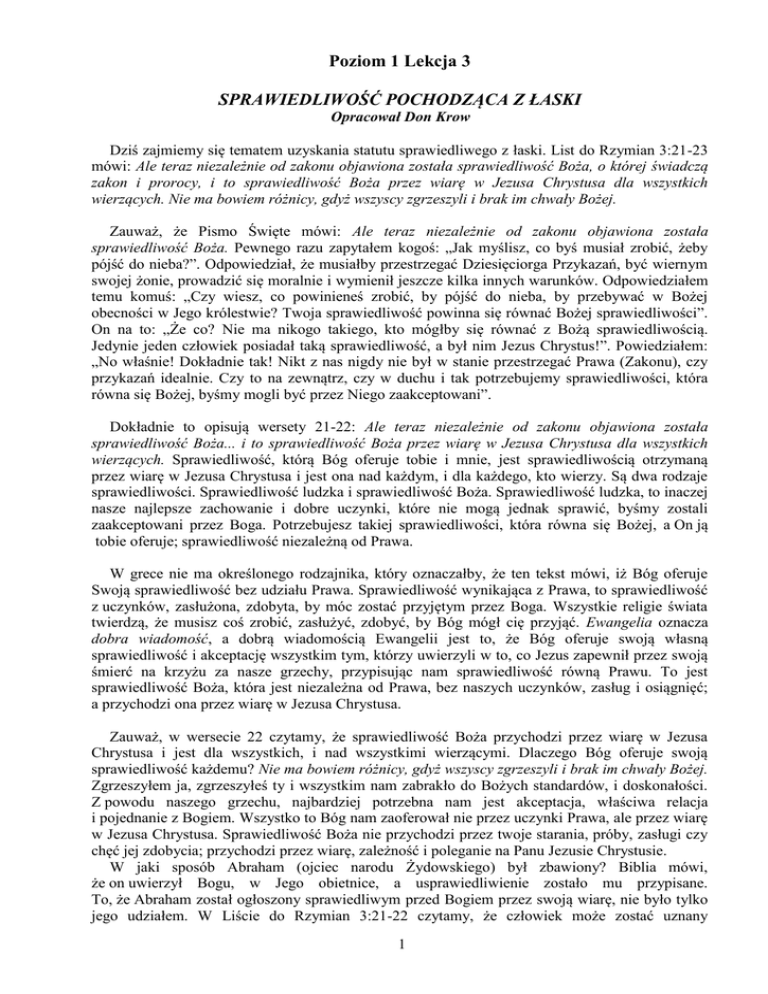 Poziom 1 Lekcja 3 SPRAWIEDLIWOŚĆ POCHODZĄCA Z ŁASKI Opracował Don Krow Dziś zajmiemy się tematem uzyskania statutu sprawiedliwego z łaski. List do Rzymian 3:21-23 mówi: Ale teraz niezależnie od zakonu objawiona została sprawiedliwość Boża, o której świadczą zakon i prorocy, i to sprawiedliwość Boża przez wiarę w Jezusa Chrystusa dla wszystkich wierzących. Nie ma bowiem różnicy, gdyż wszyscy zgrzeszyli i brak im chwały Bożej. Zauważ, że Pismo Święte mówi: Ale teraz niezależnie od zakonu objawiona została sprawiedliwość Boża. Pewnego razu zapytałem kogoś: „Jak myślisz, co byś musiał zrobić, żeby pójść do nieba?”. Odpowiedział, że musiałby przestrzegać Dziesięciorga Przykazań, być wiernym swojej żonie, prowadzić się moralnie i wymienił jeszcze kilka innych warunków. Odpowiedziałem temu komuś: „Czy wiesz, co powinieneś zrobić, by pójść do nieba, by przebywać w Bożej obecności w Jego królestwie? Twoja sprawiedliwość powinna się równać Bożej sprawiedliwości”. On na to: „Że co? Nie ma nikogo takiego, kto mógłby się równać z Bożą sprawiedliwością. Jedynie jeden człowiek posiadał taką sprawiedliwość, a był nim Jezus Chrystus!”. Powiedziałem: „No właśnie! Dokładnie tak! Nikt z nas nigdy nie był w stanie przestrzegać Prawa (Zakonu), czy przykazań idealnie. Czy to na zewnątrz, czy w duchu i tak potrzebujemy sprawiedliwości, która równa się Bożej, byśmy mogli być przez Niego zaakceptowani”. Dokładnie to opisują wersety 21-22: Ale teraz niezależnie od zakonu objawiona została sprawiedliwość Boża... i to sprawiedliwość Boża przez wiarę w Jezusa Chrystusa dla wszystkich wierzących. Sprawiedliwość, którą Bóg oferuje tobie i mnie, jest sprawiedliwością otrzymaną przez wiarę w Jezusa Chrystusa i jest ona nad każdym, i dla każdego, kto wierzy. Są dwa rodzaje sprawiedliwości. Sprawiedliwość ludzka i sprawiedliwość Boża. Sprawiedliwość ludzka, to inaczej nasze najlepsze zachowanie i dobre uczynki, które nie mogą jednak sprawić, byśmy zostali zaakceptowani przez Boga. Potrzebujesz takiej sprawiedliwości, która równa się Bożej, a On ją tobie oferuje; sprawiedliwość niezależną od Prawa. W grece nie ma określonego rodzajnika, który oznaczałby, że ten tekst mówi, iż Bóg oferuje Swoją sprawiedliwość bez udziału Prawa. Sprawiedliwość wynikająca z Prawa, to sprawiedliwość z uczynków, zasłużona, zdobyta, by móc zostać przyjętym przez Boga. Wszystkie religie świata twierdzą, że musisz coś zrobić, zasłużyć, zdobyć, by Bóg mógł cię przyjąć. Ewangelia oznacza dobra wiadomość, a dobrą wiadomością Ewangelii jest to, że Bóg oferuje swoją własną sprawiedliwość i akceptację wszystkim tym, którzy uwierzyli w to, co Jezus zapewnił przez swoją śmierć na krzyżu za nasze grzechy, przypisując nam sprawiedliwość równą Prawu. To jest sprawiedliwość Boża, która jest niezależna od Prawa, bez naszych uczynków, zasług i osiągnięć; a przychodzi ona przez wiarę w Jezusa Chrystusa. Zauważ, w wersecie 22 czytamy, że sprawiedliwość Boża przychodzi przez wiarę w Jezusa Chrystusa i jest dla wszystkich, i nad wszystkimi wierzącymi. Dlaczego Bóg oferuje swoją sprawiedliwość każdemu? Nie ma bowiem różnicy, gdyż wszyscy zgrzeszyli i brak im chwały Bożej. Zgrzeszyłem ja, zgrzeszyłeś ty i wszystkim nam zabrakło do Bożych standardów, i doskonałości. Z powodu naszego grzechu, najbardziej potrzebna nam jest akceptacja, właściwa relacja i pojednanie z Bogiem. Wszystko to Bóg nam zaoferował nie przez uczynki Prawa, ale przez wiarę w Jezusa Chrystusa. Sprawiedliwość Boża nie przychodzi przez twoje starania, próby, zasługi czy chęć jej zdobycia; przychodzi przez wiarę, zależność i poleganie na Panu Jezusie Chrystusie. W jaki sposób Abraham (ojciec narodu Żydowskiego) był zbawiony? Biblia mówi, że on uwierzył Bogu, w Jego obietnice, a usprawiedliwienie zostało mu przypisane. To, że Abraham został ogłoszony sprawiedliwym przed Bogiem przez swoją wiarę, nie było tylko jego udziałem. W Liście do Rzymian 3:21-22 czytamy, że człowiek może zostać uznany 1 za sprawiedliwego przez Boga, wierząc w Jezusa Chrystusa. Biblia stwierdza, że ze względu na cenę, którą poniósł Chrystus, przelewając swoją krew za nasze grzechy, sprawiedliwość zostanie przypisana każdemu, kto po prostu wierzy w Chrystusa. Rzymian 5:17: Albowiem jeśli przez upadek jednego człowieka śmierć zapanowała przez jednego, o ileż bardziej ci, którzy otrzymują obfitość łaski i daru usprawiedliwienia, królować będą w życiu przez jednego, Jezusa Chrystusa. Bóg oferuje ci dar sprawiedliwości, dar pojednania z Nim. Dar oczywiście ileś kosztuje, ale nie osobę, dla której jest on przeznaczony. Jeśli chciałbyś mi coś podarować a później żądałbyś zapłaty, nie byłby to dar, bo musiałbym zapłacić. Bóg udostępnił ci sprawiedliwość w postaci daru. Dar sprawiedliwości, uniewinnienia i pojednania z Bogiem, przychodzi przez wiarę w Jezusa Chrystusa. Pytania 1. Przeczytaj List do Tytusa 3:5. Czy sprawiedliwość której potrzebujemy jest tą samą, którą możemy sami osiągnąć? ______________________________________________________________________________ 2. Przeczytaj Drugi list do Koryntian 5:21. Jakiego rodzaju sprawiedliwości nam potrzeba? ______________________________________________________________________________ 3. Przeczytaj List do Rzymian 3:22. W jaki sposób otrzymujemy tą sprawiedliwość? ______________________________________________________________________________ 4. Przeczytaj List do Filipian 3:9. Czym jest sprawiedliwość przychodząca z Prawa? ______________________________________________________________________________ 5. Przeczytaj Galacjan 2:21. W jaki sposób moglibyśmy udaremnić Bożą łaskę? ______________________________________