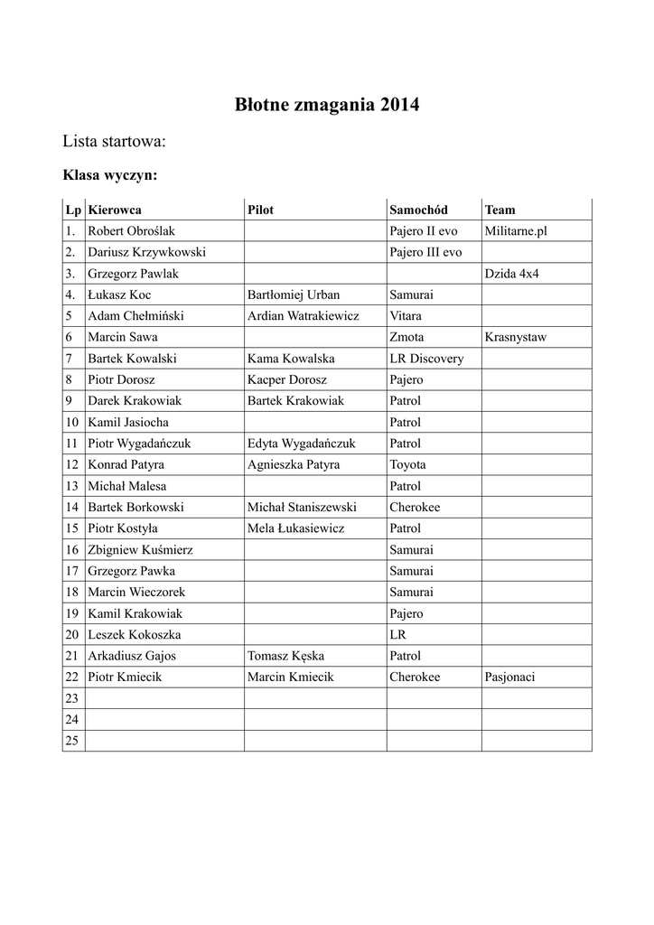 Błotne zmagania 2014 Lista startowa: Klasa wyczyn: Lp Kierowca Pilot Samochód Team 1. Robert Obroślak Pajero II evo Militarne.pl 2. Dariusz Krzywkowski Pajero III evo 3. Grzegorz Pawlak Dzida 4x4 4. Łukasz Koc Bartłomiej Urban Samurai 5 Adam Chełmiński Ardian Watrakiewicz Vitara 6 Marcin Sawa 7 Bartek Kowalski Kama Kowalska LR Discovery 8 Piotr Dorosz Kacper Dorosz Pajero 9 Darek Krakowiak Bartek Krakowiak Patrol Zmota 10 Kamil Jasiocha Patrol 11 Piotr Wygadańczuk Edyta Wygadańczuk Patrol 12 Konrad Patyra Agnieszka Patyra Toyota 13 Michał Malesa Patrol 14 Bartek Borkowski Michał Staniszewski Cherokee 15 Piotr Kostyła Mela Łukasiewicz Patrol 16 Zbigniew Kuśmierz Samurai 17 Grzegorz Pawka Samurai 18 Marcin Wieczorek Samurai 19 Kamil Krakowiak Pajero 20 Leszek Kokoszka LR 21 Arkadiusz Gajos Tomasz Kęska Patrol 22 Piotr Kmiecik Marcin Kmiecik Cherokee 23 24 25 Krasnystaw Pasjonaci Klasa Extrem: Lp Kierowca Pilot Samochód Team 1. Andrzej Żdziebłoski Piotr Szczygielski Ropuch Lublin Malin Lublin 2. Sławomir Jabłoński – Malin 3. Robert Wygar 3p 4. Sebastian Grela Zamość 5 Tomasz Wójtowicz Marcin Ogórek 6 Dariusz Zowczak 7 Paweł Ścibior Krzysztof Ścibior Zmota 8 Roman Muzyka Sylwia Muzyka Jimny evo 9 Tomek Karman Filip Karman Patrol Patrol v8 10 Michał Janiak 11 Przemysław Kręc Zmota Andrzej Drwal Gawolin Zmota Łuków Jeep Auto Fuks 4x4 12 Andrzej Grzegorczyk Gamerc 13 Zbigniew Kuśmierz Samurai 14 Grzegorz Pawka Samurai 15 Marcin Wieczorek Samurai 16 Żuku Patrol V8 17 Pawkin Samurai Józefów 18 Andrzej Łoński Samurai Zamość 19 20
