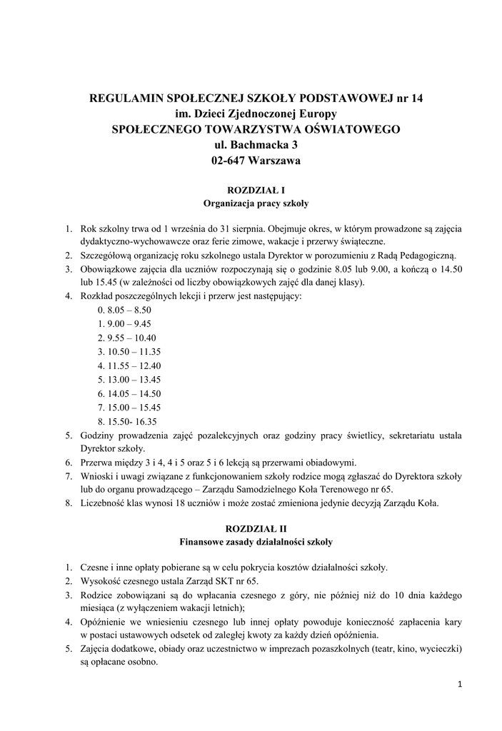 REGULAMIN SPOŁECZNEJ SZKOŁY PODSTAWOWEJ nr 14 im. Dzieci Zjednoczonej Europy SPOŁECZNEGO TOWARZYSTWA OŚWIATOWEGO ul. Bachmacka 3 02-647 Warszawa ROZDZIAŁ I Organizacja pracy szkoły 1. Rok szkolny trwa od 1 września do 31 sierpnia. Obejmuje okres, w którym prowadzone są zajęcia dydaktyczno-wychowawcze oraz ferie zimowe, wakacje i przerwy świąteczne. 2. Szczegółową organizację roku szkolnego ustala Dyrektor w porozumieniu z Radą Pedagogiczną. 3. Obowiązkowe zajęcia dla uczniów rozpoczynają się o godzinie 8.05 lub 9.00, a kończą o 14.50 lub 15.45 (w zależności od liczby obowiązkowych zajęć dla danej klasy). 4. Rozkład poszczególnych lekcji i przerw jest następujący: 0. 8.05 – 8.50 1. 9.00 – 9.45 2. 9.55 – 10.40 3. 10.50 – 11.35 4. 11.55 – 12.40 5. 13.00 – 13.45 6. 14.05 – 14.50 7. 15.00 – 15.45 8. 15.50- 16.35 5. Godziny prowadzenia zajęć pozalekcyjnych oraz godziny pracy świetlicy, sekretariatu ustala Dyrektor szkoły. 6. Przerwa między 3 i 4, 4 i 5 oraz 5 i 6 lekcją są przerwami obiadowymi. 7. Wnioski i uwagi związane z funkcjonowaniem szkoły rodzice mogą zgłaszać do Dyrektora szkoły lub do organu prowadzącego – Zarządu Samodzielnego Koła Terenowego nr 65. 8. Liczebność klas wynosi 18 uczniów i może zostać zmieniona jedynie decyzją Zarządu Koła. ROZDZIAŁ II Finansowe zasady działalności szkoły 1. Czesne i inne opłaty pobierane są w celu pokrycia kosztów działalności szkoły. 2. Wysokość czesnego ustala Zarząd SKT nr 65. 3. Rodzice zobowiązani są do wpłacania czesnego z góry, nie później niż do 10 dnia każdego miesiąca (z wyłączeniem wakacji letnich); 4. Opóźnienie we wniesieniu czesnego lub innej opłaty powoduje konieczność zapłacenia kary w postaci ustawowych odsetek od zaległej kwoty za każdy dzień opóźnienia. 5. Zajęcia dodatkowe, obiady oraz uczestnictwo w imprezach pozaszkolnych (teatr, kino, wycieczki) są opłacane osobno. 1 ROZDZIAŁ III Organy Szkoły 1. Organami szkoły określonymi Statutem Szkoły są: a) Dyrektor b) Rada Pedagogiczna c) Samorząd Uczniowski d) Rada Rodziców 2. Posiedzenia Rady Pedagogicznej są protokołowane, a ich przebieg stanowi nienaruszalną tajemnicę Rady Pedagogicznej. Wgląd w protokoły Rad Pedagogicznych ma organ prowadzący i nadzorujący pracę pedagogiczną szkoły (Kuratorium Oświaty i Wychowania). 3. Samorząd Uczniowski jest zobowiązany do przedstawienia Radzie Pedagogicznej swojego Regulaminu do zaopiniowania. 4. Rada Rodziców jest organem, którego utworzenie i działalność są uzależnione tylko i wyłącznie od woli rodziców. 5. Regulaminy Samorządu Uczniowskiego oraz Regulaminu Rady Rodziców zatwierdza organ prowadzący szkoły – Samodzielne Koło Terenowe nr 65 STO. ROZDZIAŁ IV Prawa i obowiązki uczniów 1. Uczeń ma prawo do: a) zorganizowanego zgodnie z zasadami higieny pracy umysłowej procesu kształcenia; b) opieki wychowawczej i warunków pobytu w szkole zapewniających bezpieczeństwo (zarówno fizyczne, jak i psychiczne); c) ochrony i poszanowania godności oraz życzliwego podmiotowego traktowania w procesie wychowawczym i dydaktycznym; d) swobodnego wyrażania opinii dotyczących życia szkoły, treści i sposobu nauczania oraz uzyskiwania na nie odpowiedzi i wyjaśnień; e) wolności sumienia i wyznania, swobody wyrażania swoich poglądów, jeśli nie narusza tym dobra i godności innych; f) przeprowadzanej na bieżąco sprawiedliwej, obiektywnej i jawnej oceny według ustalonych kryteriów (Kryteria oceniania nauki i zachowania oraz procedury odwoławcze określone są odrębnym dokumentem – Wewnątrzszkolnym Systemem Oceniania); g) uwzględniania szczególnych zaleceń Poradni Psychologiczno – Pedagogicznych w procesie kształcenia; h) współuczestniczenia w tworzeniu planów wychowawczych klasy, proponowania tematyki godzin dyspozycyjnych; i) rozwijania zainteresowań oraz zdolności ; j) korzystania z konsultacji przedmiotowych oraz dodatkowych zajęć wyrównawczych. k) uczestniczenia w konkursach przedmiotowych i zawodach zgodnie z jego zainteresowaniami i zdolnościami. 2 2. Uczeń ma obowiązek: a) punktualnie przychodzić na zajęcia i nie opuszczać zajęć bez ważnej przyczyny (każda nieobecność powinna być usprawiedliwiona przez rodzica lub opiekuna w formie ustnej w dniu nieobecności lub pisemnej nie później niż do końca miesiąca, w którym nastąpiła); b) przebywać w czasie obowiązkowych zajęć na terenie szkoły i nie opuszczać jej samowolnie pod żadnym pozorem; c) przynosić na zajęcia podręczniki, zeszyty oraz inne wymagane pomoce szkolne, odrabiać prace domowe; d) systematycznie się uczyć i rozwijać swoje umiejętności; e) uzupełniać braki wynikające z nieobecności ucznia, zaliczać sprawdziany, których nie pisał lub otrzymał z nich ocenę niedostateczną na zasadach określonych w WSO; f) w czasie pobytu w szkole, a także w czasie imprez pozaszkolnych i organizowanych przez szkołę wycieczek, podporządkować się poleceniom nauczycieli i innych pracowników szkoły; g) postępować zgodnie z zasadami współżycia społecznego, dbać o dobro szkoły i godnie ją reprezentować. 3. a) b) c) d) e) f) g) h) i) Za swoje osiągnięcia oraz zachowanie uczeń może otrzymać nagrodę w postaci: pochwały nauczyciela w obecności klasy; pochwały nauczyciela wpisaną do e-dziennika; pochwały wychowawcy w obecności klasy; pochwały Dyrektora w obecności całej społeczności szkolnej; listu pochwalnego do rodziców; wpisu do Złotej Księgi; dyplomu lub nagrody rzeczowej; nagrody Dyrektora za najlepszą średnią ocen w szkole; nagrody Dyrektora szkoły (pieniężnej) przyznawanej za wybitne osiągnięcia w nauce, konkursach przedmiotowych lub w pracy na rzecz szkoły czy środowiska. 4. a) b) c) d) e) f) g) h) i) Za niewłaściwe zachowania i postawę uczeń może być ukarany za pomocą: upomnieniem nauczyciela w obecności klasy; wpisem do e-dzienni