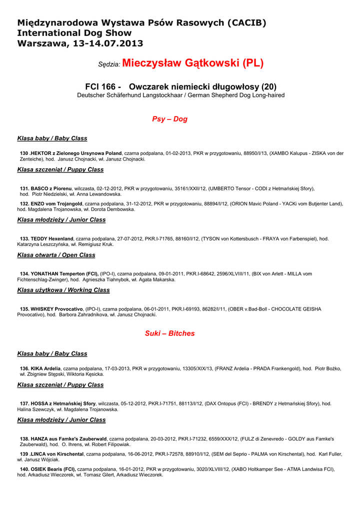 Międzynarodowa Wystawa Psów Rasowych (CACIB) International Dog Show Warszawa, 13-14.07.2013 Sędzia: Mieczysław Gątkowski (PL) FCI 166 - Owczarek niemiecki długowłosy (20) Deutscher Schäferhund Langstockhaar / German Shepherd Dog Long-haired Psy – Dog Klasa baby / Baby Class 130 .HEKTOR z Zielonego Ursynowa Poland, czarna podpalana, 01-02-2013, PKR w przygotowaniu, 88950/I/13, (XAMBO Kalupus - ZISKA von der Zenteiche), hod. Janusz Chojnacki, wł. Janusz Chojnacki. Klasa szczeniąt / Puppy Class 131. BASCO z Piorenu, wilczasta, 02-12-2012, PKR w przygotowaniu, 35161/XXII/12, (UMBERTO Tensor - CODI z Hetmańskiej Sfory), hod. Piotr Niedzielski, wł. Anna Lewandowska. 132. ENZO vom Trojangold, czarna podpalana, 31-12-2012, PKR w przygotowaniu, 88894/I/12, (ORION Mavic Poland - YACKi vom Butjenter Land), hod. Magdalena Trojanowska, wł. Dorota Dembowska. Klasa młodzieŜy / Junior Class 133. TEDDY Hexenland, czarna podpalana, 27-07-2012, PKR.I-71765, 88160/I/12, (TYSON von Kottersbusch - FRAYA von Farbenspiel), hod. Katarzyna Leszczyńska, wł. Remigiusz Kruk. Klasa otwarta / Open Class 134. YONATHAN Temperton (FCI), (IPO-I), czarna podpalana, 09-01-2011, PKR.I-68642, 2596/XLVIII/11, (BIX von Arlett - MILLA vom Fichtenschlag-Zwinger), hod. Agnieszka Tiahnybok, wł. Agata Makarska. Klasa uŜytkowa / Working Class 135. WHISKEY Provocativo, (IPO-I), czarna podpalana, 06-01-2011, PKR.I-69193, 86282/I/11, (OBER v.Bad-Boll - CHOCOLATE GEISHA Provocativo), hod. Barbora Zahradnikova, wł. Janusz Chojnacki. Suki – Bitches Klasa baby / Baby Class 136. KIKA Ardelia, czarna podpalana, 17-03-2013, PKR w przygotowaniu, 13305/XIX/13, (FRANZ Ardelia - PRADA Frankengold), hod. Piotr BoŜko, wł. Zbigniew Stępski, Wiktoria Kęsicka. Klasa szczeniąt / Puppy Class 137. HOSSA z Hetmańskiej Sfory, wilczasta, 05-12-2012, PKR.I-71751, 88113/I/12, (DAX Ontopus (FCI) - BRENDY z Hetmańskiej Sfory), hod. Halina Szewczyk, wł. Magdalena Trojanowska. Klasa młodzieŜy / Junior Class 138. HANZA aus Famke's Zauberwald, czarna podpalana, 20-03-2012, PKR.I-71232, 6559/XXX/12, (FULZ di Zenevredo - GOLDY aus Famke's Zauberwald), hod. O. Ihrens, wł. Robert Filipowiak. 139 .LINCA von Kirschental, czarna podpalana, 16-06-2012, PKR.I-72578, 88910/I/12, (SEM del Seprio - PALMA von Kirschental), hod. Karl Fuller, wł. Janusz Wójciak. 140. OSIEK Bearis (FCI), czarna podpalana, 16-01-2012, PKR w przygotowaniu, 3020/XLVIII/12, (XABO Holtkamper See - ATMA Landwisa FCI), hod. Arkadiusz Wieczorek, wł. Tomasz Gilert, Arkadiusz Wieczorek. Klasa pośrednia / Intermediate Class 141. CAPRI Woj-Bas, wilczasta, 31-12-2011, PKR.I-71181, 34799/XXII/11, (XARO V-Max - KAMEA Woj-Bas), hod. W.Pustelnik, A.Kucharska, wł. Kamila Lenarczyk-Szymczakowska. 142 .DUMA vom Trojangold, czarna podpalana, 19-10-2011, PKR.I-69215, 86217/I/11, (ZOTTEL vom Frankengold - YACKI vom Butjenter Land), hod.Magdalena Trojanowska, wł. Magdalena Trojanowska. 143. LARA Euro, czarna podpalana, 12-02-2012, PKR.I-70203, 9269/VI/12, (Al-grom SPEEDY - JANKA v. Zellwaldrand), hod. Marek Rafałowski, wł. Marek Rafałowski. 144.XIMBA zur Vorringer Rheinaue, czarna podpalana, 15-10-2011, PKR.I-72084, 12228/XXIV/11, (ETOO aus Wattenscheid - VENUS zur Worringer Rheinaue), hod. Bruno Itter, wł. Dariusz Grzesiuk. Klasa otwarta / Open Class 145 .DERA Jarkowski Dwór, czarna podpalana, 04-04-2011, PKR.I-69006, 4148/XXXVIII/11, (DIGGER vom Elzmundungsraum - DONNA vom Bauhofer-Land), hod. Jarosław Opozda, wł. Robert Krupa. 146. GIALLA vom Kirschental, czarna podpalana, 01-09-2011, PKR.I-70787, 87578/I/11, (OBER von Bad-Boll - DESSA vom Kirschental), hod. Karl Fuller, wł. Janusz Wójciak. 147. MESTA z Makowskiej Sfory (FCI), czarna podpalana, 17-06-2011, PKR.I-69947, 86806/I/11, (IWO Eskorta - STARKA Eskorta), hod. Jacek Makowski, wł. Jacek Makowski. 148 .MOKA z Makowskiej Sfory FCI, czarna podpalana, 17-06-2011, PKR.I-69949, 86804/I/11, (IWO Eskorta - STARKA Eskorta), hod. Jacek Makowski, wł. Grzegorz śegocki. Klasa uŜytkowa / Working Class 149. YACKI vom Butjenter Land, (Ch.PL, IPO1), czarna podpalana, 05-12-2008, PKR.I-67681, 85120/I/08, (BRUNO von Vierhundert Hertz - GALINA vom Butjenter Land), hod. Uwe Wienbarg, wł. Magdalena Trojanowska. Sędzia: Mieczysław Gątkowski (PL) FCI 166 - Owczarek niemiecki krótkowłosy (45) Deutscher Schäferhund Stockhaar / German Shepherd Dog Short-haired Psy – Dogs Klasa baby / Baby Class 150. DAGO Imberfal (FCI), czarna podpalana, 17-02-2013, PKR w przygotowaniu, 88786/I/13, (ENRICO vom Klostermoor - YADE Hexenland), hod. Przemysław Pałuba, wł. Przemysław Pałuba. 151. DORAN Imberfal (FCI), czarna podpalana, 17-02-2013, PKR w przygotowaniu, 88905/I/13, (ENRICO vom Klostermoor - YADE Hexenland), hod. Przemysław Pałuba, wł. Przemysław Pałuba. Klasa młodzieŜy / Junior Class 152. IRMO Rubinwald, (Mł.Zw.KL), czarna podpalana, 16-04-2012, PKR.I-71941, 88227/I/12, (IRONMAN zur Worringer Rheinaue - YCONE Hexenland), hod. Małgorzata Przesmycka, wł. Aleksandra Wyszomirska. 153. KERY z Krywlan, czarna podpalana, 10-07-2012, PKR.I-71543, 87982/I/12, (YOYO zur Worringer Rheinaue - LUKA z Krywlan), hod. Jarosław, Ryszard Gęsionowski, wł. Anna Błaszczyk-Ciećwierz, Piotr Ciećwierz. 154. MASTER De-Marko Poland (FCI), czarna podpalana, 02-06-2012, PKR.I-70797, 87469/I/12, (SULTAN von der Jahnhohe - FURBA Hexenland (FCI)), hod. Marek Dmochowski, wł. Anna Kołak. 155. MORITZ De-Marko Poland (FCI), czarna podpalana, 02-06-2012, PKR.I-71766, 88137/I/12, (SULTAN von der Jahnhohe - FURBA Hexenland FCI), hod. Marek Dmochowski, wł. Maja Miesztalska. 156. TEO Woj-Bas, czarna podpalana, 15-07-2012, PKR.I-72169, 35090/XXII/12, (GIO vom Mühlenteich - BIRMA Woj-Bas), hod. Wojciech Pustelnik, wł. Karolina Kubiak, Wojciech Pustelnik. Klasa pośrednia / Intermediate Class 157. JJ Primo Grande, czarna podpalana, 01-04-2012, PKR.I-70898, 6742/XXVII/12, (FULZ di Zenevredo - DALA Primo Grande), hod. Szymon Muklaski, wł. Sylwester Bry