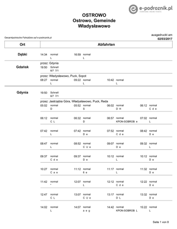 OSTROWO Ostrowo, Gemeinde Władysławowo ausgedruckt am 02/03/2017 Gesamtpolnische Fahrpläne auf e-podroznik.pl Ort Dębki Abfahrten 14:34 normal L 16:59 normal L przez: Gdynia Gdańsk 19:50 Schnell 6/7 7/1 przez: Władysławowo, Puck, Sopot 08:27 Gdynia 19:50 normal L 09:22 normal 10:42 normal L L Schnell 6/7 7/1 przez: Jastrzębia Góra, Władysławowo, Puck, Reda 05:02 06:12 07:42 08:47 09:37 10:27 11:42 12:47 14:02 normal D 05:52 normal normal C L 06:32 normal normal L 07:42 normal normal L 08:52 normal normal C d e 09:37 normal normal C a e 11:12 normal normal " 12:07 normal normal C L 13:07 normal normal L 14:07 normal S D D e C U e D e 6 e L C U e a e g 06:02 normal D H 06:57 normal KPON-SOBROB e 07:52 normal C d e 09:07 normal D e 10:12 normal L 11:17 normal L 12:12 normal C d e 13:17 normal D L 14:42 normal KPON-SOBROB L 06:12 normal C d e 07:02 normal L 08:42 normal D e 09:32 normal L 10:12 normal D e 11:32 normal D e 12:22 normal D e 13:32 normal D e 15:22 normal L Seite 1 von 8 OSTROWO Ostrowo, Gemeinde Władysławowo ausgedruckt am 02/03/2017 Gesamtpolnische Fahrpläne auf e-podroznik.pl Ort Abfahrten 15:37 17:32 19:17 normal a e g 16:42 normal normal L 17:42 normal normal L 20:07 normal D e D e D e 16:52 normal C a e g 18:27 normal L 16:52 normal L 18:37 normal a e g 20:07 normal L przez: Władysławowo, Jurata Hel 09:02 11:52 normal 09:52 normal KPON-SOBROB L L 10:32 normal normal 16:32 normal KPON-SOBROB L L 18:07 normal L 11:02 normal L L przez: Gdynia, Gdańsk, Toruń Kalisz 19:50 Schnell 6/7 7/1 Karwia 06:42 normal S 06:44 normal normal D L 09:17 normal normal L 10:37 normal normal D e 11:32 normal normal !! d 12:22 normal normal D e 13:12 normal normal L 14:17 normal 09:04 10:22 11:29 12:22 13:12 14:12 L L L L 6 e C U e C d e 07:59 normal KPON-SOBROB L 10:07 normal C L 11:02 normal KPON-SOBROB L 11:54 normal KPON-SOBROB L 12:24 normal D e 13:32 normal L 14:24 normal KPON-SOBROB L 08:07 normal D L 10:09 normal KPON-SOBROB L 11:27 normal C U e 12:17 normal L 13:12 normal KPON-SOBROB L 13:57 normal L 14:34 normal D e Seite 2 von 8 OSTROWO Ostrowo, Gemeinde Władysławowo ausgedruckt am 02/03/2017 Gesamtpolnische Fahrpläne auf e-podroznik.pl Ort Abfahrten 14:47 15:14 15:52 16:22 17:12 17:32 18:04 18:32 19:02 19:22 19:42 20:29 21:22 normal " 15:07 normal normal d e 15:22 normal normal + L 15:54 normal normal D H e 16:22 normal normal C L 17:14 normal normal L 17:49 normal normal L 18:22 normal normal L 18:42 normal normal " 19:09 normal normal D L 19:22 normal normal C d e g 20:04 normal normal D e 20:47 normal normal L 21:57 normal KPON-SOBROB L 6 L KPON-SOBROB L C a e D L D e D L C d e g D L 6 L L C a e g C a e g 15:09 normal D L 15:37 normal L 16:09 normal KPON-SOBROB L 16:34 normal S 17:32 normal D L 17:52 normal C L 18:22 normal D e 18:57 normal C L 19:09 normal D e 19:37 normal D e 20:14 normal L 21:09 normal L 22:22 normal L 15:12 normal + L 15:44 normal D e 16:22 normal L 16:59 normal D e 17:32 normal C a e g 17:54 normal D L 18:24 normal C L 18:57 normal D L 19:09 normal KPON-SOBROB L 19:42 normal L 20:27 normal L 21:19 normal D e 23:22 normal L Seite 3 von 8 OSTROWO Ostrowo, Gemeinde Władysławowo ausgedruckt am 02/03/2017 Gesamtpolnische Fahrpläne auf e-podroznik.pl Ort Łeba Abfahrten 06:30 Schnell 5/6 6/7 przez: Władysławowo Puck 08:27 19:52 22:22 normal L 09:22 normal L normal 20:07 normal KPON-SOBROB L C U e g normal D L 10:42 normal L 21:17 normal KPON-SOBROB L 14:22 normal D L 21:52 normal L 22:52 normal L przez: Jastrzębia Góra, Władysławowo 05:02 06:12 07:42 08:47 09:37 10:27 11:42 12:47 14:02 normal D 05:52 normal normal C L 06:32 normal normal L 07:42 normal normal L 08:52 normal normal C d e 09:37 normal normal C a e 11:12 normal normal " 12:07 normal normal C L 13:07 normal normal L 14:07 normal S D D e C U e D e 6 e L C U e a e g 06:02 normal D H 06:57 normal KPON-SOBROB e 07:52 normal C d e 09:07 normal D e 10:12 normal L 11:17 normal L 12:12 normal C d e 13:17 normal D L 14:42 normal KPON-SOBROB L 06:12 normal C d e 07:02 normal L 08:42 normal D e 09:32 normal L 10:12 normal D e 11:32 normal D e 12:22 normal D e 13:32 normal D e 15:22 normal L Seite 4 von 8 OSTROWO Ostrowo, Gemeinde Władysławowo ausgedruckt am 02/03/2017 Gesamtpolnische Fahrpläne auf e-podroznik.pl Ort Abfahrten 15:37 17:32 19:17 normal a e g 16:42 normal normal L 17:42 normal normal L 20:07 normal D e D e D e 16:52 normal C a e g 18:27 normal L 20:07 normal L 16:52 normal L 18:37 normal a e g 20:47 normal L przez: Jastrzębia Góra, Władysławowo, Puck Reda 05:02 06:12 07:42 08:47 09:37 10:27 11:42 12:47 14:02 15:37 normal D 05:52 normal normal C L 06:32 normal normal L 07:42 normal normal L 08:52 normal normal C d e 09:37 normal normal C a e 11:12 normal normal " 12:07 normal normal C L 13:07 normal normal L 14:07 normal normal a e g 16:42 normal S D D e C U e D e 6 e L C U e a e g D e 06:02 normal D H 06:57 normal KPON-SOBROB e 07:52 normal C d e 09:07 normal D e 10:12 normal L 11:17 normal L 12:12 normal C d e 13:17 normal D L 14:42 normal KPON-SOBROB L 16:52 normal C a e g 06:12 normal C d e 07:02 normal L 08:42 normal D e 09:32 normal L 10:12 normal D e 11:32 normal D e 12:22 normal D e 13:32 normal D e 15:22 normal L 16:52 normal L Seite 5 von 8 OSTROWO Ostrowo, Gemeinde Władysławowo ausgedruckt am 02/03/2017 Gesamtpolnische Fahrpläne auf e-podroznik.pl Ort Abfahrten 17:32 19:17 normal L 17:42 normal normal L 20:07 normal D e D e 18:27 normal L 20:07 normal L 18:37 normal a e g 20:47 normal L przez: Władysławowo, Puck Sopot 08:27 normal L 09:22 normal L 10:42 normal L przez: Gdynia, Gdańsk Toruń 19:50 Schnell 6/7 7/1 przez: Krokowa Wejherowo 08:52 16:42 Władysławowo 08:27 09:52 10:42 12:35 15:02 17:10 20:07 normal L 10:47 normal normal L 18:42 normal normal L 09:02 normal normal L 10:00 normal normal L 11:02 normal normal D L 12:45 normal normal L 15:57 normal normal L 18:07 normal normal C U e g 20:25 normal L L KPON-SOBROB L KPON-SOBROB L L KPON-SOB