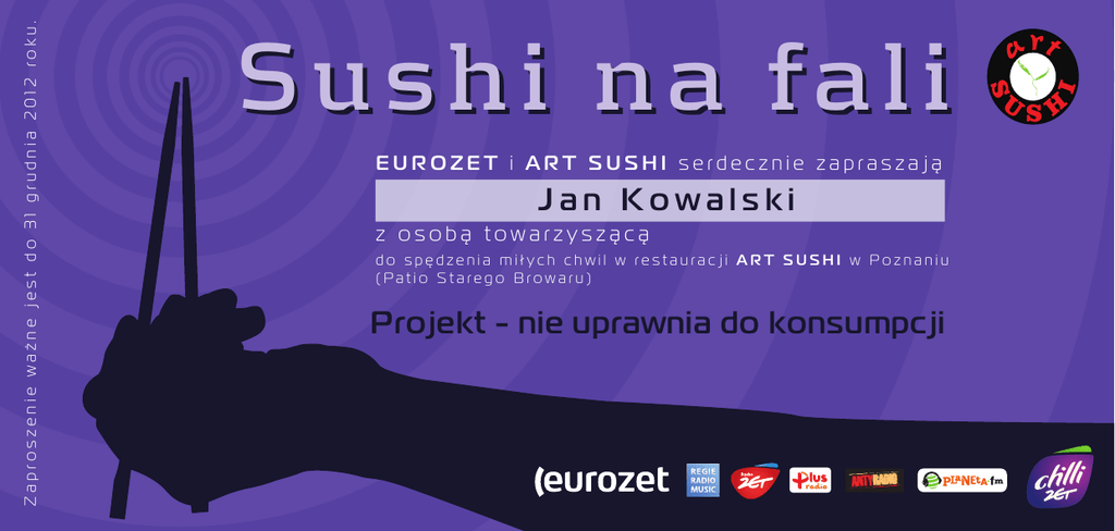 Zaproszenie wa¿ne jest do 31 grudnia 2012 roku. Sushi na fali EUROZET i ART SUSHI serdecznie zapraszaj¹ Jan Kowalski z osob¹ towarzysz¹c¹ do spêdzenia mi³ych chwil w restauracji ART SUSHI w Poznaniu ( Pa t i o S t a r e g o B r o w a r u ) Projekt - nie uprawnia do konsumpcji