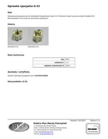 Oprawka specjalna G-23 Opis Oprawka przeznaczona jest do świetlówek kompaktowych typu G-23. Mocować należy za pomocą dwóch wkrętów M3, blachowkrętów lub za pomocą zatrzasków sprężystych. Galeria Oprawka G-23 Oprawka G-23 Dane techniczne typ: ON-1 natężenie I: 1 A napięcie znamionowe U: 250 V Aprobaty i certyfikaty Oprawki spełniają wymagania normy PN-93/E-93400. Kod produktu: G-23 Poznań, 2.03.2017 Elektra Plus Maciej Połczyński ul. Grudzieniec 66, 60-601 Poznań tel/fax: (+48 61) 84-84-178 (Biuro Obsługi Klienta) tel: (+48 61) 84-84-177 (Dział Techniczny) e-mail: [email protected] internet: www.elektraplus.net Strona 1 z 1