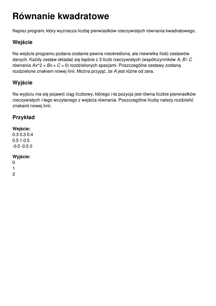 Równanie kwadratowe Napisz program, który wyznacza liczbę pierwiastków rzeczywistych równania kwadratowego. Wejście Na wejście programu podana zostanie pewna nieokreślona, ale niewielka ilość zestawów danych. Każdy zestaw składać się będzie z 3 liczb rzeczywistych (współczynników A, B i C równania Ax^2 + Bx + C = 0) rozdzielonych spacjami. Poszczególne zestawy zostaną rozdzielone znakiem nowej linii. Można przyjąć, że A jest różne od zera. Wyjście Na wyjściu ma się pojawić ciąg liczbowy, którego i-ta pozycja jest równa liczbie pierwiastków rzeczywistych i-tego wczytanego z wejścia równania. Poszczególne liczby należy rozdzielić znakami nowej linii. Przykład Wejście: 0.3 0.3 0.4 0.5 1 0.5 -0.5 -0.5 0 Wyjście: 0 1 2