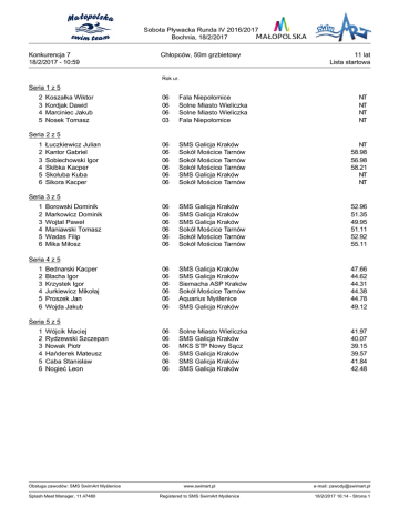 Sobota Pływacka Runda IV 2016/2017 Bochnia, 18/2/2017 Konkurencja 7 18/2/2017 - 10:59 Chłopców, 50m grzbietowy 11 lat Lista startowa Rok ur. Seria 1 z 5 2 3 4 5 Koszałka Wiktor Kordjak Dawid Marciniec Jakub Nosek Tomasz 06 06 06 03 Fala Niepołomice Solne Miasto Wieliczka Solne Miasto Wieliczka Fala Niepołomice 06 06 06 06 06 06 SMS Galicja Kraków Sokół Mościce Tarnów Sokół Mościce Tarnów Sokół Mościce Tarnów SMS Galicja Kraków Sokół Mościce Tarnów NT 58.98 56.98 58.21 NT NT 06 06 06 06 06 06 SMS Galicja Kraków SMS Galicja Kraków SMS Galicja Kraków Sokół Mościce Tarnów Sokół Mościce Tarnów Sokół Mościce Tarnów 52.96 51.35 49.95 51.11 52.92 55.11 06 06 06 06 06 06 SMS Galicja Kraków SMS Galicja Kraków Siemacha ASP Kraków Sokół Mościce Tarnów Aquarius Myślenice SMS Galicja Kraków 47.66 44.62 44.31 44.38 44.78 49.12 06 06 06 06 06 06 Solne Miasto Wieliczka SMS Galicja Kraków MKS STP Nowy Sącz SMS Galicja Kraków SMS Galicja Kraków SMS Galicja Kraków 41.97 40.07 39.15 39.57 41.84 42.48 NT NT NT NT Seria 2 z 5 1 2 3 4 5 6 Łuczkiewicz Julian Kantor Gabriel Sobiechowski Igor Skibka Kacper Skołuba Kuba Sikora Kacper Seria 3 z 5 1 2 3 4 5 6 Borowski Dominik Markowicz Dominik Wojtal Paweł Maniawski Tomasz Wadas Filip Mika Miłosz Seria 4 z 5 1 2 3 4 5 6 Bednarski Kacper Blacha Igor Krzystek Igor Jurkiewicz Mikołaj Proszek Jan Wojda Jakub Seria 5 z 5 1 2 3 4 5 6 Wójcik Maciej Rydzewski Szczepan Nowak Piotr Hańderek Mateusz Caba Stanisław Nogieć Leon Obsługa zawodów: SMS SwimArt Myślenice Splash Meet Manager, 11.47480 www.swimart.pl e-mail: [email protected] Registered to SMS SwimArt Myślenice 18/2/2017 16:14 - Strona 1