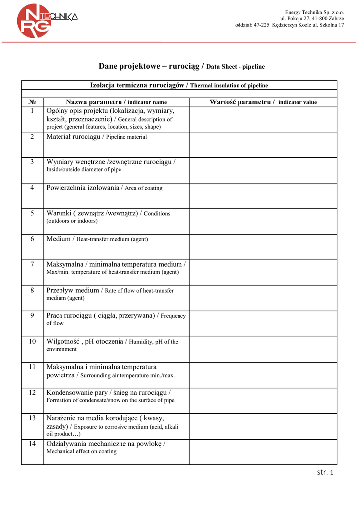 Energy Technika Sp. z o.o. ul. Pokoju 27, 41-800 Zabrze oddział: 47-225 Kędzierzyn Koźle ul. Szkolna 17 Dane projektowe – rurociąg / Data Sheet - pipeline Izolacja termiczna rurociągów / Thermal insulation of pipeline № 1 Nazwa parametru / indicator name Ogólny opis projektu (lokalizacja, wymiary, kształt, przeznaczenie) / General description of Wartość parametru / indicator value project (general features, location, sizes, shape) 2 Materiał rurociągu / Pipeline material 3 Wymiary wenętrzne /zewnętrzne rurociągu / Inside/outside diameter of pipe 4 Powierzchnia izolowania / Area of coating 5 Warunki ( zewnątrz /wewnątrz) / Conditions (outdoors or indoors) 6 Medium / Heat-transfer medium (agent) 7 Maksymalna / minimalna temperatura medium / Max/min. temperature of heat-transfer medium (agent) 8 Przepływ medium / Rate of flow of heat-transfer medium (agent) 9 Praca rurociągu ( ciągła, przerywana) / Frequency of flow 10 Wilgotność , pH otoczenia / Humidity, pH of the environment 11 Maksymalna i minimalna temperatura powietrza / Surrounding air temperature min./max. 12 Kondensowanie pary / śnieg na rurociągu / Formation of condensate/snow on the surface of pipe 13 Narażenie na media korodujące ( kwasy, zasady) / Exposure to corrosive medium (acid, alkali, oil product…) 14 Odziaływania mechaniczne na powłokę / Mechanical effect on coating str. 1 Energy Technika Sp. z o.o. ul. Pokoju 27, 41-800 Zabrze oddział: 47-225 Kędzierzyn Koźle ul. Szkolna 17 15 Obecność starych izolacji / Presence of old coating 16 Obecność wasrtw farby na powierzchni / Presence of paint coating. 17 Obcenośc rdzy na powierzchni / Presence of corrosion on the surface of pipe 18 Wymagany kolor / Color matching required 19 Główny cel zastosowania izolacji termicznej / Main purpose of thermal insulation Kierownik Projektu ( Imię Nazwisko, tel.) / Manager (Full name, tel.) str. 2