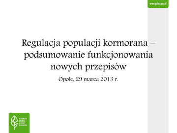 Regulacja populacji kormorana – podsumowanie funkcjonowania nowych przepisów Opole, 29 marca 2013 r. Chronione gatunki zwierząt powodujące straty w rybostanie Zgodnie z rozporządzeniem Ministra Środowiska z dnia 12 października 2011 r. w sprawie ochrony gatunkowej zwierząt (Dz. U. Nr 237, poz. 1419), ochronie częściowej podlegają: Źródło: internet - kormoran czarny Phalacrocorax carbo, - czapla siwa Ardea cinerea, - wydra Lutra lutra. Źródło: internet Źródło: internet Zakazy obowiązujące w stosunku do chronionych gatunków zwierząt Zgodnie z § 7 rozporządzenia Ministra Środowiska z dnia 12 października 2011 r. w sprawie ochrony gatunkowej zwierząt, w odniesieniu do gatunków zwierząt chronionych obowiązują m.in. poniższe zakazy: - umyślnego zabijania, okaleczania i chwytania, - zbierania, przetrzymywania i posiadania okazów gatunków, - umyślnego niszczenia ich jaj, postaci młodocianych, - niszczenia ich gniazd, nor i innych schronień, - umyślnego płoszenia i niepokojenia. Źródło: internet Odstępstwa od zakazów Regionalny dyrektor ochrony środowiska, na mocy art. 56 ust. 2 pkt 1 ustawy z dnia 16 kwietnia 2004 r. o ochronie przyrody (Dz. U. z 2009 r. Nr 151, poz. 1220, z późn. zm.) na obszarze swojego działania, może zezwolić na odstępstwa od zakazów obowiązujących w stosunku do gatunków objętych ochroną częściową. Odstępstwa od zakazów Zezwolenie na odstępstwa od zakazów może być wydane w przypadku spełnienia łącznie 3 warunków: 1. braku rozwiązań alternatywnych, 2. jeżeli nie są szkodliwe dla zachowania we właściwym stanie ochrony dziko występujących populacji chronionych gatunków zwierząt oraz 3. gdy spełniona jest jedna z przesłanek, o których mowa w art. 56 ust. 4 pkt 1 – 7 ustawy o ochronie przyrody wynikają z konieczności ograniczenia poważnych szkód w odniesieniu do upraw rolnych, inwentarza żywego, lasów, rybostanu, wody lub innych rodzajów mienia (art. 56 ust. 4 pkt 2 ustawy) Wniosek o wydanie zezwolenia Zezwolenie na wykonanie czynności zakazanych w stosunku do chronionych gatunków zwierząt wydaje się na wniosek strony, który musi zawierać zgodnie z art. 56 ust. 6 ustawy o ochronie przyrody: - imię, nazwisko i adres albo nazwę i siedzibę wnioskodawcy, - cel wykonania wnioskowanych czynności, - opis czynności, na którą może być wydane zezwolenie, - nazwę gatunku lub gatunków, których będą dotyczyć działania, w języku łacińskim i polskim, jeżeli polska nazwa istnieje, - liczbę lub ilość osobników, których dotyczy wniosek, o ile jest to możliwe do ustalenia, - wskazanie sposobu, metody i stosowanych urządzeń do chwytania, odławiania lub zabijania zwierząt lub sposobu wykonania innych czynności, na które może być wydane zezwolenie, a także miejsca i czasu wykonania czynności oraz wynikających z tego zagrożeń, - wskazanie podmiotu, który będzie chwytał lub zabijał zwierzęta. Zezwolenie RDOŚ w Opolu – przykładowe warunki zezwolenia Przykładowe warunki określające sposób wykonania czynności, np. odstrzał i płoszenie kormorana czarnego: I. płoszenie w terminie od ....... do ........ x osobników kormorana czarnego Phalacrocorax carbo na terenie ............... położonego na działkach nr .......................... obręb ..................., gmina ...................., II. zabicie w terminie od ........ do ........... x osobników kormorana czarnego na terenie ...................., III. zebranie i przetrzymywanie odstrzelonych martwych ptaków ww. gatunku, pod następującymi warunkami określającymi sposób wykonania wnioskowanych czynności: 1. płoszenie osobników kormorana czarnego na terenie ................ prowadzone będzie przy użyciu .............., 2. płoszenie osobników kormorana czarnego nie będzie prowadzone prewencyjnie; jest ono dozwolone dopiero w przypadku faktycznego zaobserwowania na obiekcie stawowym obecności osobników przedmiotowych gatunku, 3. w momencie zaobserwowania nad stawami osobników bielika/orlika krzykliwego/bociana czarnego należy zaprzestać prowadzenia ww. czynności, 4. zabijanie osobników kormorana czarnego na ww. terenie prowadzone będzie z grobli stawowych i dotyczyć będzie wyłącznie ptaków w locie, przy użyciu broni myśliwskiej z zachowaniem zasad określonych w art. 54 ustawy z dnia 16 kwietnia 2004 r. o ochronie przyrody (Dz. U. z 2009 r. Nr 151, poz. 1220, z późn. zm.), 5. przed przystąpieniem do czynności związanej z odstrzałem osobników kormorana czarnego poinformowany o tym fakcie zostanie właściwe miejscowo koło łowieckie, 6. odstrzału dokonywać będą upoważnieni członkowie Polskiego Związku Łowieckiego, 7. martwe ptaki, do czasu przekazania do utylizacji, będą przetrzymywane w chłodni, 8. zabite osobniki zostaną przekazane do utylizacji podmiotowi uprawnionemu do utylizacji odpadów zwierzęcych, Zezwolenie RDOŚ w Opolu Każdy podmiot, który otrzyma zezwolenie regionalnego dyrektora ochrony środowiska jest zobowiązany do przedłożenia we wskazanym terminie sprawozdania z wykonania warunków decyzji. Odstępstwa od zakazów zarządzenia Regionalny dyrektor ochrony środowiska może zezwolić na obszarze swojego działania, na czas określony, nie dłuższy niż 5 lat, w drodze aktu prawa miejscowego w formie zarządzenia, w stosunku do bobra europejskiego, kormorana czarnego oraz czapli siwej, na czynności podlegające zakazom (art. 56a ust. 1 ustawy o ochronie przyrody). Powyższe zarządzenie może być wydane w przypadku: 1. braku rozwiązań alternatywnych, 2. jeżeli czynności, których dotyczy zarządzenie, nie są szkodliwe dla zachowania we właściwym stanie ochrony dziko występujących populacji gatunków objętych zarządzeniem, 3. gdy wnioskowane czynności leżą w interesie zdrowia lub bezpieczeństwa powszechnego lub w przypadku kormorana czarnego oraz czapli siwej – wynika to z konieczności ograniczenia poważnych szk