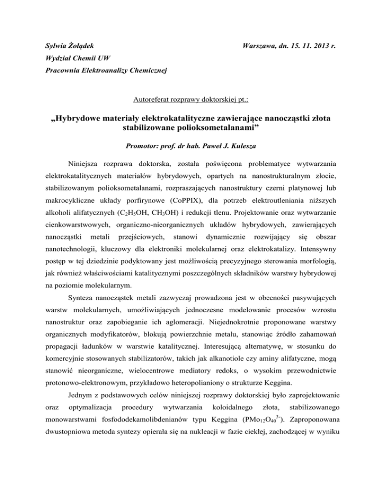 Sylwia Żołądek Warszawa, dn. 15. 11. 2013 r. Wydział Chemii UW Pracownia Elektroanalizy Chemicznej Autoreferat rozprawy doktorskiej pt.: „Hybrydowe materiały elektrokatalityczne zawierające nanocząstki złota stabilizowane polioksometalanami” Promotor: prof. dr hab. Paweł J. Kulesza Niniejsza rozprawa doktorska, została poświęcona problematyce wytwarzania elektrokatalitycznych materiałów hybrydowych, opartych na nanostrukturalnym złocie, stabilizowanym polioksometalanami, rozpraszających nanostruktury czerni platynowej lub makrocykliczne układy porfirynowe (CoPPIX), dla potrzeb elektroutleniania niższych alkoholi alifatycznych (C2H5OH, CH3OH) i redukcji tlenu. Projektowanie oraz wytwarzanie cienkowarstwowych, organiczno-nieorganicznych układów hybrydowych, zawierających nanocząstki metali przejściowych, stanowi dynamicznie rozwijający się obszar nanotechnologii, kluczowy dla elektroniki molekularnej oraz elektrokatalizy. Intensywny postęp w tej dziedzinie podyktowany jest możliwością precyzyjnego sterowania morfologią, jak również właściwościami katalitycznymi poszczególnych składników warstwy hybrydowej na poziomie molekularnym. Synteza nanocząstek metali zazwyczaj prowadzona jest w obecności pasywujących warstw molekularnych, umożliwiających jednoczesne modelowanie procesów wzrostu nanostruktur oraz zapobieganie ich aglomeracji. Niejednokrotnie proponowane warstwy organicznych modyfikatorów, blokują powierzchnie metalu, stanowiąc źródło zahamowań propagacji ładunków w warstwie katalitycznej. Interesującą alternatywę, w stosunku do komercyjnie stosowanych stabilizatorów, takich jak alkanotiole czy aminy alifatyczne, mogą stanowić nieorganiczne, wielocentrowe mediatory redoks, o wysokim przewodnictwie protonowo-elektronowym, przykładowo heteropolianiony o strukturze Keggina. Jednym z podstawowych celów niniejszej rozprawy doktorskiej było zaprojektowanie oraz optymalizacja procedury wytwarzania koloidalnego monowarstwami fosfododekamolibdenianów typu Keggina złota, (PMo12O403-). stabilizowanego Zaproponowana dwustopniowa metoda syntezy opierała się na nukleacji w fazie ciekłej, zachodzącej w wyniku redukcji prekursora (HAuCl4) przez wielocentrowy mediator redoks w postaci heteropolibłękitu H3[H4P(MoV)4(MoVI)8O40]. Idea wykorzystania anionowych klasterów fosfododekamolibdenianów, jednocześnie jako reduktora oraz stabilizatora, została zrealizowana w oparciu o ich zdolność do ulegania szybkim i odwracalnym procesom przeniesienia elektronów, bez reorganizacji strukturalnej, przy jednoczesnej skłonności do spontanicznej adsorpcji na powierzchniach metali. Innym z moich głównych celów badawczych było zweryfikowanie wpływu parametrów operacyjnych syntezy na morfologię oraz wielkość pozyskiwanych nanostruktur złota. Zmiany stężenia prekursora lub reduktora oraz temperatur mieszanin modyfikujących, umożliwiły mi znalezienie korelacji pomiędzy zadanymi warunkami w przestrzeni reakcyjnej, a ilością struktur pseudo-sferycznych, w stosunku do anizotropowych układów płytkowych złota. Charakterystyka morfologii nanocząstek złota została przeprowadzona przy użyciu technik: skaningowej mikroskopii elektronowej oraz transmisyjnej mikroskopii elektronowej i skorelowana z widmami odpowiedzi plazmonów powierzchniowych złota, zarejestrowanymi techniką UV-Vis. Natura oddziaływania samoorganizowanych warstw molekularnych polioksometalanów z powierzchnią nanocząstek złota, została zbadana techniką spektroskopii w podczerwieni z odbiciem zewnętrznym (IRRAS), podczas gdy elementarna analiza jakościowa i ilościowa składu pierwiastkowego została wykonana metodą dyspersji promieniowania rentgenowskiego (EDS). W pracy doktorskiej zajęłam się również problemem wytworzenia wielofunkcyjnej matrycy hybrydowej zdolnej do specyficznej aktywacji protoporfiryny kobaltowej w procesie elektroredukcji tlenu. Utrudnienia geometryczne w mechanizmie mostkowej adsorpcji cząsteczek O2 na centrach kobaltowych, skoordynowanych z porfiryną, skutkują ograniczoną elektronowością procesu, z wytworzeniem nadtlenku wodoru, jako dominującego produktu końcowego. Generowany H2O2 powoduje degradację powłoki katalizatora przyczyniając się do jego postępującej dezaktywacji. Jako materiał nośny dla makrocyklicznego katalizatora kobaltowego zaproponowałam zorganizowany pseudo-dwuwymiarowy film hybrydowy zbudowany z ultracienkich powłok polimeru przewodzącego i zawierający rozproszone nanocząstki złota stabilizowane fosfododekamolibdenianami Keggina. Usieciowane organiczno-nieorganiczne materiały hybrydowe zostały osadzone na stacjonarnej elektrodzie węglowej w oparciu o sekwencyjną adsorpcję przeciwnie naładowanych polielektrolitów (monowarstw nanocząstek złota oraz kationowych ugrupowań monomerów, polimeryzowanych metodą chemiczno-elektrochemiczną na granicy faz). Metoda warstwowego rozbudowywania kompozytów stworzyła możliwość kontrolowanego wzrostu stężenia powierzchniowego nanostrukturalnego złota, przy zachowaniu jego wysokiej dyspersji. Zorganizowane wielowarstwy nanocząstek złota oraz polimerów przewodzących były badane metodami elektrochemicznymi pod kątem: stabilności fizykochemicznej, zdolności do efektywnej mediacji ładunków oraz specyficznej reaktywności względem elektroredukcji nadtlenku wodoru, niepożądanego produktu elektroredukcji tlenu. Spotęgowanie aktywności katalitycznej protoporfiryny kobaltowej w procesie elektroredukcji tlenu, towarzyszące jej osadzeniu na wielowarstwowym podłożu zawierającym naprzemiennie nanocząski złota (stabilizowane polioksometalanami) oraz warstwy polipirolu, przypisano skumulowaniu wysokiej aktywności katalitycznej tej matrycy względem redukcji H2O2, wraz ze zdolnością polipirolu do ulegania specyficznym oddziaływaniom π-elektronowym z układem sprzężonych pierścieni w makrocyklu protoporfiryny kobaltow