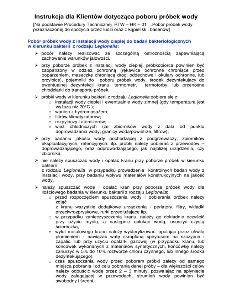 Instrukcja dla Klientów dotycząca poboru próbek wody [Na podstawie Procedury Technicznej PTW – HK – 01 „Pobór próbek wody przeznaczonej do spożycia przez ludzi oraz z kąpielisk i basenów] Pobór próbek wody z instalacji wody ciepłej do badań bakteriologicznych w kierunku bakterii z rodzaju Legionella: pobór należy realizować ze zachowanie warunków jałowości, szczególną ostrożnością zapewniającą przy poborze próbek z instalacji wody ciepłej, próbkobiorca powinien być zaopatrzony w odzież ochronną (rękawice ochronne chroniące przed poparzeniem, maseczkę chroniącą drogi oddechowe i okulary ochronne, lub przyłbice), pojemniki do poboru próbek wody, środek dezynfekujący do ewentualnej dezynfekcji kranu, termometr, termotorby, lub przenośne chłodziarki do transportu próbek, próbki wody w kierunku bakterii z rodzaju Legionella pobiera się z: o instalacji wody ciepłej i ewentualnie wody zimnej (gdy temperatura jest wyższa niż 20°C ); o wanien z hydromasażem; o filtrów klimatyzatorów; o rozpylaczy i atomizerów; o wież chłodniczych (ze zbiorników wody z dala od punktu doprowadzenia wody; granicy woda/powietrze; filtrów); przy badaniu jakości wody pochodzącej z podgrzewaczy, zbiorników eksploatacyjnych, retencyjnych, itp. próbki należy pobierać z przewodów – doprowadzającego, oraz odprowadzającego, jak najbliżej urządzenia, czy zbiornika, nie należy spuszczać wody i opalać kranu przy poborze próbek w kierunku bakterii z rodzaju Legionella w przypadku prowadzenia kontrolnych badań wody z instalacji wody, przy badaniu wpływu materiałów konstrukcyjnych na jakość wody, należy spuszczać wodę i opalać kran przy poborze próbek wody dla ilościowego badania w kierunku bakterii z rodzaju Legionella: o przed rozpoczęciem spuszczania wody i pobierania próbek należy zdjąć z kranu wszystkie dodatkowe urządzenia - perlatory, filtry, wkładki przeciwrozpryskowe, rurki przedłużające itp., o w przypadku zanieczyszczenia kranu, należy go dokładnie oczyścić przy użyciu mydła, a następnie opłukać wodą, osuszyć czystą ściereczką, o wylot metalowego kranu należy wysterylizować, opalając przez chwilę płomieniem - nawiązać watę skroploną spirytusem na szczypce i zapalić, lub przy użyciu opalarki gazowej (w przypadku kranu, lub końcówek wykonanych z materiałów syntetycznych, końcówkę należy zanurzyć w 5% do 10% roztworze chloru czynnego, lub innego środka dezynfekującego), o czas spuszczania wody przed poborem próbki zależy od samego miejsca pobrania i od celu pobrania danej próby – dla większości celów należy odpuścić wodę przez 2 – 3 minuty, pozwalając na spłynięcie wody zalegającej w przewodach, strumień wody powinien być swobodny i średni, pobór wody ze zbiorników, wanien z hydromasażem, basenów termalnych należy wykonać poprzez zanurzenie sterylnych, owiniętych pojemników, bezpośrednio przed poborem jałowy pojemnik należy odwinąć z papieru, lub folii aluminiowej nie dotykając wewnętrznej części, ani brzegów szyjki butelki, nie wolno dotykać korka i szyjki naczynia, należy również usunąć papierowy pasek znajdujący się pod korkiem, tak aby nie wpadł do środka naczynia, napełnić naczynie tak, aby po zamknięciu korkiem pozostawić nad powierzchnią wody przestrzeń z powietrzem, która umożliwi mieszanie próbki (do około ¼ pojemności pojemnika), niezwłocznie zamknąć pojemnik korkiem trzymanym przez kapturek i chronionym w czasie poboru przed zanieczyszczeniem i zawinąć go w papier, w którym był poddany sterylizacji, jeśli pobierana woda zawiera środki dezynfekcyjne, należy przed pobraniem dodać do pojemnika czynnik inaktywujący. Ze względu na wrażliwość bakterii z rodzaju Legionella na jony sodu, zaleca się w tym celu zastosowanie roztworu tiosiarczanu potasu w ilości 0,1 ml 10% roztworu na każde 100 ml próbki, która neutralizuje w wystarczająco szybkim czasie około 2 mg pozostałego chloru (w przypadku wyższych koncentracji chloru, należy odpowiednio zwiększyć podaną ilość tiosiarczanu potasu), należy unikać ”krzyżowego zanieczyszczenia” – zmieniać rękawiczki przy każdym poborze, sterylizować termometr po wykonaniu każdego pomiaru, stosować pojemiki sterylne również po zewnętrznej stronie, stosować osobny pojemnik do pomiaru temperatury, próbki wody po pobraniu należy niezwłocznie dostarczyć do laboratorium najlepiej w ciągu 24 godzin, na czas transportowania, naczynia z próbkami należy odpowiednio zabezpieczyć przed wysokimi temperaturami i nasłonecznieniem, zalecana temperatura transportu to 6°C - 18°C, w celu utrzymania odpowiedniej temperatury podczas transportu prób, należy stosować termotorby, lub przenośne chłodziarki, unikając zbyt dużego wychłodzenia, Prawidłowe pobieranie próbek jest warunkiem koniecznym dla uzyskania wiarygodnych wyników badań! Klient samodzielnie pobierając i dostarczając próbki wody bierze całkowitą odpowiedzialność za etap poboru i transportu oraz stan próbki przeznaczonej do badań
