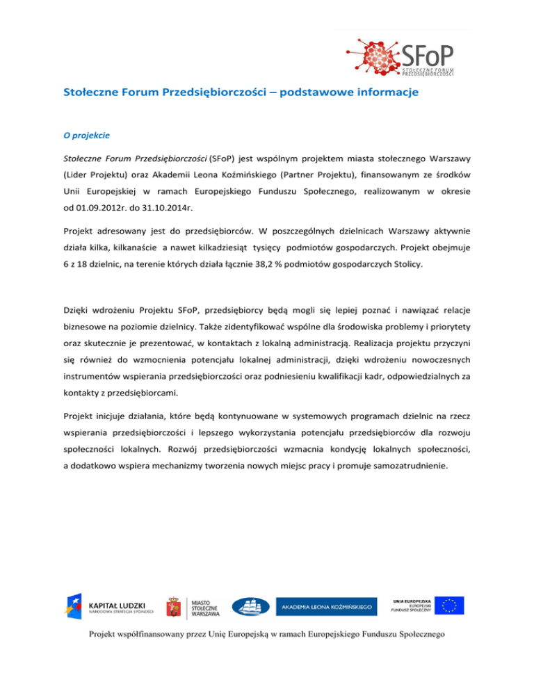 Stołeczne Forum Przedsiębiorczości – podstawowe informacje O projekcie Stołeczne Forum Przedsiębiorczości (SFoP) jest wspólnym projektem miasta stołecznego Warszawy (Lider Projektu) oraz Akademii Leona Koźmińskiego (Partner Projektu), finansowanym ze środków Unii Europejskiej w ramach Europejskiego Funduszu Społecznego, realizowanym w okresie od 01.09.2012r. do 31.10.2014r. Projekt adresowany jest do przedsiębiorców. W poszczególnych dzielnicach Warszawy aktywnie działa kilka, kilkanaście a nawet kilkadziesiąt tysięcy podmiotów gospodarczych. Projekt obejmuje 6 z 18 dzielnic, na terenie których działa łącznie 38,2 % podmiotów gospodarczych Stolicy. Dzięki wdrożeniu Projektu SFoP, przedsiębiorcy będą mogli się lepiej poznać i nawiązać relacje biznesowe na poziomie dzielnicy. Także zidentyfikować wspólne dla środowiska problemy i priorytety oraz skutecznie je prezentować, w kontaktach z lokalną administracją. Realizacja projektu przyczyni się również do wzmocnienia potencjału lokalnej administracji, dzięki wdrożeniu nowoczesnych instrumentów wspierania przedsiębiorczości oraz podniesieniu kwalifikacji kadr, odpowiedzialnych za kontakty z przedsiębiorcami. Projekt inicjuje działania, które będą kontynuowane w systemowych programach dzielnic na rzecz wspierania przedsiębiorczości i lepszego wykorzystania potencjału przedsiębiorców dla rozwoju społeczności lokalnych. Rozwój przedsiębiorczości wzmacnia kondycję lokalnych społeczności, a dodatkowo wspiera mechanizmy tworzenia nowych miejsc pracy i promuje samozatrudnienie. Projekt współfinansowany przez Unię Europejską w ramach Europejskiego Funduszu Społecznego Idea wsparcia przedsiębiorczości lokalnej zajmuje podstawowe miejsce w koncepcji funkcjonowania każdej zgłoszonej do projektu dzielnicy. W realizacji projektu będziemy wykorzystywać doświadczenia i wzorce, które sprawdziły się już w innych krajach. W tym celu korzystamy ze wsparcia samorządów miast partnerskich i zagranicznych specjalistów, zajmujących się tą problematyką . Jaki cel nam przyświeca – stymulowanie relacji sieciowych przedsiębiorców na poziomie lokalnym (networking) Networking, czyli budowanie sieci kontaktów przedsiębiorców za pomocą ciągłych relacji, których celem jest wymiana informacji, doświadczeń, udzielanie sobie wsparcia i pomocy ale także do identyfikowanie możliwości rozwijania biznesu z partnerami z tej samej dzielnicy. Networking w swoich założeniach bazuje na uznanych na świecie wzorcach polegających na budowaniu stabilnego rozwoju firm – uczestników sieci, poprzez wzmacnianie zaufania i uzyskiwanie wzajemnych korzyści między poszczególnymi jej uczestnikami. Korzyści networkingu można Projekt współfinansowany przez Unię Europejską w ramach Europejskiego Funduszu Społecznego podsumować w stwierdzeniu: poznasz więcej ludzi z którymi możesz robić interesy, a którzy znają tych innych , z którymi także powinieneś robić interesy. Networking odgrywa szczególną rolę w rozwoju początkujących firm, dla których podstawową barierą jest właśnie brak kontaktów i niemożność dotarcia ze swoją ofertą, do potencjalnych kontrahentów. Jaki cel nam przyświeca – wspieranie grup inicjatywnych Zakładamy, że w wyniku podjętych w ramach projektu działań powstaną Dzielnicowe Kluby Przedsiębiorców. Tego typu grupy inicjatywne mogą mieć charakter ogólny, ale także łączyć przedsiębiorców zainteresowanych wymianą doświadczeń w określonych branżach (np. sektory kreatywne) czy rodzajach działalności (np. eksport). Co zyskuje przedsiębiorca? Nawiązanie biznesowych kontaktów na terenie własnej dzielnicy w wyniku uczestnictwa w cyklicznych spotkaniach w dzielnicach (ogólnych i tematycznych). W ramach projektu SFoP władza samorządowa zapewni infrastrukturę (miejsce spotkań), zaś wsparcie merytoryczne udzieli kadra Akademii Leona Koźmińskiego. Dedykowany dzielnicowy portal społecznościowy przedsiębiorców, będący platformą do nawiązywania kontaktów o charakterze biznesowym oraz do podejmowania inicjatyw społecznych. Przedsiębiorcy aktywni na terenie danej dzielnicy będą mogli także zaprezentować swoją firmę na portalu. Współpraca przedsiębiorców z lokalną administrację (Urzędem Dzielnicowym) Zakładamy, że dzięki stworzeniu lokalnych sieci współpracy wśród przedsiębiorców wprowadzone zostaną skuteczniejsze kanały prezentacji wspólnych interesów w relacji z samorządem lokalnym. Oprócz bieżących spraw, które przedsiębiorcy załatwiają indywidualnie w Urzędach Dzielnicowych Projekt współfinansowany przez Unię Europejską w ramach Europejskiego Funduszu Społecznego (np. rejestracja działalności gospodarczej, zezwolenia i koncesje) istnieje cała gama zagadnień, które dotykają wszystkich prowadzących własną działalność gospodarczą. Chodzi tu przykładowo o lokalne plany zagospodarowania czy też lokalne programy inwestycyjne. Jak dotąd, środowisko przedsiębiorców nie posiada sformalizowanych metod uzgodnienia i prezentowania własnych interesów. Dla usprawnienia kontaktów i przepływu informacji między przedsiębiorcami a Urzędami Dzielnicowymi, powstały stanowiska Animatorów współpracy z MŚP, a także narzędzia w postaci dzielnicowych baz danych. Osoby te korzystają z bieżącego wsparcia kadry Akademii Leona Koźmińskiego. Realizacja projektu przyczyni się do wzmocnienia potencjału lokalnej administracji, w kształtowaniu skutecznej polityki wspierania przedsiębiorczości, na terenie dzielnicy. Oprócz stanowiska Animatora współpracy z MŚP, zostaną wypracowane narzędzia diagnostyczne do oceny aktualnego stanu oraz założenia do dzielnicowych strategii rozwoju przedsiębiorczości. Wypracowanie nowych form współpracy, na styku przedsiębiorcy – lokalna administracja, usprawni reagowanie na zmiany gospodarcze. Projekt wspó