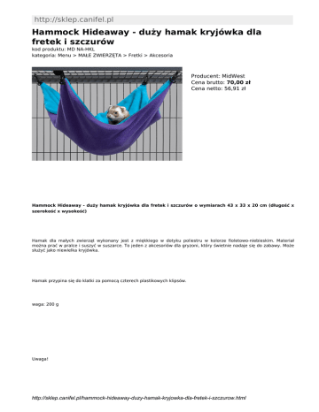 http://sklep.canifel.pl Hammock Hideaway - duży hamak kryjówka dla fretek i szczurów kod produktu: MD NA-HKL kategoria: Menu > MAŁE ZWIERZĘTA > Fretki > Akcesoria Producent: MidWest Cena brutto: 70,00 zł Cena netto: 56,91 zł Hammock Hideaway - duży hamak kryjówka dla fretek i szczurów o wymiarach 43 x 33 x 20 cm (długość x szerokość x wysokość) Hamak dla małych zwierząt wykonany jest z miękkiego w dotyku poliestru w kolorze fioletowo-niebieskim. Materiał można prać w pralce i suszyć w suszarce. To jeden z akcesoriów dla gryzoni, który świetnie nadaje się do zabawy. Może służyć jako niewielka kryjówka. Hamak przypina się do klatki za pomocą czterech plastikowych klipsów. waga: 200 g Uwaga! http://sklep.canifel.pl/hammock-hideaway-duzy-hamak-kryjowka-dla-fretek-i-szczurow.html Jeśli zabawka ulegnie porwaniu po długotrwałym użytkowaniu należy ją niezwłocznie wyrzucić i zastąpić nową. http://sklep.canifel.pl/hammock-hideaway-duzy-hamak-kryjowka-dla-fretek-i-szczurow.html