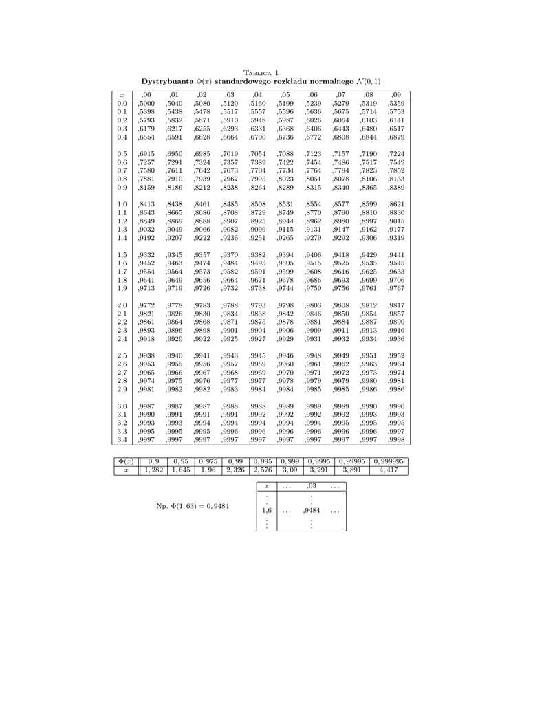 Tablica 1 Dystrybuanta Φ(x) standardowego rozkładu normalnego N (0, 1) x 0,0 0,1 0,2 0,3 0,4 ,00 ,5000 ,5398 ,5793 ,6179 ,6554 ,01 ,5040 ,5438 ,5832 ,6217 ,6591 ,02 ,5080 ,5478 ,5871 ,6255 ,6628 ,03 ,5120 ,5517 ,5910 ,6293 ,6664 ,04 ,5160 ,5557 ,5948 ,6331 ,6700 ,05 ,5199 ,5596 ,5987 ,6368 ,6736 ,06 ,5239 ,5636 ,6026 ,6406 ,6772 ,07 ,5279 ,5675 ,6064 ,6443 ,6808 ,08 ,5319 ,5714 ,6103 ,6480 ,6844 ,09 ,5359 ,5753 ,6141 ,6517 ,6879 0,5 0,6 0,7 0,8 0,9 ,6915 ,7257 ,7580 ,7881 ,8159 ,6950 ,7291 ,7611 ,7910 ,8186 ,6985 ,7324 ,7642 ,7939 ,8212 ,7019 ,7357 ,7673 ,7967 ,8238 ,7054 ,7389 ,7704 ,7995 ,8264 ,7088 ,7422 ,7734 ,8023 ,8289 ,7123 ,7454 ,7764 ,8051 ,8315 ,7157 ,7486 ,7794 ,8078 ,8340 ,7190 ,7517 ,7823 ,8106 ,8365 ,7224 ,7549 ,7852 ,8133 ,8389 1,0 1,1 1,2 1,3 1,4 ,8413 ,8643 ,8849 ,9032 ,9192 ,8438 ,8665 ,8869 ,9049 ,9207 ,8461 ,8686 ,8888 ,9066 ,9222 ,8485 ,8708 ,8907 ,9082 ,9236 ,8508 ,8729 ,8925 ,9099 ,9251 ,8531 ,8749 ,8944 ,9115 ,9265 ,8554 ,8770 ,8962 ,9131 ,9279 ,8577 ,8790 ,8980 ,9147 ,9292 ,8599 ,8810 ,8997 ,9162 ,9306 ,8621 ,8830 ,9015 ,9177 ,9319 1,5 1,6 1,7 1,8 1,9 ,9332 ,9452 ,9554 ,9641 ,9713 ,9345 ,9463 ,9564 ,9649 ,9719 ,9357 ,9474 ,9573 ,9656 ,9726 ,9370 ,9484 ,9582 ,9664 ,9732 ,9382 ,9495 ,9591 ,9671 ,9738 ,9394 ,9505 ,9599 ,9678 ,9744 ,9406 ,9515 ,9608 ,9686 ,9750 ,9418 ,9525 ,9616 ,9693 ,9756 ,9429 ,9535 ,9625 ,9699 ,9761 ,9441 ,9545 ,9633 ,9706 ,9767 2,0 2,1 2,2 2,3 2,4 ,9772 ,9821 ,9861 ,9893 ,9918 ,9778 ,9826 ,9864 ,9896 ,9920 ,9783 ,9830 ,9868 ,9898 ,9922 ,9788 ,9834 ,9871 ,9901 ,9925 ,9793 ,9838 ,9875 ,9904 ,9927 ,9798 ,9842 ,9878 ,9906 ,9929 ,9803 ,9846 ,9881 ,9909 ,9931 ,9808 ,9850 ,9884 ,9911 ,9932 ,9812 ,9854 ,9887 ,9913 ,9934 ,9817 ,9857 ,9890 ,9916 ,9936 2,5 2,6 2,7 2,8 2,9 ,9938 ,9953 ,9965 ,9974 ,9981 ,9940 ,9955 ,9966 ,9975 ,9982 ,9941 ,9956 ,9967 ,9976 ,9982 ,9943 ,9957 ,9968 ,9977 ,9983 ,9945 ,9959 ,9969 ,9977 ,9984 ,9946 ,9960 ,9970 ,9978 ,9984 ,9948 ,9961 ,9971 ,9979 ,9985 ,9949 ,9962 ,9972 ,9979 ,9985 ,9951 ,9963 ,9973 ,9980 ,9986 ,9952 ,9964 ,9974 ,9981 ,9986 3,0 3,1 3,2 3,3 3,4 ,9987 ,9990 ,9993 ,9995 ,9997 ,9987 ,9991 ,9993 ,9995 ,9997 ,9987 ,9991 ,9994 ,9995 ,9997 ,9988 ,9991 ,9994 ,9996 ,9997 ,9988 ,9992 ,9994 ,9996 ,9997 ,9989 ,9992 ,9994 ,9996 ,9997 ,9989 ,9992 ,9994 ,9996 ,9997 ,9989 ,9992 ,9995 ,9996 ,9997 ,9990 ,9993 ,9995 ,9996 ,9997 ,9990 ,9993 ,9995 ,9997 ,9998 Φ(x) x 0, 9 1, 282 0, 95 1, 645 0, 975 1, 96 0, 99 2, 326 Np. Φ(1, 63) = 0, 9484 0, 995 2, 576 x .. . 1,6 .. . 0, 999 3, 09 ... ... 0, 9995 3, 291 ,03 .. . ,9484 .. . 0, 99995 3, 891 ... ... 0, 999995 4, 417 Tablica 2 Prawdopodobieństwa pk = P (X = k) dla X o rozkładzie Poissona P(λ) k 0 1 2 3 4 5 6 7 \λ \ k λ 0 1 2 3 4 5 6 7 8 9 10 11 12 13 14 15 16 17 18 19 20 21 22 23 0,1 ,9048 ,0905 ,0045 ,0002 ,0000 0,2 ,8187 ,1637 ,0164 ,0011 ,0001 ,0000 0,3 ,7408 ,2222 ,0333 ,0033 ,0003 ,0000 0,4 ,6703 ,2681 ,0536 ,0072 ,0007 ,0001 ,0000 0,5 ,6065 ,3033 ,0758 ,0126 ,0016 ,0002 ,0000 0,6 ,5488 ,3293 ,0988 ,0196 ,0030 ,0004 ,0000 0,7 ,4966 ,3476 ,1217 ,0284 ,0050 ,0007 ,0001 ,0000 0,8 ,4493 ,3595 ,1438 ,0383 ,0077 ,0012 ,0002 ,0000 0,9 ,4066 ,3659 ,1647 ,0494 ,0111 ,0020 ,0003 ,0000 1 ,3679 ,3679 ,1839 ,0613 ,0153 ,0031 ,0005 ,0001 ,0000 2 ,1353 ,2707 ,2707 ,1804 ,0902 ,0361 ,0120 ,0034 ,0009 ,0002 ,0000 3 ,0498 ,1494 ,2240 ,2240 ,1680 ,1008 ,0504 ,0216 ,0081 ,0027 ,0008 ,0002 ,0001 ,0000 4 ,0183 ,0733 ,1465 ,1954 ,1954 ,1563 ,1042 ,0595 ,0298 ,0132 ,0053 ,0019 ,0006 ,0002 ,0001 ,0000 5 ,0067 ,0337 ,0842 ,1404 ,1755 ,1755 ,1462 ,1044 ,0653 ,0363 ,0181 ,0082 ,0034 ,0013 ,0005 ,0002 ,0000 6 ,0025 ,0149 ,0446 ,0892 ,1339 ,1606 ,1606 ,1377 ,1033 ,0688 ,0413 ,0225 ,0113 ,0052 ,0022 ,0009 ,0003 ,0001 ,0000 7 ,0009 ,0064 ,0223 ,0521 ,0912 ,1277 ,1490 ,1490 ,1304 ,1014 ,0710 ,0452 ,0264 ,0142 ,0071 ,0033 ,0014 ,0006 ,0002 ,0001 ,0000 8 ,0003 ,0027 ,0107 ,0286 ,0573 ,0916 ,1221 ,1396 ,1396 ,1241 ,0993 ,0722 ,0481 ,0296 ,0169 ,0090 ,0045 ,0021 ,0009 ,0004 ,0002 ,0001 ,0000 9 ,0001 ,0011 ,0050 ,0150 ,0337 ,0607 ,0911 ,1171 ,1318 ,1318 ,1186 ,0970 ,0728 ,0504 ,0324 ,0194 ,0109 ,0058 ,0029 ,0014 ,0006 ,0003 ,0001 ,0000 Np. dla λ = 4 mamy p6 = 0, 1042.