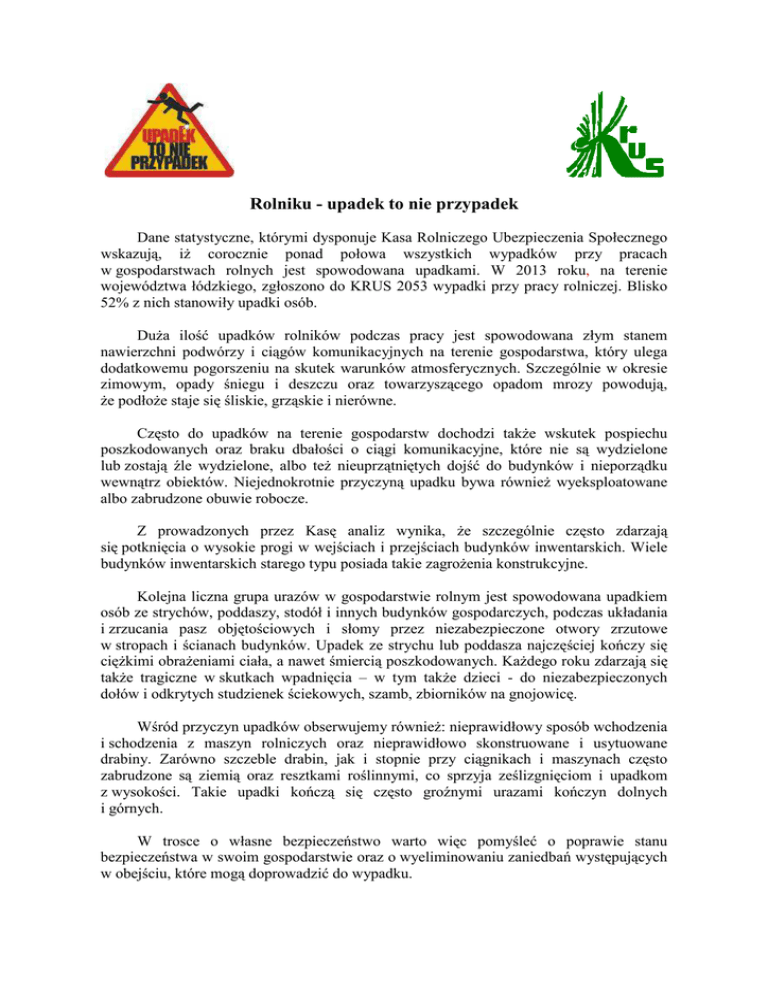 Rolniku - upadek to nie przypadek Dane statystyczne, którymi dysponuje Kasa Rolniczego Ubezpieczenia Społecznego wskazują, iż corocznie ponad połowa wszystkich wypadków przy pracach w gospodarstwach rolnych jest spowodowana upadkami. W 2013 roku, na terenie województwa łódzkiego, zgłoszono do KRUS 2053 wypadki przy pracy rolniczej. Blisko 52% z nich stanowiły upadki osób. Duża ilość upadków rolników podczas pracy jest spowodowana złym stanem nawierzchni podwórzy i ciągów komunikacyjnych na terenie gospodarstwa, który ulega dodatkowemu pogorszeniu na skutek warunków atmosferycznych. Szczególnie w okresie zimowym, opady śniegu i deszczu oraz towarzyszącego opadom mrozy powodują, że podłoże staje się śliskie, grząskie i nierówne. Często do upadków na terenie gospodarstw dochodzi także wskutek pospiechu poszkodowanych oraz braku dbałości o ciągi komunikacyjne, które nie są wydzielone lub zostają źle wydzielone, albo też nieuprzątniętych dojść do budynków i nieporządku wewnątrz obiektów. Niejednokrotnie przyczyną upadku bywa również wyeksploatowane albo zabrudzone obuwie robocze. Z prowadzonych przez Kasę analiz wynika, że szczególnie często zdarzają się potknięcia o wysokie progi w wejściach i przejściach budynków inwentarskich. Wiele budynków inwentarskich starego typu posiada takie zagrożenia konstrukcyjne. Kolejna liczna grupa urazów w gospodarstwie rolnym jest spowodowana upadkiem osób ze strychów, poddaszy, stodół i innych budynków gospodarczych, podczas układania i zrzucania pasz objętościowych i słomy przez niezabezpieczone otwory zrzutowe w stropach i ścianach budynków. Upadek ze strychu lub poddasza najczęściej kończy się ciężkimi obrażeniami ciała, a nawet śmiercią poszkodowanych. Każdego roku zdarzają się także tragiczne w skutkach wpadnięcia – w tym także dzieci - do niezabezpieczonych dołów i odkrytych studzienek ściekowych, szamb, zbiorników na gnojowicę. Wśród przyczyn upadków obserwujemy również: nieprawidłowy sposób wchodzenia i schodzenia z maszyn rolniczych oraz nieprawidłowo skonstruowane i usytuowane drabiny. Zarówno szczeble drabin, jak i stopnie przy ciągnikach i maszynach często zabrudzone są ziemią oraz resztkami roślinnymi, co sprzyja ześlizgnięciom i upadkom z wysokości. Takie upadki kończą się często groźnymi urazami kończyn dolnych i górnych. W trosce o własne bezpieczeństwo warto więc pomyśleć o poprawie stanu bezpieczeństwa w swoim gospodarstwie oraz o wyeliminowaniu zaniedbań występujących w obejściu, które mogą doprowadzić do wypadku. Aby zminimalizować ryzyko upadków przy pracy w gospodarstwie rolnym należy: -likwidować śliskość nawierzchni przejść komunikacyjnych poprzez usuwanie śniegu, posypywanie oblodzeń piaskiem, popiołem lub trocinami; -utrzymywać czystość i porządek na podwórzu oraz w ciągach komunikacyjnych; -stosować obuwie z antypoślizgową, protektorowaną podeszwą, najlepiej z cholewką chroniącą kostkę; -na ośnieżonych lub oblodzonych powierzchniach stosować nakładki na obuwie, tzw. raczki antypoślizgowe; -naprawiać uszkodzone stopnie oraz zamontować barierki wzdłuż ciągu schodów i na podeście; -zabezpieczać otwory zrzutowe na strychach, poddaszach; -stosować bezpieczne drabiny i podesty przy pracach na wysokości - bezpieczna drabina to drabina o mocnych i właściwie zamocowanych szczeblach, zabezpieczona przed poślizgiem lub przechyłem (u dołu gumowe lub ostre zakończenia, u góry zamontowane haki). Kąt nachylenia drabiny powinien wynosić od 65° do 75°, a drabina powinna wystawać minimum 0,75m nad powierzchnię, na którą wchodzi użytkownik; -wyrównywać i utwardzić w miarę możliwości nawierzchnie placów i przejść; -schodzić z ciągnika rolniczego plecami skierowanymi w kierunku zejścia (tak jak podczas wchodzenia) i podtrzymywać się przeznaczonych do tego uchwytów; -w przypadku braku możliwości usunięcia progów, oznaczyć je w widoczny sposób. W każdej placówce KRUS dostępne są bezpłatne broszury i ulotki związane z kampanią „Upadek to nie przypadek”. W materiałach tych szczegółowo opisano sposoby zapobiegania upadkom osób w gospodarstwach rolnych. Zachęcamy do zapoznania się z publikacjami. Oddział Regionalny KRUS w Łodzi przypomina również, że zgłoszenia wypadku przy pracy rolniczej powinien dokonać poszkodowany lub inna osoba, niezwłocznie po zaistnieniu zdarzenia. Zgłoszenia można dokonać osobiście, telefonicznie, za pośrednictwem poczty lub drogą elektroniczną, we wszystkich placówkach terenowych KRUS. Późne zgłoszenie wypadku utrudni przeprowadzenie postępowania powypadkowego i może uniemożliwić przyznanie prawa do jednorazowego odszkodowania. Elżbieta Nawrocka dyrektor Oddziału Regionalnego KRUS w Łodzi