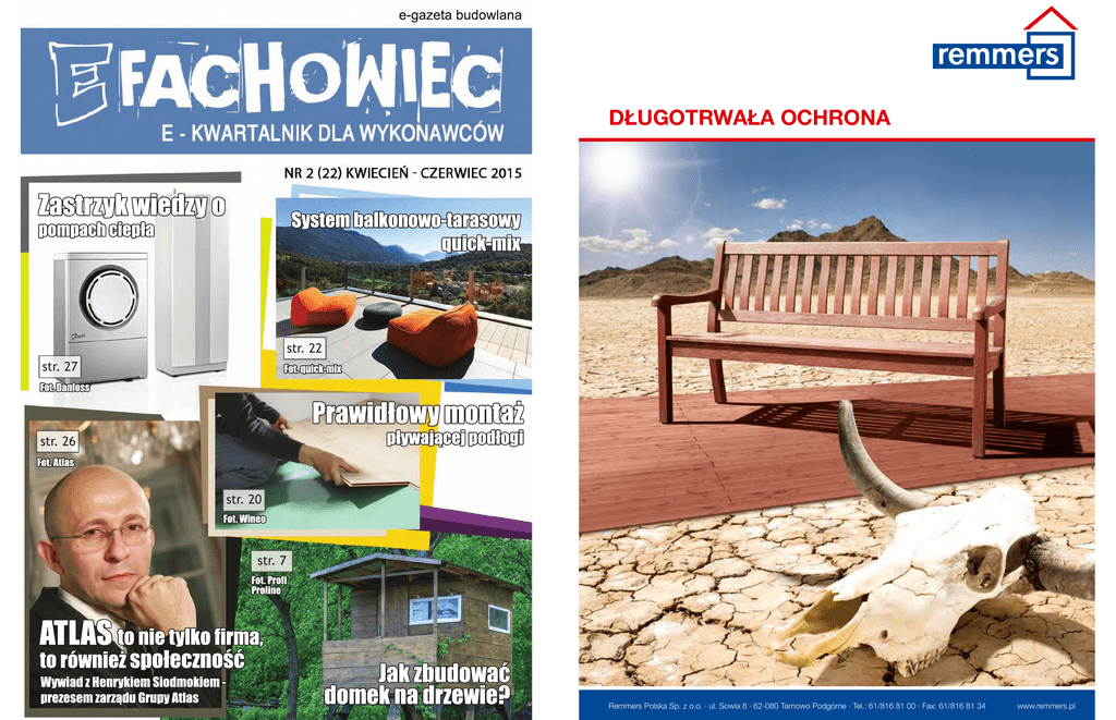 e-gazeta budowlana DŁUGOTRWAŁA OCHRONA Zastrzyk wiedzy o System balkonowo-tarasowy quick-mix pompach ciepła str. 22 str. 27 Fot. quick-mix Fot. Danfoss Prawidłowy montaż pływającej podłogi str. 26 Fot. Atlas str. 20 Fot. Wineo str. 7 Fot. Profi Proline ATLAS to nie tylko firma, to również społeczność Wywiad z Henrykiem Siodmokiem prezesem zarządu Grupy Atlas Jak zbudować domek na drzewie? Remmers Polska Sp. z o.o. · ul. Sowia 8 · 62-080 Tarnowo Podgórne · Tel.: 61/816 81 00 · Fax: 61/816 81 34 www.remmers.pl Najważniejsze jest to, czego nie widać... Spise-fachowiec treści 3. Wybór desek tarasowych - o czym najczęściej zapominamy 5. Czaty z ekspertami na forum.obud.pl 7. Jak zbudować domek na drzewie - jakich narzędzi potrzebujesz 12. BRAMA I FURTKA: Projektowanie nawierzchni - wejście i wjazd na posesję 17. Drabina dla dekarza - pomagamy wybrać rozwiązania dachowe do zadań specjalnych 18. Moskitiery Aluprof - skuteczna ochrona przed owadami 20. Prawidłowy montaż pływającej podłogi 22. System balkonowo-tarasowy quick-mix 26. Grupa ATLAS jest i pozostanie liderem 27. Zastrzyk wiedzy o pompach ciepła 29. „OKOLICE” ŚMIETNIKA - Projektowanie nawierzchni - strefa odpadów stałych Płytki z kolekcji Travena/Trovan Ceramika Paradyż 2 (22) Kwiecień - Czerwiec 2015 zaprawa klejowa Sopro No. 1 Zaprawa klejowa To, czego nie widać gołym okiem, decyduje o jakości wykonania. Kleje Sopro No. 1 charakteryzują się niezwykłą elastycznością – ugięcie >2,5 mm (S1) oraz przyczepnością do podłoża (C2 TE). Dzięki tym właściwościom kleje te są bardzo trwałe i mogą być stosowane na podłożach krytycznych: tarasy, balkony, baseny, pomieszczenia przemysłowe i gospodarcze. Zalecane również do płyty dużego formatu i zbiorników wody pitnej. Jakość produktów i szerokie wsparcie techniczne Sopro sprawią, że Twoja praca przebiega sprawnie i bez reklamacji. Od razu widać, że to Sopro. www.sopro.pl Systemy chemii budowlanej Sopro Polska Sp. z o.o. | Warszawa, ul. Poleczki 23/F (teren Platan Park) | tel. 22 335 23 00, fax 22 335 23 09 2 eFACHOWIEC 2’2015 OGRÓD Wybór desek tarasowych - o czym najczęściej zapominamy Sezon wiosenno-letni to idealny czas na aranżację przydomowej przestrzeni. Osoby planujące zakup materiałów na budowę tarasu częściej niż kiedykolwiek zadają sobie pytanie: zadziwiająco niska cena czy wysoka jakość? Oferta komercyjna czy indywidualizowana? Sieciowy supermarket czy lokalny salon sprzedaży? Wybór odpowiedniego materiału do pokrycia tarasu to niełatwa sztuka. Należy sprawdzić dokładnie wszystkie parametry techniczne danego surowca, takie jak gęstość, ciężar czy nasiąkliwość, a także odporność na działanie czynników atmosferycznych i biologicznych. Nie bez znaczenia są również walory estetyczne tarasu, które powinny utrzymywać się pomimo upływu czasu, a także łatwość czyszczenia i pielęgnacji. Wszystkie te kwestie, choć niezmiernie istotne, nie wyczerpują jednak tematu realizacji idealnego tarasu. O sprawach nierzadko pomijanych, a mających ogromny wpływ na końcowy efekt wykonania opowiada ekspert i doradca klienta z firmy Domino Sp. j. – Rafał Szczepański. Kompozyt vs drewno tarasowe Aranżacja przydomowej przestrzeni z deskami WPC Smokie Wild Wood. Fot: Domino 3 eFACHOWIEC 2’2015 Deski kompozytowe ze względu na swoją żywotność i łatwość utrzymania są materiałem coraz chętniej wybieranym do pokrycia powierzchni tarasowych. Trzeba jednak pamiętać, że w zależności od producenta różnią się one pod względem składu oraz parametrów technicznych. Kompozyt Warto też zaznaczyć, że w przeciwieństwie do desek drewnianych kompozyt jest także niepalny, nie butwieje i nie posiada drzazg. Dodatkowo deski kompozytowe można montować praktycznie na każdym podłożu, a 1 m2 tarasu może być gotowy już w 10 minut. Deski kompozytowe Wild Wood dostępne są w trzech modnych kolorach: ciemnoczekoladowym Smokie, złocistobrązowym Candy oraz naturalnym Brownie. Każdy z nich zapewnia eleganckie i trwałe wykończenie tarasu czy elementów ogrodu, takich jak mostki, powierzchnie przy basenach czy oczkach wodnych. Wild Wood to połączenie w 60% bambusowych włókien drzewnych i 40% wysokiej gęstości polietylenu. Do jego produkcji używane są elementy drzewne niewykorzystane w procesie produkcji stolarskiej, co pozwala na ochronę lasów i środowiska naturalnego. Zespalanie ich w wysokiej temperaturze i pod dużym ciśnieniem z poliolefinami pozwala otrzymać produkt, którego odporność na wilgoć przewyższa parametry pokryć tarasowych Salon przedaży vs DIY z surowców tradycyjnych. Współczesny konsument staje się coraz bardziej świadomy swo- W przypadku desek kompozyto- ich potrzeb i wyborów, nierzadko wych Wild Wood absorpcja wody przychodzi do salonu z określoną utrzymuje się na poziomie 0,9%, wizją realizacji danej przestrzejest więc dwadzieścia razy mniej- ni i konkretnymi pytaniami, jak sza niż w przypadku drewna so- wcielić ją w życie. Profesjonalne snowego. Produkt ten jest także doradztwo w punkcie handlowym wyjątkowo odporny na zmiany powinno być więc traktowane nie temperatur – wytrzymuje wahania jako wartość dodana, a integralny od -40 do nawet +60 stopni Celsju- element procesu sprzedażowego. sza. Dodatkowo jest bardzo łatwy Zaletą dokonywania zakupów w w utrzymaniu: nie wymaga impre- salonach dystrybutorów lub prognacji ani odnawiania po okresie ducentów jest możliwość dogłębzimowym, co bywa konieczne w nego zapoznania się z produktem przypadku drewnianych desek ta- i zaczerpnięcie dokładnych oraz rasowych – wylicza Rafał Szcze- profesjonalnych informacji wprost pański - ekspert i doradca klienta od doradcy specjalizującego się w konkretnym sektorze. W superz firmy Domino Sp. j OGRÓD marketach budowlanych kwestie te niestety w dalszym ciągu traktowane są nieco po macoszemu, a indyw