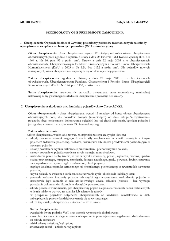 MODR 15/2015 Załącznik nr 1 do SIWZ SZCZEGÓŁOWY OPIS PRZEDMIOTU ZAMÓWIENIA 1. Ubezpieczenie Odpowiedzialności Cywilnej posiadaczy pojazdów mechanicznych za szkody wyrządzone w związku z ruchem tych pojazdów (OC komunikacyjne) Okres ubezpieczenia: okres ubezpieczenia wynosi 12 miesięcy od końca okresu ubezpieczenia obowiązujących polis zgodnie z zapisami Ustawy z dnia 23 kwietnia 1964 Kodeks cywilny (Dz.U. z 1964 r. Nr 16, poz. 93 z późn. zm.), Ustawy z dnia 22 maja 2003 r. o ubezpieczeniach obowiązkowych, Ubezpieczeniowym Funduszu Gwarancyjnym i Polskim Biurze Ubezpieczycieli Komunikacyjnych (Dz.U. z 2003 r. Nr 124, Poz 1152 z późn. zm.). Dla pojazdów nowych (zakupionych) okres ubezpieczenia rozpoczyna się od dnia rejestracji pojazdów. Zakres ubezpieczenia: zgodnie z Ustawą z dnia 22 maja 2003 r. o ubezpieczeniach obowiązkowych, Ubezpieczeniowym Funduszu Gwarancyjnym i Polskim Biurze Ubezpieczycieli Komunikacyjnych (Dz. U. Nr 124, poz. 1152, z późn. zm.) Suma ubezpieczenia: ustawowa (w przypadku zwiększenia przez ustawodawcę minimalnej ustawowej sumy gwarancyjnej składka za ubezpieczenie pozostaje bez zmian). 2. Ubezpieczenia uszkodzenia oraz kradzieży pojazdów Auto Casco AC/KR Okres ubezpieczenia - okres ubezpieczenia wynosi 12 miesięcy od końca okresu ubezpieczenia obowiązujących polis, dla pojazdów nowych (zakupionych) od dnia zakupu/zarejestrowania pojazdów (bez konieczności dokonywania oględzin) lub od chwili zgłoszenia/oględzin pojazdu i jest zgodny z okresem ubezpieczenia OC komunikacyjnego. Zakres ubezpieczenia Zakres ubezpieczenia winien obejmować, co najmniej następujące ryzyka i koszty: - szkody powstałe wskutek nagłego działania siły mechanicznej w chwili zetknięcia z innym pojazdem (zderzenie pojazdów), osobami, zwierzętami lub innymi przedmiotami pochodzącymi z zewnątrz pojazdu, - szkody powstałe w wyniku zetknięcia z przedmiotami pochodzącymi z pojazdu, - szkody powstałe w pojeździe podczas mycia na myjni samochodowej, - uszkodzenia przez osoby trzecie, w tym w wyniku dewastacji, pożaru, wybuchu, pioruna, upadku statku powietrznego, huraganu, zatopienia, deszczu nawalnego, gradu, powodzi, lawiny, osuwania się i zapadania ziemi, oraz nagłe działanie innych sił przyrody - nagłego działania czynnika termicznego lub chemicznego pochodzącego z zewnątrz lub wewnątrz pojazdu, - użycia pojazdu w związku z koniecznością ratowania życia lub zdrowia ludzkiego oraz - powstałe wskutek kradzieży pojazdu lub części jego wyposażenia; uszkodzenie pojazdu w następstwie jego zabrania w celu krótkotrwałego użycia, rabunku (rozboju – bez wymogu posiadania dokumentów i kompletu kluczyków po szkodzie), - szkody powstałe w momencie, gdy ubezpieczony pojazd nie posiadał ważnych badań technicznych o ile nie miało to wpływu na rozmiar lub zaistnienie szkody, - w przypadku pojazdów dotychczas ubezpieczanych od kradzieży, zainstalowane w nich zabezpieczenia przeciw kradzieżowe uznaje się za wystarczające. - zakres terytorialny ubezpieczenia autocasco – RP i Europa. Suma ubezpieczenia - uwzględnia kwotę podatku VAT oraz wartość wyposażenia dodatkowego, - suma ubezpieczenia nie ulega w okresie ubezpieczenia pomniejszeniu o wypłacone odszkodowania za szkody częściowe - udział własny zniesiony/wykupiony - amortyzacja części – zniesiona/wykupiona - - - Likwidacja szkód wariant serwisowy/warsztatowy (wypłata odszkodowania na podstawie przedstawionych faktur na uzgodniony zakres napraw z uwzględnieniem podatku VAT) lub wariant bezgotówkowy, do wyboru przez Zamawiającego, oględzin uszkodzonego pojazdu dokonuje Ubezpieczyciel w terminie 3 dni od zgłoszenia szkody, w przypadku braku oględzin, przyjmuje się zakres uszkodzeń zgodny z protokołem sporządzonym przez ubezpieczającego, ubezpieczonego lub warsztat dokonujący naprawy, zatwierdzenia przedstawionego kosztorysu naprawy dokonuje Ubezpieczyciel w ciągu 3 dni roboczych od jego dostarczenia pisemnie informując ubezpieczonego lub warsztat, w przypadku braku informacji, przedstawiony kosztorys uznaje się za zatwierdzony, kopia decyzji zamykającej szkodę zostanie przesłana do wiadomości ubezpieczającego oraz brokera uczestniczącego w likwidacji szkody, dowód rejestracyjny, kartę pojazdu, wszystkie komplety kluczyków i sterowników służących do otwarcia lub uruchomienia pojazdu oraz urządzeń zabezpieczających przed kradzieżą w ilości wskazanej we wniosku o ubezpieczenie należy złożyć niezwłocznie, nie później niż w ciągu 7 dni od zgłoszenia szkody polegającej na kradzieży pojazdu, chyba, że wystąpiły uzasadnione okoliczności uniemożliwiające dotrzymanie w/w terminu, Ubezpieczyciel pokryje koszty: samochodu zastępczego, obowiązkowego badania technicznego, wykonywanego w związku ze szkodą w zakresie elementów układu nośnego, hamulcowego lub kierowniczego mających wpływ na bezpieczeństwo ruchu drogowego, za którą uprzednio przyjął on odpowiedzialność, ubezpieczenie pojazdu na niższą niż wartość rynkowa wartość pojazdu, np. gdy pojazd został kupiony z rabatem, nie będzie podstawą do stosowania zasady proporcji przy wypłacie odszkodowania, na wysokość odszkodowania nie będzie miała wpływu prędkość z jaką poruszał się dany pojazd w chwili zaistnienia szkody. 3. Ubezpieczenie Następstw Nieszczęśliwych Wypadków kierowców i pasażerów (NNW) Okres ubezpieczenia - okres ubezpieczenia wynosi 12 miesięcy od końca okresu ubezpieczenia obowiązujących polis, dla pojazdów nowych (zakupionych) od dnia zakupu/rejestracji pojazdów i jest zgodny z okresem ubezpieczenia Auto Casco lub OC komunikacyjnego. Zakres ubezpieczenia Przedmiotem ubezpieczenia jest trwałe uszkodzenie ciała, rozstrój zdrowia lub śmierć ubezpieczonego powstałe w związku z ruchem pojazdów (również podczas zatrzymania i postoju), w tym podczas wsiadania i wysiadania z pojazdu, załadunku i roz