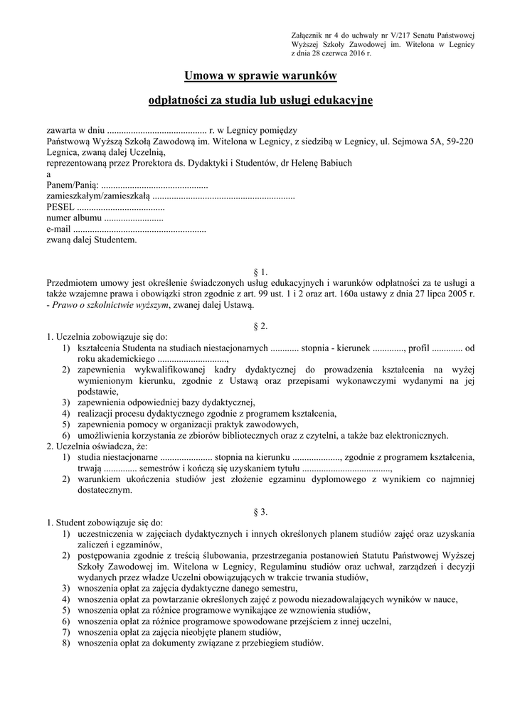 Załącznik nr 4 do uchwały nr V/217 Senatu Państwowej Wyższej Szkoły Zawodowej im. Witelona w Legnicy z dnia 28 czerwca 2016 r. Umowa w sprawie warunków odpłatności za studia lub usługi edukacyjne zawarta w dniu .......................................... r. w Legnicy pomiędzy Państwową Wyższą Szkołą Zawodową im. Witelona w Legnicy, z siedzibą w Legnicy, ul. Sejmowa 5A, 59-220 Legnica, zwaną dalej Uczelnią, reprezentowaną przez Prorektora ds. Dydaktyki i Studentów, dr Helenę Babiuch a Panem/Panią: ............................................. zamieszkałym/zamieszkałą ............................................................ PESEL ..................................... numer albumu ......................... e-mail ........................................................ zwaną dalej Studentem. § 1. Przedmiotem umowy jest określenie świadczonych usług edukacyjnych i warunków odpłatności za te usługi a także wzajemne prawa i obowiązki stron zgodnie z art. 99 ust. 1 i 2 oraz art. 160a ustawy z dnia 27 lipca 2005 r. - Prawo o szkolnictwie wyższym, zwanej dalej Ustawą. § 2. 1. Uczelnia zobowiązuje się do: 1) kształcenia Studenta na studiach niestacjonarnych ............ stopnia - kierunek ............., profil ............. od roku akademickiego ............................., 2) zapewnienia wykwalifikowanej kadry dydaktycznej do prowadzenia kształcenia na wyżej wymienionym kierunku, zgodnie z Ustawą oraz przepisami wykonawczymi wydanymi na jej podstawie, 3) zapewnienia odpowiedniej bazy dydaktycznej, 4) realizacji procesu dydaktycznego zgodnie z programem kształcenia, 5) zapewnienia pomocy w organizacji praktyk zawodowych, 6) umożliwienia korzystania ze zbiorów bibliotecznych oraz z czytelni, a także baz elektronicznych. 2. Uczelnia oświadcza, że: 1) studia niestacjonarne ...................... stopnia na kierunku ...................., zgodnie z programem kształcenia, trwają .............. semestrów i kończą się uzyskaniem tytułu ....................................., 2) warunkiem ukończenia studiów jest złożenie egzaminu dyplomowego z wynikiem co najmniej dostatecznym. § 3. 1. Student zobowiązuje się do: 1) uczestniczenia w zajęciach dydaktycznych i innych określonych planem studiów zajęć oraz uzyskania zaliczeń i egzaminów, 2) postępowania zgodnie z treścią ślubowania, przestrzegania postanowień Statutu Państwowej Wyższej Szkoły Zawodowej im. Witelona w Legnicy, Regulaminu studiów oraz uchwał, zarządzeń i decyzji wydanych przez władze Uczelni obowiązujących w trakcie trwania studiów, 3) wnoszenia opłat za zajęcia dydaktyczne danego semestru, 4) wnoszenia opłat za powtarzanie określonych zajęć z powodu niezadowalających wyników w nauce, 5) wnoszenia opłat za różnice programowe wynikające ze wznowienia studiów, 6) wnoszenia opłat za różnice programowe spowodowane przejściem z innej uczelni, 7) wnoszenia opłat za zajęcia nieobjęte planem studiów, 8) wnoszenia opłat za dokumenty związane z przebiegiem studiów. § 4. 1. Szczegółowe zasady pobierania opłat za świadczone usługi edukacyjne oraz tryb i warunki zwalniania z tych opłat studentów zostały określone przez Senat Uczelni w drodze Uchwały, stanowiącej załącznik nr 1 do niniejszej umowy. 2. Wysokość opłat za świadczone usługi edukacyjne oraz terminy ich wnoszenia zostały określone przez Rektora Uczelni w drodze Zarządzenia, stanowiącego załącznik nr 2 do niniejszej umowy. 3. Wysokość opłat za dokumenty dotyczące przebiegu studiów określił Rektor w drodze Zarządzenia, stanowiącego załącznik nr 3 do niniejszej umowy. 4. Student zobowiązuje się do wnoszenia opłat na zasadach określonych w aktach prawnych, o których mowa w ust. 1 - 3 oraz niniejszej umowie w terminach określonych przez Rektora lub Dziekana. 5. Student wyraża zgodę na przekazywanie kolejnych lub zmienionych aktów prawnych, o których mowa w ust. 1-3 na podany w niniejszej umowie adres e-mail oraz zobowiązuje się do bieżącego przeglądania poczty elektronicznej. 6. O wszelkich zmianach w aktach prawnych, o których mowa w ust. 1-3 Uczelnia powiadomi Studenta na podany przez niego adres e-mail, a także zamieści stosowne informacje na tablicy ogłoszeń w siedzibie Uczelni oraz na swojej stronie internetowej. 7. Zmiana postanowień aktów prawnych wymienionych w ust. 1-3 nie stanowi zmiany treści niniejszej umowy. 8. Wszelkie informacje związane z procesem kształcenia w Uczelni są dostępne na stronie internetowej: www.pwsz.legnica.edu.pl. § 5. 1. Uczelnia pobiera opłaty za wydanie następujących dokumentów związanych z przebiegiem studiów i ich duplikatów: a) elektroniczna legitymacja studencka, b) dyplom ukończenia studiów, c) indeks, d) dodatkowy odpis dyplomu w tłumaczeniu na język obcy, e) inne dokumenty zgodnie z rozporządzeniem wykonawczym wydanym przez ministra właściwego do spraw szkolnictwa wyższego. 2. Student pokrywa równowartość szkody za mienie zniszczone podczas trwania praktyk i zajęć dydaktycznych realizowanych w formie zajęć praktycznych oraz laboratoryjnych. § 6. 1. Wysokość opłaty za zajęcia dydaktyczne jednego semestru studiów w roku akademickim ..................... wynosi ............... zł. 2. Opłatę za zajęcia dydaktyczne można wnieść w całości w następujących terminach: a) za semestr zimowy w terminie do .............................. r. b) za semestr letni w terminie do ............................. r. 3. Opłata za zajęcia dydaktyczne może być dokonana przez Studenta w trzech ratach. Rozłożenie na raty następuje automatycznie z chwilą wpłaty pierwszej raty, nie wymaga się dodatkowych pism. W semestrze ................. w roku akademickim ........................... ustalony został następujący harmonogram płatności: a) I rata w wysokości ................. zł, płatna do ............................... r., b) II rata w wysokości .........