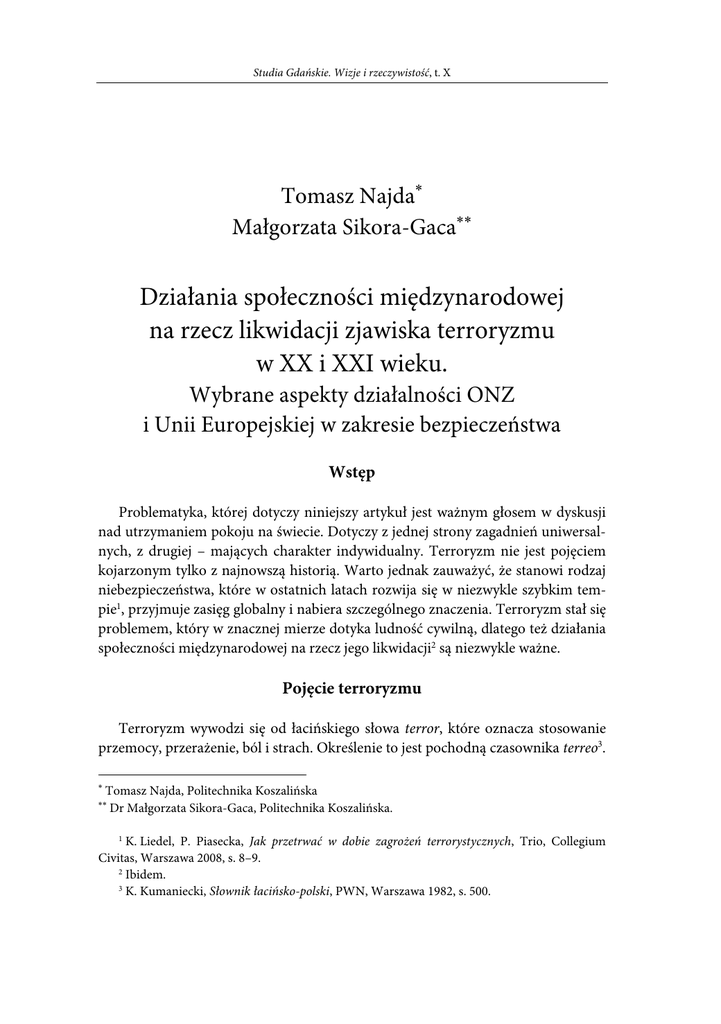 Studia Gdańskie. Wizje i rzeczywistość, t. X Tomasz Najda∗ Małgorzata Sikora-Gaca∗∗ Działania społeczności międzynarodowej na rzecz likwidacji zjawiska terroryzmu w XX i XXI wieku. Wybrane aspekty działalności ONZ i Unii Europejskiej w zakresie bezpieczeństwa Wstęp Problematyka, której dotyczy niniejszy artykuł jest ważnym głosem w dyskusji nad utrzymaniem pokoju na świecie. Dotyczy z jednej strony zagadnień uniwersalnych, z drugiej – mających charakter indywidualny. Terroryzm nie jest pojęciem kojarzonym tylko z najnowszą historią. Warto jednak zauważyć, że stanowi rodzaj niebezpieczeństwa, które w ostatnich latach rozwija się w niezwykle szybkim tempie1, przyjmuje zasięg globalny i nabiera szczególnego znaczenia. Terroryzm stał się problemem, który w znacznej mierze dotyka ludność cywilną, dlatego też działania społeczności międzynarodowej na rzecz jego likwidacji2 są niezwykle ważne. Pojęcie terroryzmu Terroryzm wywodzi się od łacińskiego słowa terror, które oznacza stosowanie przemocy, przerażenie, ból i strach. Określenie to jest pochodną czasownika terreo3. ∗ Tomasz Najda, Politechnika Koszalińska Dr Małgorzata Sikora-Gaca, Politechnika Koszalińska. ∗∗ 1 K. Liedel, P. Piasecka, Jak przetrwać w dobie zagrożeń terrorystycznych, Trio, Collegium Civitas, Warszawa 2008, s. 8–9. 2 Ibidem. 3 K. Kumaniecki, Słownik łacińsko-polski, PWN, Warszawa 1982, s. 500. Działania społeczności międzynarodowej na rzecz likwidacji zjawiska terroryzmu w XX i XXI wieku… Definicji zjawiska jest blisko 200, co dowodzi jego złożoności4. Począwszy od starożytności po wiek XIX terroryzm tłumaczono przede wszystkim jako stosowanie przymusu. Pojawienie się organizacji narodowowyzwoleńczych o zabarwieniu nacjonalistycznym wprowadziło do literatury przedmiotu nowe znaczenia pojęcia, takie jak zastraszanie czy użycie siły. W latach 30. XX w. terroryzm zaczęto kojarzyć z represjami totalitarnymi5. Po roku 1945 wymiar zjawiska poszerzono o kwestie działań antykolonialnych w Azji i Afryce. W latach 60. i 70. społeczności międzynarodowe zwróciły uwagę na kwestię organizacji lewicowych, prawicowych czy separatystycznych. Pojęcie terroryzmu sięga zatem odległej historii6, a jego rozumienie zmieniało się wskutek licznych wydarzeń, przemian czy rewolucji. Są to (…) różnie umotywowane ideologicznie, planowane i zorganizowane działania pojedynczych osób lub grup, skutkujące naruszeniem istniejącego porządku prawnego, podjęte w celu wymuszenia od władz państw i społeczeństwa określonych zachowań i świadczeń, często naruszające dobra osób postronnych7. Jarosław Tomasiewicz terroryzmem nazywa systematyczne posługiwanie się aktami terroru indywidualnego dla osiągnięcia celu politycznego8. W definicjach najczęściej powtarzają się kwestie związane z przemocą, użyciem siły czy wywoływaniem strachu9. Zdaniem Sebastiana Wojciechowskiego, pojęcie to jest sporne i w głównej mierze zależy od postrzegania problematyki10. Odnosi się przede wszystkim do stosowanych wobec państwa przez grupy zorganizowane form przemocy, do których należy nadużycie czy wywieranie wpływu. Tego typu środki nacisku mogą stosować także państwa lub poszczególne organizacje, czego przykładem może być Libia11. Zdaniem Marka Boruckiego, terroryzm to dokładnie zaplanowana działalność grup zorganizowanych, której zadaniem jest wywarcie presji na władzach lub społecznościach w celu uzyskania konkretnych profitów czy decyzji. Jak zauważa, terroryści najczęściej w swych działaniach używają szantażu, łamią prawo i są całkowicie obojętni na ból zadawany innym12. Grupy związane z terroryzmem i jego funkcjonowaniem używają broni najnowszego typu, a także wykorzystują środki 4 Ibidem. W. Dietl, K. Hirschmann, R. Tophoven, Terroryzm, PWN, Warszawa 2009, s. 37–38. 6 Ibidem. 7 Hasło „terroryzm”, zob. Nowa encyklopedia powszechna PWN, t. 6, red. B. PetrozolinSkowrońska, PWN, Warszawa 1998, s. 370. 8 J. Tomasiewicz, Terroryzm na tle przemocy politycznej, Wydawnictwo APIS, Katowice 2000, s. 12. 9 K. Jałoszyński, Terroryzm czy terror kryminalny w Polsce?, AON, Warszawa 2001, s. 7. 10 S. Wojciechowski, Terroryzm na początku XXI wieku, Oficyna Wydawcza Branta, Bydgoszcz – Poznań 2011, s. 26–27. 11 Ibidem. 12 M. Borucki, Terroryzm. Zło naszych czasów, Wydawnictwo Mada, Warszawa 2002, s. 3–5. 5 165 Tomasz Najda, Małgorzata Sikora-Gaca biologiczne lub chemiczne. Do działań tego typu grup w dużej mierze należą porwania niewinnych cywilów – zakładników oraz podkładanie ładunków wybuchowych. Często odpowiedzialne są one za zamachy na wpływowe osobistości. Swoje działania tłumaczą zazwyczaj ideologią, religią czy konkretnymi poglądami wynikającymi z wątków etnicznych. Do najbardziej niebezpiecznych zalicza się ugrupowania o charakterze międzynarodowym13. Zmiana interpretacji zagrożeń, jakie niesie ze sobą terroryzm, nastąpiła po atakach 11.09.2001 r., kiedy Al-Kaida uderzyła w najważniejsze ośrodki polityczne, ekonomiczne i wojskowe USA. Pokazała światu, jak daleko potrafią się posunąć współcześni terroryści. Wskazano tym samym na nowy wymiar zjawiska14. Zamachy z 11 września odmieniły postrzeganie terroryzmu, który stworzył niespotykany do tej pory poziom zagrożenia. Od zamachu Al-Kaidy na Stany Zjednoczone, terroryzm nie był już kojarzony z atakami, w których ginie jedna bądź kilka osób. Stał się siłą, której celem było pochłonięcie w ciągu zaledwie kilku minut ogromnej liczby niewinnych ofiar. Kolejnym czynnikiem wpływającym na zmianę dotychczasowego rozumienia terroryzmu, jak i na postrzeganie samych agresorów, była ich determinacja w działaniu z pobudek religijnych (z czego wynikał m.in. brak lęku przed śmiercią). Podkreślić należy także brak jakichkolwiek prób negocjacji. Przed atakiem terro