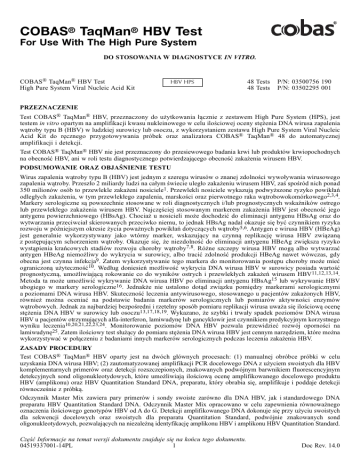 COBAS® TaqMan® HBV Test For Use With The High Pure System DO STOSOWANIA W DIAGNOSTYCE IN VITRO. COBAS® TaqMan® HBV Test High Pure System Viral Nucleic Acid Kit HBV HPS 48 Tests 48 Tests P/N: 03500756 190 P/N: 03502295 001 PRZEZNACZENIE Test COBAS® TaqMan® HBV, przeznaczony do użytkowania łącznie z zestawem High Pure System (HPS), jest testem in vitro opartym na amplifikacji kwasu nukleinowego w celu ilościowej oceny stężenia DNA wirusa zapalenia wątroby typu B (HBV) w ludzkiej surowicy lub osoczu, z wykorzystaniem zestawu High Pure System Viral Nucleic Acid Kit do ręcznego przygotowywania próbek oraz analizatora COBAS® TaqMan® 48 do automatycznej amplifikacji i detekcji. Test COBAS® TaqMan® HBV nie jest przeznaczony do przesiewowego badania krwi lub produktów krwiopochodnych na obecność HBV, ani w roli testu diagnostycznego potwierdzającego obecność zakażenia wirusem HBV. PODSUMOWANIE ORAZ OBJAŚNIENIE TESTU Wirus zapalenia wątroby typu B (HBV) jest jednym z szeregu wirusów o znanej zdolności wywoływania wirusowego zapalenia wątroby. Przeszło 2 miliardy ludzi na całym świecie uległo zakażeniu wirusem HBV, zaś spośród nich ponad 350 milionów osób to przewlekle zakażeni nosiciele1. Przewlekli nosiciele wykazują podwyższone ryzyko powikłań odległych zakażenia, w tym przewlekłego zapalenia, marskości oraz pierwotnego raka wątrobowokomórkowego2,3,4. Markery serologiczne są powszechnie stosowane w roli diagnostycznych i/lub prognostycznych wskaźników ostrego lub przewlekłego zakażenia wirusem HBV. Najczęściej stosowanym markerem zakażenia HBV jest obecność jego antygenu powierzchniowego (HBsAg). Chociaż u nosicieli może dochodzić do eliminacji antygenu HBsAg oraz do wytwarzania przeciwciał skierowanych przeciwko niemu, to jednak HBsAg nadal okazuje się być czynnikiem ryzyka rozwoju w późniejszym okresie życia poważnych powikłań dotyczących wątroby5,6. Antygen e wirusa HBV (HBeAg) jest generalnie wykorzystywany jako wtórny marker, wskazujący na czynną replikację wirusa HBV związaną z postępującym schorzeniem wątroby. Okazuje się, że niezdolność do eliminacji antygenu HBeAg zwiększa ryzyko wystąpienia krańcowych stadiów rozwoju choroby wątroby7,8. Różne szczepy wirusa HBV mogą albo wytwarzać antygen HBeAg niemożliwy do wykrycia w surowicy, albo tracić zdolność produkcji HBeAg nawet wówczas, gdy obecna jest czynna infekcja9. Zatem wykorzystywanie tego markera do monitorowania postępu choroby może mieć ograniczoną użyteczność10. Według doniesień możliwość wykrycia DNA wirusa HBV w surowicy posiada wartość prognostyczną, umożliwiającą rokowanie co do wyników ostrych i przewlekłych zakażeń wirusem HBV11,12,13,14. Metoda ta może umożliwić wykrywanie DNA wirusa HBV po eliminacji antygenu HBsAg15 lub wykrywanie HBV ubogiego w markery serologiczne16. Jednakże nie ustalono dotąd związku pomiędzy markerami serologicznymi a poziomami DNA wirusa HBV. Skuteczność leczenia antywirusowego, stosowanego u pacjentów zakażonych HBV, również można oceniać na podstawie badania markerów serologicznych lub pomiarów aktywności enzymów wątrobowych. Jednak za najbardziej bezpośredni i rzetelny sposób pomiaru replikacji wirusa uważa się ilościową ocenę stężenia DNA HBV w surowicy lub osoczu13,17,18,19. Wykazano, że szybki i trwały spadek poziomów DNA wirusa HBV u pacjentów otrzymujących alfa-interferon, lamiwudynę lub gancyklowir jest czynnikiem predykcyjnym korzystnego wyniku leczenia10,20,21,22,23,24. Monitorowanie poziomów DNA HBV pozwala przewidzieć rozwój oporności na lamiwudynę25. Zatem ilościowy test służący do pomiaru stężenia DNA wirusa HBV jest cennym narzędziem, które można wykorzystywać w połączeniu z badaniami innych markerów serologicznych podczas leczenia zakażenia HBV. ZASADY PROCEDURY Test COBAS® TaqMan® HBV oparty jest na dwóch głównych procesach: (1) manualnej obróbce próbki w celu uzyskania DNA wirusa HBV; (2) zautomatyzowanej amplifikacji PCR docelowego DNA z użyciem swoistych dla HBV komplementarnych primerów oraz detekcji rozszczepionych, znakowanych podwójnym barwnikiem fluorescencyjnym detekcyjnych sond oligonukleotydowych, które umożliwiają ilościową ocenę amplifikowanego docelowego produktu HBV (amplikonu) oraz HBV Quantitation Standard DNA, preparatu, który obrabia się, amplifikuje i poddaje detekcji równocześnie z próbką. Odczynnik Master Mix zawiera pary primerów i sondy swoiste zarówno dla DNA HBV, jak i standardowego DNA preparatu HBV Quantitation Standard DNA. Odczynnik Master Mix opracowano w celu zapewnienia równoważnego oznaczenia ilościowego genotypów HBV od A do G. Detekcji amplifikowanego DNA dokonuje się przy użyciu swoistych dla sekwencji docelowych oraz swoistych dla preparatu Quantitation Standard, podwójnie znakowanych sond oligonukleotydowych, pozwalających na niezależną identyfikację amplikonu HBV i amplikonu HBV Quantitation Standard. Część Informacje na temat wersji dokumentu znajduje się na końcu tego dokumentu. 1 04519337001-14PL Doc Rev. 14.0 Oznaczanie ilościowe DNA wirusa HBV przeprowadza się za pomocą preparatu HBV Quantitation Standard. HBV Quantitation Standard to niezakaźny, linearyzowany plazmid zawierający miejsca wiązania primerów identyczne z posiadanymi przez docelowy DNA HBV, a także charakterystyczne miejsce wiązania sondy, które umożliwia odróżnienie amplikonu HBV Quantitation Standard od docelowego amplikonu HBV. HBV Quantitation Standard wchodzi w skład każdej próbki i kontroli ze znaną liczbą kopii; wraz z docelowym materiałem HBV jest poddawany etapom: przygotowania próbki, amplifikacji PCR oraz detekcji. Analizator COBAS® TaqMan® 48 oblicza miano DNA HBV w badanej próbce na podstawie porównania sygnału HBV z sygnałem HBV Quantitation Standard w każdej próbce oraz kontroli. HBV Quantitation Standard rekompensuje