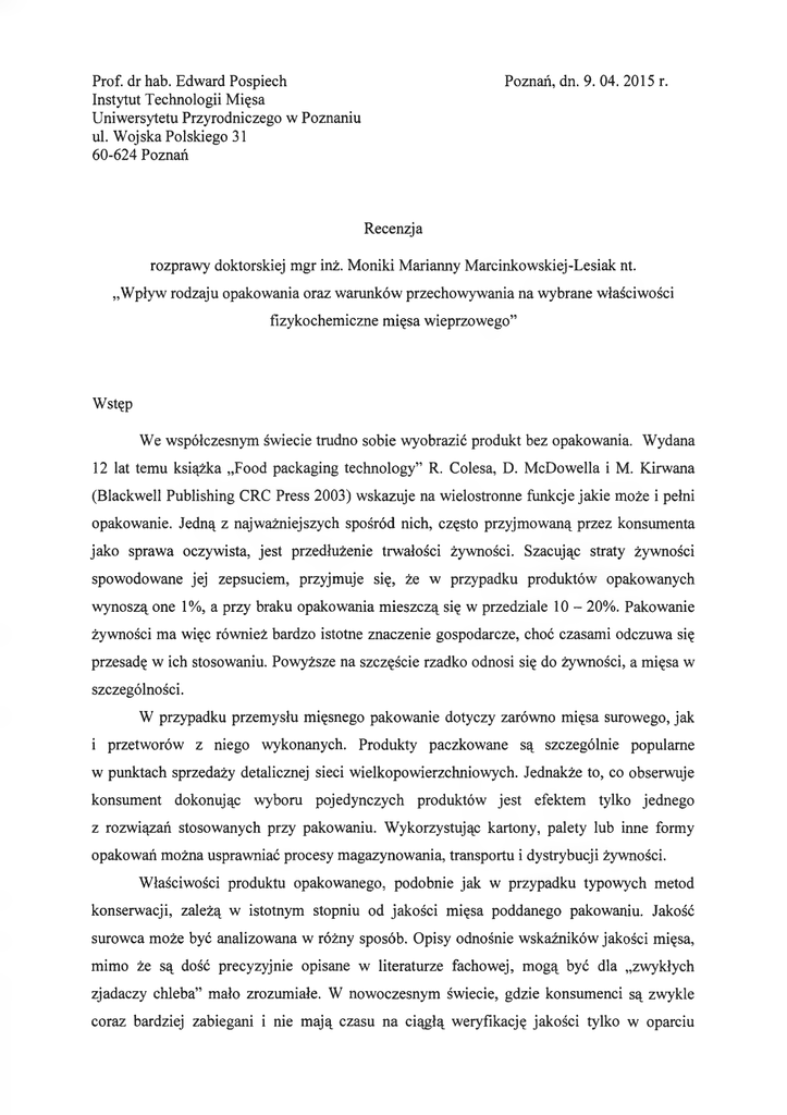 Prof. dr hab. Edward Pospiech Instytut Technologii Mięsa Uniwersytetu Przyrodniczego w Poznaniu ul. Wojska Polskiego 31 60-624 Poznań Poznań, dn. 9. 04. 2015 r. Recenzja rozprawy doktorskiej mgr inż. Moniki Marianny Marcinkowskiej-Lesiak nt. „Wpływ rodzaju opakowania oraz warunków przechowywania na wybrane właściwości fizykochemiczne mięsa wieprzowego” Wstęp We współczesnym świecie trudno sobie wyobrazić produkt bez opakowania. Wydana 12 lat temu książka „Food packaging technology” R. Colesa, D. McDowella i M. Kirwana (Blackwell Publishing CRC Press 2003) wskazuje na wielostronne funkcje jakie może i pełni opakowanie. Jedną z najważniejszych spośród nich, często przyjmowaną przez konsumenta jako sprawa oczywista, jest przedłużenie trwałości żywności. Szacując straty żywności spowodowane jej zepsuciem, przyjmuje się, że w przypadku produktów opakowanych wynoszą one 1%, a przy braku opakowania mieszczą się w przedziale 10 - 20%. Pakowanie żywności ma więc również bardzo istotne znaczenie gospodarcze, choć czasami odczuwa się przesadę w ich stosowaniu. Powyższe na szczęście rzadko odnosi się do żywności, a mięsa w szczególności. W przypadku przemysłu mięsnego pakowanie dotyczy zarówno mięsa surowego, jak i przetworów z niego wykonanych. Produkty paczkowane są szczególnie popularne w punktach sprzedaży detalicznej sieci wielkopowierzchniowych. Jednakże to, co obserwuje konsument dokonując wyboru pojedynczych produktów jest efektem tylko jednego z rozwiązań stosowanych przy pakowaniu. Wykorzystując kartony, palety lub inne formy opakowań można usprawniać procesy magazynowania, transportu i dystrybucji żywności. Właściwości produktu opakowanego, podobnie jak w przypadku typowych metod konserwacji, zależą w istotnym stopniu od jakości mięsa poddanego pakowaniu. Jakość surowca może być analizowana w różny sposób. Opisy odnośnie wskaźników jakości mięsa, mimo że są dość precyzyjnie opisane w literaturze fachowej, m ogą być dla „zwykłych zjadaczy chleba” mało zrozumiałe. W nowoczesnym świecie, gdzie konsumenci są zwykle coraz bardziej zabiegani i nie mają czasu na ciągłą weryfikację jakości tylko w oparciu 0 własną wiedzę coraz częściej zdają się oni na zakup artykułów o zdefiniowanej jakości. Taką możliwość dają produkty posiadające certyfikat. Ma on świadczyć o tym, że oferowany produkt ma ściśle określone właściwości, których zachowanie jest związane ze stosowaniem właściwych systemów bezpieczeństwa żywnościowego i gwarantowania jakości. Przedstawiona do recenzji praca doktorska Mgr inż. Moniki Marianny Marcinkowskiej-Lesiak obejmuje szereg zagadnień, które wpisują się w tę tematykę bardzo dobrze. Doktorantka koncentruje się na zagadnieniach wymienionych w tytule pracy, a więc na problematyce pakowania mięsa i jego wpływu na wybrane właściwości fizykochemiczne wieprzowiny przy czym, co nie wynika już z tytułu pracy, uwzględnia zróżnicowanie jakości mięsa stanowiące dodatkowy czynnik w badaniach zrealizowanych w ramach tej w pracy. Zagadnienia poruszone w dysertacji należą do aktualnych i interesujących z punktu widzenia nauki o mięsie. Są one ważne także dla praktyki przemysłowej i konsumenta, ostatecznego odbiorcy oferowanych produktów. Przeprowadzone badania przedstawiają rozwiązania szeregu kwestii związanych z pakowaniem mięsa, w tym między innymi te dotyczące doboru materiału zastosowanego do pakowania, jego przepuszczalności dla gazów 1 stopnia wypełnienia przestrzeni opakowania. Analizuje się w niej wpływ warunków przechowywania zwracając szczególną uwagę na intensywność naświetlenia mięsa i czas w jakim te zmiany są obserwowane oraz jaka jest ich skala. Ocena układu pracy i charakterystyka jej tematyki badawczej Przedłożona do oceny praca obejmuje 141 stron maszynopisu. Została podzielona na 8 rozdziałów. Ostatnie dwa rozdziały stanowią „Aneks” i „Spis piśmiennictwa”. O ile ostatni z rozdziałów jest typowy dla prac doktorskich o tyle „Aneks” stanowi dość szczególne rozwiązanie przedstawienia tabel z uśrednionymi wynikami i zwykle poszerzoną analizą statystyczną wskazującą na wpływ na badane cechy analizowanych czynników i ich interakcje. Pracę otwiera strona tytułowa, a następnie strona informująca o tym, że praca została zrealizowana w ramach projektu „BIOŻYWNOŚĆ - innowacyjne, funkcjonalne produkty pochodzenia zwierzęcego” nr POIG.01.01.02-014-090/09 współfinansowanego przez Unię Europejską ze środków Europejskiego Funduszu Rozwoju Regionalnego w ramach Programu Operacyjnego Innowacyjna Gospodarka 2007 - 2013. Po stronach zawierających stosowne oświadczenia „udziałowców” pracy, w tym przede wszystkim Pani promotor Dr hab. prof. SGGW Agnieszki Wierzbickiej, Dr inż. Ewy Poławskiej pełniącej funkcję promotora pomocniczego i autorki pracy Mgr inż. Moniki Marianny MarcinkowskiejLesiak oraz po Jej podziękowaniach zamieszczono streszczenia dysertacji w języku polskim i 2 angielskim wraz ze słowami kluczowymi, „Spis treści” oraz wykaz stosowanych skrótów. W pracy zacytowano w zasadzie 267 prac w dominującej mierze anglojęzycznych. Ich użycie było uzasadnione, mimo że niektóre z nich ukazały się dość dawno. Szkoda, że nie skorzystano szerzej z literatury krajowej, która w tym zakresie jest dość bogata. Przytaczając liczbę cytowań świadomie użyłem określenie „w zasadzie”, gdyż nie wszystkie prace zamieszczone w „Spisie piśmiennictwa” zostały faktycznie wykorzystane w pracy. Z tekstem pracy nie ma powiązania 14 cytowań wymienionych ww. „Spisie piśmiennictwa”. Jedno z nich zostało powtórzone (poz. 33 i 34). N a dodatek dane niektórych prac zacytowanych w dysertacji nie zostały zamieszczone w ww. spisie (9 prac) lub nazwiska cytowanych autorów (jeśli domyślam się pra