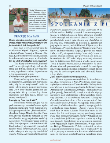 10 Orędzie Miłosierdzia 85 Denise Vallancey, pochodzi z Gibraltaru, zafascynowana orędziem Miłosierdzia od lat 80-tych XX wieku „pracuje dla Pana”, szerząc je zwłaszcza w krajach arabskich. Ma siedmioro dzieci, z których czworo mieszka w Omanie, oraz dwadzieścioro wnucząt. PRACUJĘ DLA PANA Denise, słyszałam, że intensywnie szerzy Pani orędzie Bożego Miłosierdzia, zwłaszcza w krajach arabskich. Jak do tego doszło? Mój mąż, Gerry, pracował wiele lat w Afryce (w Nigerii i Egipcie), a potem w krajach Zatoki Perskiej: w Omanie i Dubaju. Kiedy się tam wybieraliśmy, czułam, że to Jezus mnie tam posyła w jakimś celu. Czy już wtedy słyszała Pani o św. Faustynie? Tak. Kiedy tylko wyszedł „Dzienniczek” w wersji angielskiej, stał się dla mnie jak Biblia, nosiłam go wszędzie z sobą, czytałam i czułam, że powinnam o tym opowiedzieć innym. Co Panią w nim zafascynowało? Faustyna była prostą duszą i Jezus do niej mówił. Zapragnęłam być właśnie taką, aby Jezus mógł mówić także do mnie i abym mogła pomóc innym znaleźć Go w tym chaosie, jakim jest dzisiejszy świat. Kiedy czytałam Jego słowa, myślałam: jest tylu ludzi, którzy też muszą to usłyszeć! I zaczęła się Pani tym dzielić? Nie od razu wiedziałam, jak. Ale już podczas naszego lotu do Omanu, wydarzyła się znamienna rzecz. Wzięłam walizkę pełną różańców, „Dzienniczków”, obrazków Bożego Miłosierdzia i św. Faustyny, chociaż mąż mi to odradzał: To kraj muzułmański, mogą natychmiast wysłać cię z powrotem! Przechodzimy przez kontrolę celną. Policjant prosi o otwarcie walizki. Kiedy zobaczył jej zawartość, powiedział: Siostro! Jesteś chrześcijanką? Nas jest tu wielu, ukrytych, chcemy się dowiedzieć więcej o Jezusie. Nie masz jakichś nagrań, SPOTKANIA Z PI materiałów, czegokolwiek? Ja na to: Oczywiście. W tej właśnie walizce. Taki był początek. I zaraz następna sytuacja, w hotelu: chłopiec z Indii, który tam sprzątał, kiedy zobaczył mój różaniec i obrazek Pana Jezusa, podchodzi do mnie i pyta: Siostro, czy chciałabyś iść na Mszę św.? Wchodzimy do kościoła i... jestem tam jedyną białą twarzą, wokół Hindusi, Filipińczycy, Pakistańczycy... Pytają: skąd jestem? Gdzie pracuję? A ja na to, że przyjechałam z Anglii, a pracuję dla Jezusa i Maryi. – Czy nie opowiedziałabyś nam kiedyś o tym, co robisz? Tydzień później, gdy przybyłam do nich, zebrało się około 1000 ludzi. Nigdy wcześniej nie mówiłam do takiej grupy. Usłyszałam wtedy głos w sercu: To nie ty będziesz mówić, tylko Ja przez ciebie. Po czterdziestu minutach przemawiania podeszli do mnie i prosili, by się z nimi pomodlić; ze łzami w oczach dzielili się tym, że podczas spotkania czuli obecność Jezusa i Jego Matki. Jezus odpowiedział na Pani pragnienie... Właśnie tego wieczoru myślałam, że Jezus faktycznie chce, bym mówiła o Nim. Przedziwna rzecz wydarzyła się w czasie wojny w Zatoce Perskiej. Któregoś wieczoru byłam z mężem na spotkaniu dyplomatycznym. Ambasadorzy amerykański, brytyjski i niemiecki pytali, gdzie pracuję, bo wiedzieli, że mąż pracuje dla międzynarodowej sieci telefonicznej. Odpowiedziałam, że pracuję dla Pana. – A co konkretnie Pani robi? – Szerzę orędzie o Bożym miłosierdziu. – Tak, a o czym to jest? Rozmawialiśmy około 20 minut. Następnego dnia zadzwonił amerykański ambasador z prośbą, bym przyjechała i spotkała się z jego ludźmi. – Żyjemy w dobie kryzysu, niech Pani im mówi o Jezusie. Niech Pani mówi do żołnierzy, jest ich sześć tysięcy, wszyscy przeżywają strach, może Pani pomodlić się razem z nimi? Wstydziłam się, ale pomyślałam, jeśli Jezus tego chce, oddam się w Jego ręce i pojadę. Spotykaliśmy się w ogromnym namiocie, który wyglądał jak kaplica ekumeniczna. W rogu był obraz Bożego Miłosierdzia. Żołnierze siedzieli na ziemi z oczami utkwionymi we mnie, byli w wieku od 19. do 45. lat, wszyscy w mundurach. Zaczęłam właśnie od obrazu, od opowieści o małej Faustynie z dalekiego kraju, www.faustyna.pl styczeń, luty, marzec 2013 11 E L G R Z Y M A M I do której Jezus przemawiał. Pokazałam im „Dzienniczek”. Chcieli go otrzymać, nie wiedziałam, jak go mnożyć! W muzułmańskim kraju nie można nabyć chrześcijańskich książek ani dewocjonaliów. I co Pani zrobiła? Przepisywałam niektóre cytaty i zanosiłam im do bazy. Zwróciłam się też do znajomych w Anglii, Ameryce i posłali mi przez znajomego pilota muzułmanina kartony Koronek do Bożego Miłosierdzia, i rozdawałam je żołnierzom. Działy się rzeczy przedziwne. Wiele serc się nawróciło. Muzułmanin pomógł pani sprowadzić chrześcijańskie obrazki! Tak! Później poznałam też pewnego Hindusa, który drukował potajemnie nocą w biurze tysiące kopii obrazu Jezusa Miłosiernego! W święto Miłosierdzia rozdawaliśmy je w kościele. Wielu muzułmanów także o nie prosiło. Niektórzy przyznawali, że będą je musieli ukrywać przed rodziną. Czy to znaczy, że tam jest wielu ludzi poszukujących? Ludzie są głodni tego, co duchowe. Dlatego tak szybko szerzy się nabożeństwo do Bożego Miłosierdzia. Za każdym razem, gdy tam jadę, zawożę wiele „Dzienniczków”, tekstów Koronki i zostawiam w kościele. Ludzie biorą i biorą… A jak bardzo popularny jest obraz Jezusa Miłosiernego! Jest w wielu kościołach. Na Mszach św. w różnych językach (arabskim, konkani, malajalam) uczestnicy zawsze podchodzą, aby dotknąć obrazu i robią to z taką wiarą. Mówimy o chrześcijanach, tak? Nie tylko. O hinduistach też! Jak wielu ich przychodzi na Msze św.! W szkołach prowadzonych przez siostry katolickie 60% stanowią dzieci muzułmańskie. Ich rodzice chcą, aby były wychowywane do szacunku i uczone o Jezusie. W takim razie to bardzo otwarci ludzie. Bardzo. Odwiedzają mnie ludzie z Indii, Pakistanu, pracujący tam jako opieku