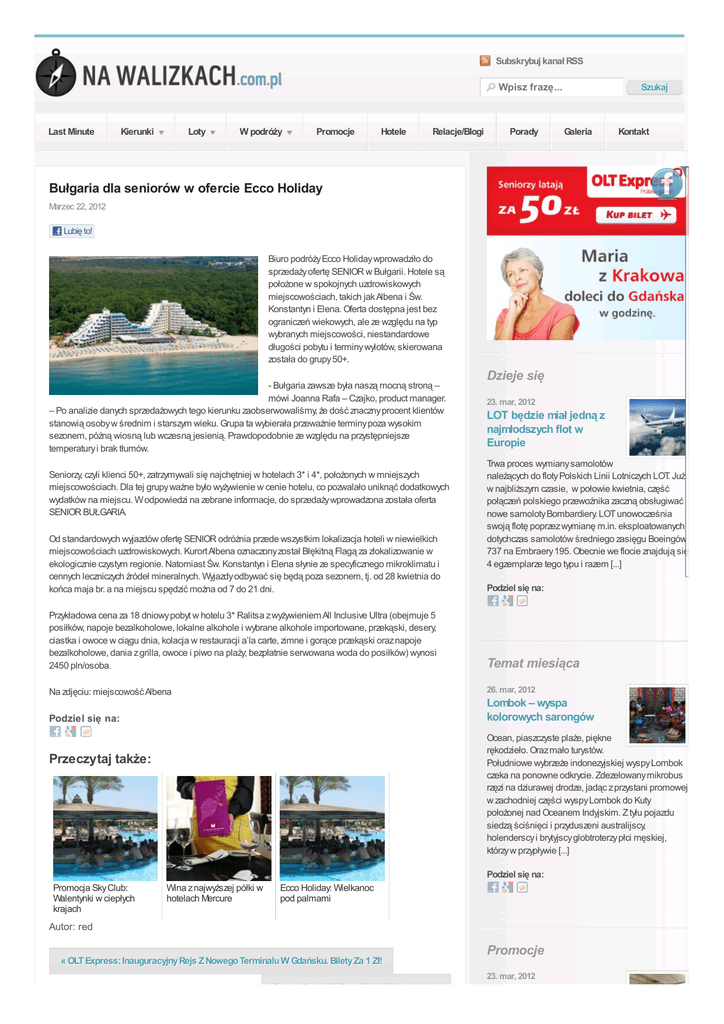 Subskrybuj kanał RSS Wpisz frazę... Last Minute Kierunki Loty W podróży Promocje Hotele Relacje/Blogi Porady Szukaj Galeria Kontakt Bułgaria dla seniorów w ofercie Ecco Holiday Marzec 22, 2012 Lubię to! Biuro podróży Ecco Holiday wprowadziło do sprzedaży ofertę SENIOR w Bułgarii. Hotele są położone w spokojnych uzdrowiskowych miejscowościach, takich jak Albena i Św. Konstantyn i Elena. Oferta dostępna jest bez ograniczeń wiekowych, ale ze względu na typ wybranych miejscowości, niestandardowe długości pobytu i terminy wylotów, skierowana została do grupy 50+. - Bułgaria zawsze była naszą mocną stroną – mówi Joanna Rafa – Czajko, product manager. – Po analizie danych sprzedażowych tego kierunku zaobserwowaliśmy, że dość znaczny procent klientów stanowią osoby w średnim i starszym wieku. Grupa ta wybierała przeważnie terminy poza wysokim sezonem, późną wiosną lub wczesną jesienią. Prawdopodobnie ze względu na przystępniejsze temperatury i brak tłumów. Seniorzy, czyli klienci 50+, zatrzymywali się najchętniej w hotelach 3* i 4*, położonych w mniejszych miejscowościach. Dla tej grupy ważne było wyżywienie w cenie hotelu, co pozwalało uniknąć dodatkowych wydatków na miejscu. W odpowiedzi na zebrane informacje, do sprzedaży wprowadzona została oferta SENIOR BUŁGARIA. Od standardowych wyjazdów ofertę SENIOR odróżnia przede wszystkim lokalizacja hoteli w niewielkich miejscowościach uzdrowiskowych. Kurort Albena oznaczony został Błękitną Flagą za zlokalizowanie w ekologicznie czystym regionie. Natomiast Św. Konstantyn i Elena słynie ze specyficznego mikroklimatu i cennych leczniczych źródeł mineralnych. Wyjazdy odbywać się będą poza sezonem, tj. od 28 kwietnia do końca maja br. a na miejscu spędzić można od 7 do 21 dni. Dzieje się 23. mar, 2012 LOT będzie miał jedną z najmłodszych flot w Europie Trwa proces wymiany samolotów należących do floty Polskich Linii Lotniczych LOT. Już w najbliższym czasie, w połowie kwietnia, część połączeń polskiego przewoźnika zaczną obsługiwać nowe samoloty Bombardiery. LOT unowocześnia swoją flotę poprzez wymianę m.in. eksploatowanych dotychczas samolotów średniego zasięgu Boeingów 737 na Embraery 195. Obecnie we flocie znajdują się 4 egzemplarze tego typu i razem [...] Podziel się na: Przykładowa cena za 18 dniowy pobyt w hotelu 3* Ralitsa z wyżywieniem All Inclusive Ultra (obejmuje 5 posiłków, napoje bezalkoholowe, lokalne alkohole i wybrane alkohole importowane, przekąski, desery, ciastka i owoce w ciągu dnia, kolacja w restauracji a’la carte, zimne i gorące przekąski oraz napoje bezalkoholowe, dania z grilla, owoce i piwo na plaży; bezpłatnie serwowana woda do posiłków) wynosi 2450 pln/osoba. Temat miesiąca Na zdjęciu: miejscowość Albena 26. mar, 2012 Podziel się na: Lombok – wyspa kolorowych sarongów Ocean, piaszczyste plaże, piękne rękodzieło. Oraz mało turystów. Południowe wybrzeże indonezyjskiej wyspy Lombok czeka na ponowne odkrycie. Zdezelowany mikrobus rzęzi na dziurawej drodze, jadąc z przystani promowej w zachodniej części wyspy Lombok do Kuty położonej nad Oceanem Indyjskim. Z tyłu pojazdu siedzą ściśnięci i przyduszeni australijscy, holenderscy i brytyjscy globtroterzy płci męskiej, którzy w przypływie [...] Przeczytaj także: Podziel się na: Promocja Sky Club: Walentynki w ciepłych krajach Wina z najwyższej półki w hotelach Mercure Ecco Holiday: Wielkanoc pod palmami Autor: red Promocje « OLT Express: Inauguracyjny Rejs Z Nowego Terminalu W Gdańsku. Bilety Za 1 Zł! 23. mar, 2012 Poznaj Ogród Królowej Marii W Londynie » Poznaj Ogród Królowej Marii W Londynie » Air France: atrakcyjne ceny biletów tylko do 27 marca! Tylko do 27 marca w ramach wiosennej promocji Air France można kupić bilety na loty w bardzo atrakcyjnych cenach. Terminy podróży różnią się w zależności od wybranego kierunku (szczegóły poniżej). Poza tym przypominamy, by w systemie rezerwacyjnym dokładnie sprawdzić cenę biletów. Każdego dnia i tak może być inna. Przykładowe ceny: Paryż – od [...] Napisz pierwszy komentarz. Dodaj komentarz Imię / Nick (wymagane) Podziel się na: Mail (nie będzie publikowany) (wymagane) 15. mar, 2012 OLT Express: studenci i seniorzy płacą za bilet lotniczy tylko 50 zł! Dodaj komentarz Seniorzy i studenci, którzy od 15 marca do 30 kwietnia zarezerwują bilety w OLT Express, będą latać za jedyne 50 zł. Promocja dotyczy wybranych połączeń krajowych od 1 kwietnia do końca maja 2012r. Promocja „OLT Express dla Seniorów i Studentów” dedykowana jest dla osób, które w dniu wylotu będą miały ukończone 60 lat oraz dla [...] Podziel się na: Pogoda: Lombok, Indonesia Tuesday Wednesday Today Partly Cloudy 28°/20° Chance of Rain 29°/21° Mostly Cloudy 28°/21° Mapa Dane do Mapy ©2012 - Warunki korzystania z usługi POPULARNE GORĄCE KOMENTARZE TAGI „Witajki” na lotnisku Chopina LUTY 3, 2012 Bali: wyspa pełna duchów LUTY 6, 2012 Katarzyna Cocyk: taką lubię Słowację LUTY 22, 2012 Guilin: miasto krasowych wzgórz, dziwek i cinkciarzy LUTY 12, 2012 Filmy Tagi Airbus A380 Anglia atrakcje Azja Boże Narodzenie cena Chiny Czechy Dubaj Dublin Emirates Finnair Frankfurt Gdańsk Helsinki hotel jarmark Kraków Londyn lot lotnisko lotnisko Chopina Lufthansa Mediolan Miami narty Nowy Jork obniżka Pekin podróż polska Poznań Praga promocja Ryanair samolot SPA tanie bilety Tap Portugal Warszawa Wielka Brytania WizzAir Wrocław wyprzedaż Włochy Tanie Hotele w Bułgarii 1097 Hoteli w Bułgarii, Wybierz, Porównaj Ceny, Zarezerwuj Już Dziś! pl.TripAdvisor.com/Bulgaria Wyjazdy wakacyjne- Tanio Poznań nawet 90% taniej. Sprawdź Dzisiejsze Oferty! Gruper.pl 4CHALLENGE wyprawy Przeżyj z nami Swoją przygodę życia Climbing Trekking Explore Adventure www.4challenge.org Na skróty Dzieje się Galeria Hotele Kierunki Afryka Ameryka Pół
