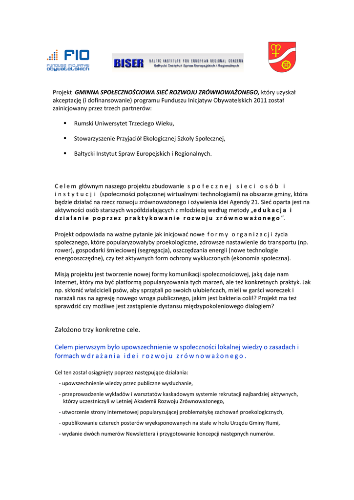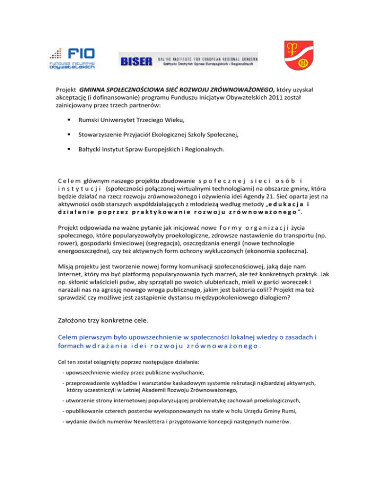 Projekt GMINNA SPOŁECZNOŚCIOWA SIEĆ ROZWOJU ZRÓWNOWAŻONEGO, który uzyskał akceptację (i dofinansowanie) programu Funduszu Inicjatyw Obywatelskich 2011 został zainicjowany przez trzech partnerów: Rumski Uniwersytet Trzeciego Wieku, Stowarzyszenie Przyjaciół Ekologicznej Szkoły Społecznej, Bałtycki Instytut Spraw Europejskich i Regionalnych. C e l e m głównym naszego projektu zbudowanie s p o ł e c z n e j s i e c i o s ó b i i n s t y t u c j i (społeczności połączonej wirtualnymi technologiami) na obszarze gminy, która będzie działać na rzecz rozwoju zrównoważonego i ożywienia idei Agendy 21. Sieć oparta jest na aktywności osób starszych współdziałających z młodzieżą według metody „e d u k a c j a i d z i a ł a n i e p o p r z e z p r a k t y k o w a n i e r o z w o j u z r ó w n o w a ż o n e g o ”. Projekt odpowiada na ważne pytanie jak inicjować nowe f o r m y o r g a n i z a c j i życia społecznego, które popularyzowałyby proekologiczne, zdrowsze nastawienie do transportu (np. rower), gospodarki śmieciowej (segregacja), oszczędzania energii (nowe technologie energooszczędne), czy też aktywnych form ochrony wykluczonych (ekonomia społeczna). Misją projektu jest tworzenie nowej formy komunikacji społecznościowej, jaką daje nam Internet, który ma być platformą popularyzowania tych marzeń, ale też konkretnych praktyk. Jak np. skłonić właścicieli psów, aby sprzątali po swoich ulubieńcach, mieli w garści woreczek i narażali nas na agresję nowego wroga publicznego, jakim jest bakteria coli!? Projekt ma też sprawdzić czy możliwe jest zastąpienie dystansu międzypokoleniowego dialogiem? Założono trzy konkretne cele. Celem pierwszym było upowszechnienie w społeczności lokalnej wiedzy o zasadach i formach w d r a ż a n i a i d e i r o z w o j u z r ó w n o w a ż o n e g o . Cel ten został osiągnięty poprzez następujące działania: - upowszechnienie wiedzy przez publiczne wysłuchanie, - przeprowadzenie wykładów i warsztatów kaskadowym systemie rekrutacji najbardziej aktywnych, którzy uczestniczyli w Letniej Akademii Rozwoju Zrównoważonego, - utworzenie strony internetowej popularyzującej problematykę zachowań proekologicznych, - opublikowanie czterech posterów wyeksponowanych na stałe w holu Urzędu Gminy Rumi, - wydanie dwóch numerów Newslettera i przygotowanie koncepcji następnych numerów. Drugi cel to zbudowanie s p o ł e c z n o ś c i o w e j s i e c i o s ó b i i n s t y t u c j i , która będzie działać na rzecz d o b r y c h p r a k t y k rozwoju zrównoważonego i ożywienia idei Agendy 21. Zadanie zostało wykonane przy dużym udziale moderatorów zewnętrznych. Nie udało się znaleźć silnej i intelektualnie dobrze przygotowanej postaci lidera. Powstał 7 osobowy zespół redakcyjny Newslettera, który gwarantuje przy wsparciu członków BISER-u w trybie wolontariatu wydawanie dalszych numerów Newslettera w cyklu miesięcznym. Nadal inne organizacje pozarządowe nie zdecydowały się wesprzeć projekt. Połowiczność rezultatów w budowaniu sieci wynika ze skomplikowanej sceny politycznej w Rumi, w której występuje duża rozdrobniona aktywność w połączeniu z silnym skonfliktowaniem w Radzie Gminy, co przenosi się na społeczność lokalną. Projekt nie zdołał stworzyć płaszczyzny apolitycznego kompromisu wokół Agendy 21. Być może oddziaływanie Newslettera dostarczanego do 600 adresatów z czasem do tego się przyczyni. Trzecim założonym celem było zainicjowanie w s p ó ł p r a c y m i ę d z y p o k o l e n i o w e j seniorów z młodzieżą i wolontariatem w działaniach na rzecz rozwoju zrównoważonego. Współpraca międzypokoleniowa przyniosła bardzo dobre rezultaty. Młodzież chętnie uczestniczyła w projekcie i okazała się dla Seniorów niezwykle pomocna i kontaktowa. Współpraca w trakcie warsztatów była bardzo owocna. Udało się stworzyć podstawy do zbudowania czterech posterów zrównoważonego rozwoju i dwóch wydań Newslettera. Jednakże bez wsparcia zewnętrznego projekt nie mógłby być realizowany ze względu na trudna materię problematyki rozwoju zrównoważonego w skali lokalnej. Seniorzy - słuchacze Uniwersytetu III Wieku - za wyjątkiem emerytowanych nauczycielek, nie maja umiejętności i imperatywu działania na rzecz społeczności lokalnej – są nastawieni konsumpcyjnie. Występuje lęk w aktywizacji. Dlatego pragnąc, aby projekt znalazł kontynuacje w bezpiecznej formie dalsze wydawanie Newslettera i funkcjonowanie strony internetowej powierzono nauczycielom Ekologicznej Szkole Społecznej, która projekt potraktowała jako misyjny. Cele były realizowane w zgodzie z metodą „edukacja i działanie poprzez praktykowanie rozwoju zrównoważonego” i w myśl zasady „myśl globalnie, działaj lokalnie”. Oba motta przyświecały wszystkim działaniom realizowanym w ramach zadania publicznego. W projekcie zgłoszony został Apel Rumski (w załączeniu) APEL RUMSKI O BUDOWANE NOWEGO OBLICZA SPOŁECZNOŚCI RUMI W DUCHU ROZWOJU ZRÓWNOWAZONEGO Rumia stała się miastem błyskawicznego rozwoju. Przyciągnęła ludzi z bliska, z Kaszub, ale i z dalekich stron Polski. Tworzymy społeczność, która powoli staje się wspólnotą. Ten proces chcemy przyspieszyć. Wspólnota integruje się wówczas, gdy mobilizuje się w obronie swoich wartości. Dzieje się tak gdy społeczność konkretnej ulicy, szkoły, dzielnicy, miasta – zaczyna działać na rzecz spraw swojej Małej Ojczyzny. W tworzeniu rumskiej Małej Ojczyzny w duchu rozwoju zrównoważonego dwa środowiska postanowiły wziąć sprawy w swoje ręce. Rumski Uniwersytet III Wieku i Stowarzyszenie Przyjaciół Ekologicznej Szkoły Społecznej przy wsparciu Bałtyckiego Instytutu Spraw Europejskich i Regionalnych postanowiły wspólnie i w dialogu działać na rzecz zmiany oblicza naszej rumskiej ziemi, naszej ziemi. Chodzi o taką zmianę, w której śro