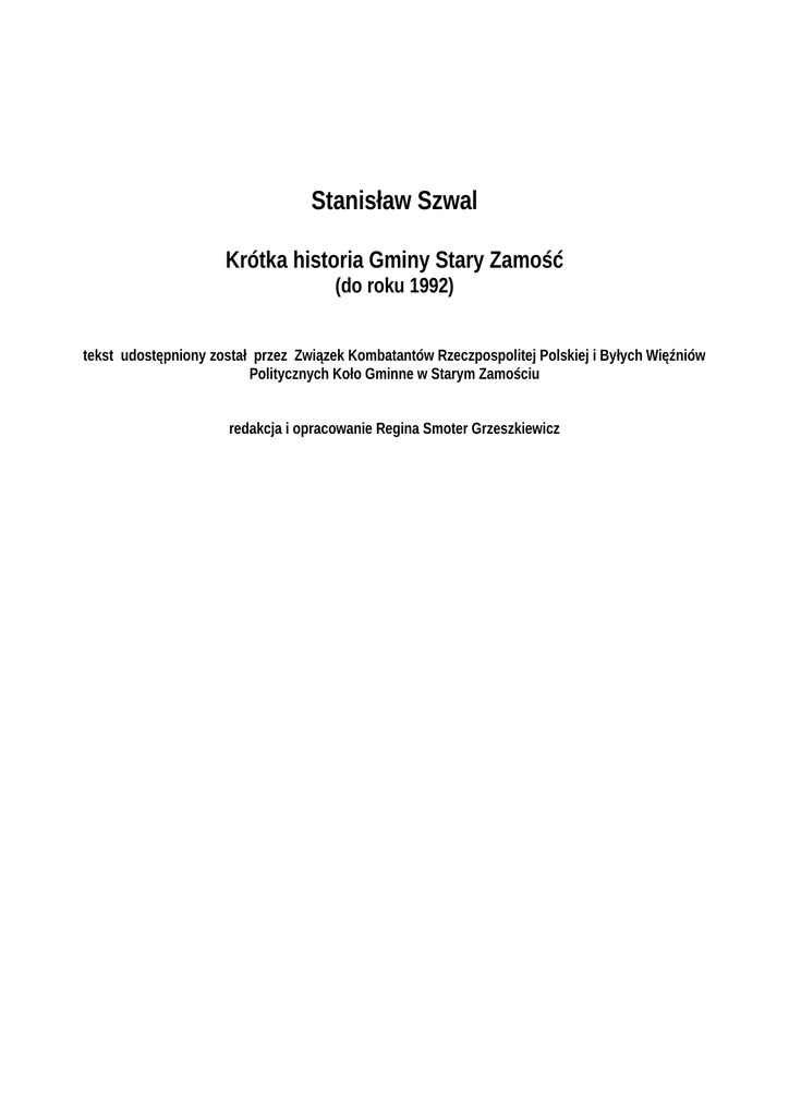 Stanisław Szwal Krótka historia Gminy Stary Zamość (do roku 1992) tekst udostępniony został przez Związek Kombatantów Rzeczpospolitej Polskiej i Byłych Więźniów Politycznych Koło Gminne w Starym Zamościu redakcja i opracowanie Regina Smoter Grzeszkiewicz Od początku istnienia wsi do czasów odzyskania niepodległości Miejscowość Stary Zamość, od której powstała gmina Stary Zamościu wywodzi się od czasów XV wieku tj,od momentu – jak pisze A. A. Witusik w swojej pracy p, t. "O Zamoyskich, Zamościu i Akademii Zamojskiej" – kiedy jeden z Jelitczyków, Tomasz z Łaźnina, protoplasta rodu Zamoyskich migrował ze staropolskiego województwa łęczyckiego na tutejsze tereny. Tomasz z Łaźnina w roku 1443 nabył dwie wsie: Wierzbę i Zamoście. Odtąd wieś Zamość miała stać się rodowym gniazdem Zamoyskich. Z czasem, kiedy kanclerz wielki korony Jan Zamoyski założył w 1580 roku miasto Zamość, wioska została nazwana Starym Zamościem. Michał Pieszko w swoim przewodniku po Zamościu i okolicy tak pisze o starym Zamościu: Tomasz przesiedlił się z województwa sieradzkiego do Ziemi Chełmskiej woj. Ruskiego. Wioska w której zamieszkał położona nad rzeką łączyła się z innymi osadami za pomocą mostu, dzięki czemu jego osiedle otrzymało nazwę Zamościa – dziś zwie się Starym Zamościem. Zygmunt Wierzchowiak w swoim artykule opublikowanym w czasopiśmie "Kultura i społeczeństwo ( 1977), tak pisze o Starym Zamościu. Wieś Stary Zamość leży przy szosie prowadzącej z Lublina do Zamościa na strumykiem bez nazwy, stanowiącym dopływ Topornicy. Istniała już w 1429 roku. Wieś ta w II połowie XIX wieku miała dwie nazwy "Zamość Ordynacki" i "Stary Zamość Kościelny"; wynikało to stąd, że część mieszkańców była zmuszona odrabiać pańszczyznę w folwarku ordynackim, cześć zaś w folwarku kościelnym. Jak podają źródła we wsi Stary Zamość Ordynacki i Kościelny władze carskie zniosły pańszczyznę 15 maja 1863 roku. Zniesienie pańszczyzny nastąpiło w związku z rozwijającym się wówczas w Polsce powstaniem styczniowym. Władze carskie chcąc uspokoić wrzenie chłopów wprowadziły tzw. "ukaz" carski, aby chłopi nie włączyli się do powstania. Po uwłaszczeniu ze względu na bardzo dobre położenie ekonomiczne we wsi Stary Zamość została utworzona gmina gmina stary Zamość jako ośrodek władz administracyjnych, gdzie utworzono również pocztę i szkołę rosyjską. Władze carskie po uwłaszczeniu w 1863 roku powołały do życia gminę Stary Zamość, do której włączono 15 wsi z przyległymi do nich folwarkami w następującej kolejności: 1. 2. 3. 4. 5. 6. 7. 8. 9. 10. 11. 12. 13. 14. 15. Stary Zamość Ordynacki i Kościelny Wierzba Krasne Wisłowiec Majdan Sitaniecki Zabytów Wiszenki Sulmice Kalinówka Huszczka Mała Huszczka Duża Chomęciska duże Udrycze Dękowice Chomęciska Małe. Na czele gminy stał wówczas wójt z wyboru i jego zastępca, sekretarz gminy i jego pomocnik. Wójt musiał być pochodzenia rosyjskiego i nosił na piesi medal na którym widniało godło Rosji i napis w języku rosyjskim "Wójt gminy Stary Zamość". Medal ten gwarantował osobie wójta nietykalność. Wraz z utworzeniem gminy utworzono - 3 osobowy posterunek policji dla nadzoru i utrzymania porządku w zasięgu gminy. Z okresu powstania styczniowego brak brak źródłowych wiadomości o walkach w gminie Stary Zamość. Wg. relacji ustnej kol. Bączka Stanisława z Krasnego na podstawie opowiadań jego rodziców, prawdopodobnie we wsi Krasne w czasie powstania Kozacy przeprowadzali rewizję szukając ukrytych powstańców z bronią. Broń w postaci pistoletów przechowywana była w starej lipie. Kol[ega] Pieczykolan Czesław pamięta jak ojciec powiadał, że powstańcy z 1863 roku stoczyli potyczkę w Poduchownym Zamościu i Wierzbie. Kol. Mazurek Jan z Krasnego słyszał również od ojca, że kasa powstańców została zabrana przez Kozaków. Kasa była ukryta na tzw. "wapieku" W Krasnem. Jak wynika z powyższego nie było w gminie większych walk powstańczych jak to miało miejsce na Roztoczu w rejonie Zwierzyńca, Krasnobrodu, Tomaszowa Lubelskiego i Biłgoraja. Po upadku powstania styczniowego i wprowadzanej rusyfikacji, mieszkańcy gminy Stary Zamość dążyli do podniesienia oświaty wśród młodzieży. W tym celu w pobliżu kościoła parafialnego przy Kmiecicowym Gościńcu1 utworzono szkolę. Uczono w niej na j. rosyjskim. Frekwencja szkolna była bardzo mała, ponieważ powszechne nauczanie nie obowiązywało. Władze carskie nie troszczyły się o szerzenie oświaty, a o nauczaniu historii Polski nie było w ogóle mowy. Właśnie w tym okresie pojawili się na wsi tzw. "wędrowni polscy nauczyciele najczęściej pochodzący z Galicji zaboru austriackiego, którzy uczyli przy drzwiach zamkniętych" i uczyli czytania i pisania w języku polskim. O takim nauczycielu jest wzmianka w Kronice Szkoły w Krasnem. Wielkim wydarzeniem dla gminy było utworzenie w 1881 roku Orkiestry Włościańskiej założonej przez Karola Namysłowskiego. Orkiestra ta odegrała wielką rolę "dla pokrzepienia serc" w dziejach tutejszej gminy, a głęboka treść patriotyczna granych melodii ludowych ugruntowywała patriotyzm mieszkańców tych okolic. Około roku 1898 do poszczególnych wsi gminy Stary Zamość docierały gazety polskie jak: "Zorza", później "Zaranie", "Gazeta Świąteczna", "Posiew", "Polak" i "Głos Ludu". Największa popularnością cieszyło się "Zaranie". W roku 1904 kiedy wybuchła wojna rosyjsko – japońska wielu mieszkańców gminy zostało zmobilizowanych do wojska i skierowanych na front japoński, Duża część nie powróciła dostając się do niewoli, lub poniosła śmierć w walkach. Po zakończonej wojnie w 1905 roku w której Rosjanie ponieśli klęskę, władze carskie ogłosiły w Polsce tolerancję wyznań. W związku z tym w Starym Zamościu zakończono budowę kościoła p