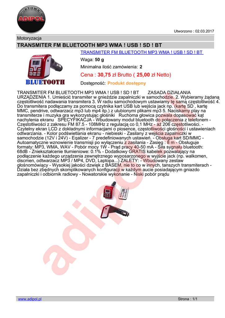 Utworzono : 02.03.2017 Motoryzacja TRANSMITER FM BLUETOOTH MP3 WMA ! USB ! SD ! BT TRANSMITER FM BLUETOOTH MP3 WMA ! USB ! SD ! BT Waga: 50 g Minimalna ilość zamówienia: 2 Cena : 30,75 zł Brutto ( 25,00 zł Netto) Dostępność: Produkt dostępny ad ip ol .p l TRANSMITER FM BLUETOOTH MP3 WMA ! USB ! SD ! BT ZASADA DZIAŁANIA URZĄDZENIA 1. Umieścić transmiter w gnieździe zapalniczki w samochodzie. 2. Wybieramy żądaną częstotliwość nadawania transmitera 3. W radiu samochodowym ustawiamy tę samą częstotliwość 4. Do transmitera podłączamy za pomocą czytnika kart USB lub wejścia jack np. (kartę SD , kartę MMC, pendrive, odtwarzacz mp3 lub mp4 itp.) z ulubionymi plikami mp3 5. Naciskamy play na transmiterze i muzyka gra wykorzystując głośniki Ruchoma głowica pozwala dopasować kąt nachylenia ekranu SPECYFIKACJA - Wbudowany moduł bluetooth do połączenia z telefonem Częstotliwości z zakresu FM 87.5 - 108MHz z regulacją co 0,1 MHz - aż 206 częstotliwości. Czytelny ekran LCD z dokładnymi informacjami o piosence, częstotliwości głośności i ustawieniach odtwarzania. - Kolor podświetlania ekranu - niebieski - Zasilany z wejścia zapalniczki w samochodzie (12V i 24V) - Eqalizer - 7 predefiniowanych ustawień. - Obsługa kart SD/MMC Autoamatyczne wznowienie transmisji po wyłączeniu z zasilania - Zasięg : 8 m - Obsługuje formaty: MP3, WMA, WAV - Pobór mocy 1W - Prąd pracy 40-50 mA - Siła sygnału bluetooth: 68dB - Zniekształcenie tłumieniowe: 0.1% - Dodatkowy GRATIS kabelek pozwalający na podłączenie każdego urządzenia zewnętrznego wyposarzonego w wyjście jack (np. walkomen, discmen, odtwarzacz MP3 / MP4, DVD, Laptopa...) ZALETY: - Wbudowany zestaw głośnomówiący - Wysokiej jakości dzwięk z BASEM, nie to co w innych, tanszych transmiterach Działa bez zbędnych skomplikowanych konfiguracji w każdym aucie posiadającym gniazdo zapalniczki i odbiornik radiowy - Nowatorskie wykonanie - Niski pobór prądu www.adipol.pl Powered by TCPDF (www.tcpdf.org) Strona : 1/1