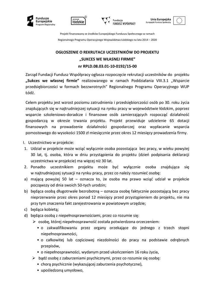 Projekt finansowany ze środków Europejskiego Funduszu Społecznego w ramach Regionalnego Programu Operacyjnego Województwa Łódzkiego na lata 2014 – 2020 OGŁOSZENIE O REKRUTACJI UCZESTNIKÓW DO PROJEKTU „SUKCES WE WŁASNEJ FIRMIE” nr RPLD.08.03.01-10-0192/15-00 Zarząd Fundacji Fundusz Współpracy ogłasza rozpoczęcie rekrutacji uczestników do projektu „Sukces we własnej firmie” realizowanego w ramach Poddziałania VIII.3.1 „Wsparcie przedsiębiorczości w formach bezzwrotnych” Regionalnego Programu Operacyjnego WUP Łódź. Celem projektu jest wzrost poziomu zatrudnienia i przedsiębiorczości osób po 30. roku życia znajdujących się w najtrudniejszej sytuacji na rynku pracy w województwie łódzkim, poprzez wsparcie szkoleniowo-doradcze i finansowe osób zamierzających rozpocząć działalność gospodarczą w okresie trwania projektu. Projekt przewiduje udzielenie 65 dotacji finansowych na prowadzenie działalności gospodarczej oraz wypłacanie wsparcia pomostowego do wysokości 1500 zł miesięcznie przez okres 12 miesięcy prowadzenia firmy. I. Uczestnictwo w projekcie: 1. Udział w projekcie może wziąć wyłącznie osoba pozostająca bez pracy, w wieku powyżej 30 lat, tj. osoba, która w dniu przystąpienia do projektu (dzień podpisania deklaracji uczestnictwa w projekcie) ma więcej niż 30 lat. 2. Ponadto uczestnikiem projektu może być wyłącznie osoba znajdująca się w najtrudniejszej sytuacji na rynku pracy, przez co należy rozumieć osobę: a) mającą powyżej 50 lat – oznacza to, że osoba ma prawo wziąć udział w projekcie począwszy od dnia swoich 50-tych urodzin; b) będąca osobą długotrwale bezrobotną – oznacza osobę faktycznie pozostającą bez pracy nieprzerwanie przez okres ponad 12 miesięcy przed przystąpieniem do projektu, nie ma przy tym znaczenia fakt zarejestrowania w powiatowym urzędzie; c) będąca kobietą; d) będąca osobą z niepełnosprawnościami, przez co rozumie się: osobę, której niepełnosprawność została potwierdzona orzeczeniem: • o zakwalifikowaniu przez organy orzekające do jednego z trzech stopni niepełnosprawności, • o całkowitej lub częściowej niezdolności do pracy na podstawie odrębnych przepisów, • o niepełnosprawności, wydanym przed ukończeniem 16 roku życia, bądź osobę z zaburzeniami psychicznymi, przez co rozumie się osobę: • chorą psychicznie (wykazującej zaburzenia psychotyczne), • upośledzoną umysłowo, • wykazującą inne zakłócenia czynności psychicznych, które zgodnie ze stanem wiedzy medycznej zaliczane są do zaburzeń psychicznych, a osoba ta wymaga świadczeń zdrowotnych lub innych form pomocy i opieki niezbędnych do życia w środowisku rodzinnym lub społecznym; e) będąca osobą o niskich kwalifikacjach – rozumie się przez to osobę bez wykształcenia, lub osobę z wykształceniem podstawowym, gimnazjalnym, ponadgimnazjalnym ogólnokształcącym, ponadgimnazjalnym zawodowym, zasadniczym zawodowym. 3. Uczestnikiem projektu może być wyłącznie osoba, która uczy się, lub zamieszkuje na obszarze województwa łódzkiego w rozumieniu przepisów Kodeksu Cywilnego. 4. Uczestnikiem projektu może być wyłącznie osoba, która zamierza zarejestrować działalność gospodarczą na terenie woj. łódzkiego. 5. Do projektu zostanie przyjętych 80 osób w tym min. 55 kobiet. II. Szczegółowe wytyczne dotyczące zgłaszania się do udziału w projekcie oraz udziału w nim określa Regulamin rekrutacji do projektu „Sukces we własnej firmie” dostępny stronach internetowych www.swwf.pl i www.cofund.org.pl/projekty/sukces-we-wlasnej-firmie oraz w biurze projektu. III. Składanie formularzy rekrutacyjnych 1. Formularz rekrutacyjny należy złożyć w biurze projektu lub przesłać do biura projektu pocztą tradycyjną do 10.01.2017 r. W przypadku przesłania drogą pocztową decyduje data wpływu formularza do realizatora projektu. Do wydrukowanego i podpisanego imieniem i nazwiskiem formularza należy dołączyć jego wersję elektroniczną na płycie CD także podpisanej imieniem i nazwiskiem kandydata/kandydatki. 2. Wzór formularza rekrutacyjnego oraz wzór oświadczenia osoby nieaktywnej zawodowo dostępne są w biurze projektu oraz na stronie internetowej projektu (na stronie FFW www.cofund.org.pl/projekty/sukces-we-wlasnej-firmie lub www.swwf.pl). IV. Potrzebne adresy: Projekt realizowany jest przez Fundację Fundusz Współpracy, ul. Górnośląska 4a, 00-444 Warszawa. Biuro projektu mieści się przy ul. Wólczańskiej 51, 90-608 Łódź, godziny przyjęć 8:00 – 16:00. Więcej informacji można uzyskać pod numerem telefonu +48 22 4509867/+48 885 243 187 lub adresem e-mail [email protected] / [email protected].