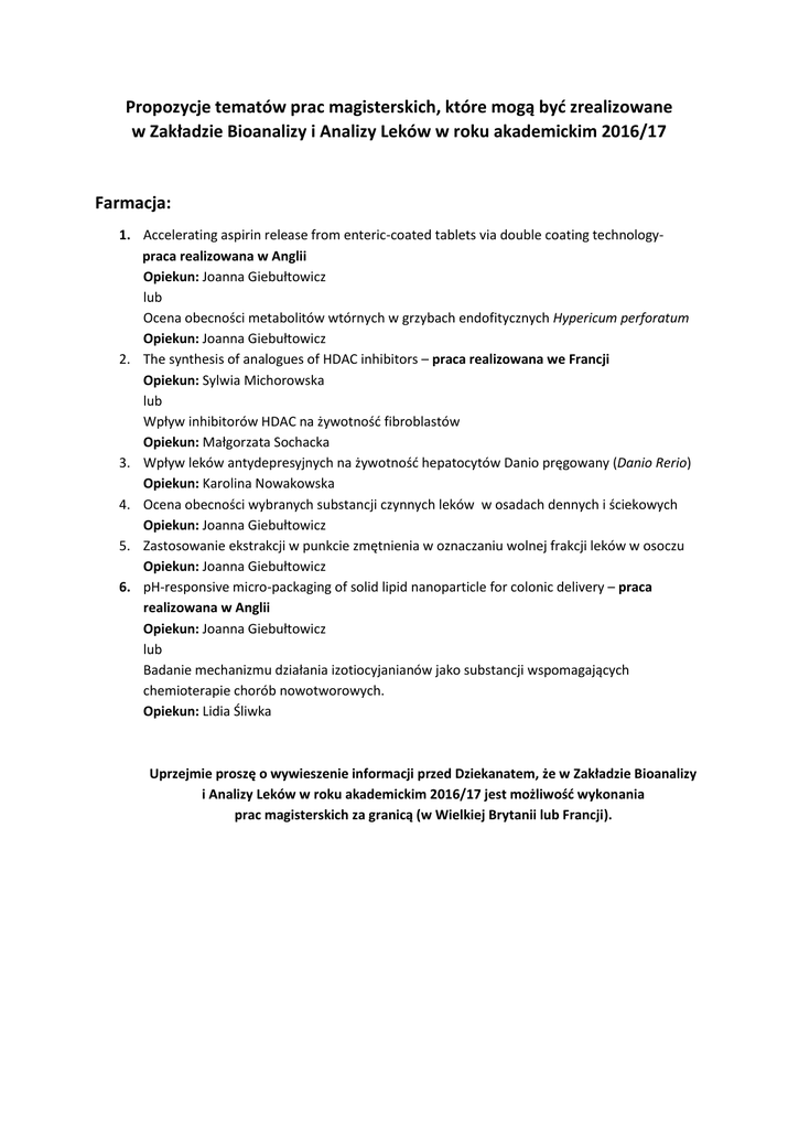 Propozycje tematów prac magisterskich, które mogą być zrealizowane w Zakładzie Bioanalizy i Analizy Leków w roku akademickim 2016/17 Farmacja: 1. Accelerating aspirin release from enteric-coated tablets via double coating technologypraca realizowana w Anglii Opiekun: Joanna Giebułtowicz lub Ocena obecności metabolitów wtórnych w grzybach endofitycznych Hypericum perforatum Opiekun: Joanna Giebułtowicz 2. The synthesis of analogues of HDAC inhibitors – praca realizowana we Francji Opiekun: Sylwia Michorowska lub Wpływ inhibitorów HDAC na żywotność fibroblastów Opiekun: Małgorzata Sochacka 3. Wpływ leków antydepresyjnych na żywotność hepatocytów Danio pręgowany (Danio Rerio) Opiekun: Karolina Nowakowska 4. Ocena obecności wybranych substancji czynnych leków w osadach dennych i ściekowych Opiekun: Joanna Giebułtowicz 5. Zastosowanie ekstrakcji w punkcie zmętnienia w oznaczaniu wolnej frakcji leków w osoczu Opiekun: Joanna Giebułtowicz 6. pH-responsive micro-packaging of solid lipid nanoparticle for colonic delivery – praca realizowana w Anglii Opiekun: Joanna Giebułtowicz lub Badanie mechanizmu działania izotiocyjanianów jako substancji wspomagających chemioterapie chorób nowotworowych. Opiekun: Lidia Śliwka Uprzejmie proszę o wywieszenie informacji przed Dziekanatem, że w Zakładzie Bioanalizy i Analizy Leków w roku akademickim 2016/17 jest możliwość wykonania prac magisterskich za granicą (w Wielkiej Brytanii lub Francji). Propozycje tematów prac magisterskich, które mogą być zrealizowane w Zakładzie Bioanalizy i Analizy Leków w roku akademickim 2016/17 Analityka: 1. Korelacja poziomu toksyn mocznicowych i całkowitego potencjału antyoksydacyjnego u pacjentów po przeszczepieniu nerki Opiekun: Natalia Korytowska 2. Oznaczanie stężenia cysteiny u pacjentów po przeszczepieniu nerki Opiekun: Emilia Krzemińska 3. Ocena narażenia na ftalany osób zdrowych i żywionych pozajelitowo Opiekun: Joanna Rogulska 4. Ocena parametrów oksydacyjnych w osoczu osób z nefropatią kłębuszkową Opiekun: Bartłomiej Sankowski 5. Badanie potencjału oksydoredukcyjnego w badanych narządach szczura Opiekun: Piotr Suchocki 6. Study the epigenetic impact on the inflammatory response in glucocorticoid sensitive/resistant cells- praca realizowana we Francji Opiekun: Sylwia Michorowska lub Wpływ inhibitorów HDAC na żywotność fibroblastów Opiekun: Małgorzata Sochacka Istnieje możliwość rozpoczęcia prac dyplomowych jeszcze w tym roku akademickim. Uprzejmie proszę o wywieszenie informacji przed Dziekanatem, że w Zakładzie Bioanalizy i Analizy Leków w roku akademickim 2016/17 jest możliwość wykonania pracy magisterskiej za granicą (we Francji).