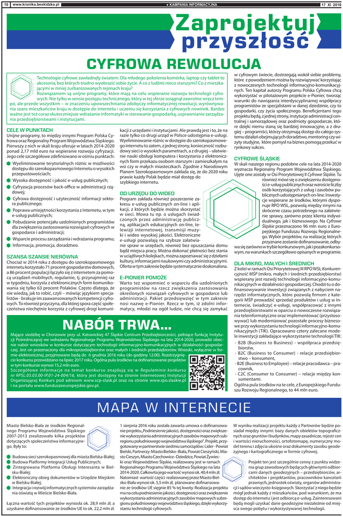 10 www.kronika.beskidzka.pl I 17 XI 2016 ● KAMPANIA INFORMACYJNA Zaprojektuj przyszłość CYFROWA REWOLUCJA Technologie cyfrowe zawładnęły światem. Dla młodego pokolenia komórka, laptop czy tablet to akcesoria, bez których trudno wyobrazić sobie życie. A co z ludźmi nieco starszymi? Co z mieszkającymi w mniej zurbanizowanych rejonach kraju? Rozwiązaniem są unijne programy, które mają na celu wspieranie rozwoju technologii cyfrowych. Nie tylko w sensie postępu technicznego, który w tej sferze osiągnął zawrotne wręcz tempo, ale przede wszystkim – w znaczeniu upowszechniania zdobyczy informatycznej rewolucji, wyrównywania szans mieszkańców kraju w dostępie do internetu i uczeniu się korzystania z cyfrowych nowinek. Bardzo ważne jest też coraz skuteczniejsze wdrażanie informatyki w sterowanie gospodarką, usprawnianie zarządzania przedsiębiorstwami i instytucjami. CELE W PUNKTACH Unijne programy, to między innymi Program Polska Cyfrowa oraz Regionalny Program Województwa Śląskiego. Pierwszy z nich w skali kraju oferuje w latach 2014-2020 ponad 2,17 mld euro na wspieranie rozwoju cyfryzacji. Jego cele szczegółowe zdefiniowano w ośmiu punktach: Wyeliminowanie terytorialnych różnic w możliwości dostępu do szerokopasmowego Internetu o wysokich przepustowościach; Wysoka dostępność i jakość e-usług publicznych; Cyfryzacja procesów back-office w administracji rządowej; Cyfrowa dostępność i użyteczność informacji sektora publicznego; Poprawa umiejętności korzystania z Internetu, w tym e-usług publicznych; Pobudzanie potencjału uzdolnionych programistów dla zwiększenia zastosowania rozwiązań cyfrowych w gospodarce i administracji; Wsparcie procesu zarządzania i wdrażania programu; Informacja, promocja, doradztwo. SZANSA SZANSIE NIERÓWNA Chociaż w 2014 roku z dostępu do szerokopasmowego internetu korzystało 71 procent gospodarstw domowych, a 86 procent populacji łączyło się z internetem za pomocą urządzeń mobilnych, regularnie, tj. przynajmniej raz w tygodniu, korzysta z elektronicznych form komunikowania się tylko 63 procent Polaków. Często dlatego, że nie wiedzą, jak to robić, czyli – mówiąc językiem specjalistów - brakuje im zaawansowanych kompetencji cyfrowych. To również przyczyna, dla której spora część społeczeństwa niechętnie korzysta z cyfrowej drogi komuni- kacji z urzędami i instytucjami. Ale prawdą jest i to, że na razie tylko co drugi urząd w Polsce udostępnia e-usługi. Wyeliminowanie różnic w dostępie do szerokopasmowego internetu to zatem, z jednej strony, konieczność rozbudowy sieci o wysokich parametrach, a z drugiej – ułatwienie nauki obsługi komputera i korzystania z elektronicznych form przekazu osobom starszym i zamieszkałym na wsi czy w małych miasteczkach. Zgodnie z Narodowym Planem Szerokopasmowym zakłada się, że do 2020 roku prawie każdy Polak będzie miał dostęp do szybkiego internetu. OD URZĘDU DO WIDEO Program zakłada również poszerzenie zakresu e-usług publicznych on-line i aplikacji, z których będzie można skorzystać w sieci. Mowa tu np. o usługach świadczonych przez administrację publiczną, aplikacjach edukacyjnych on-line, telewizji internetowej, transmisji muzyki i wideo wysokiej jakości. Elektroniczne e-usługi pozwalają na szybsze załatwianie spraw w urzędach, również bez opuszczania domu bądź miejsca pracy. Można dokonać płatności bez stania w uciążliwych kolejkach, można zapoznawać się z dziełami kultury, informacjami naukowymi czy administracyjnymi. Oferta w tym zakresie będzie systematycznie doskonalona. E-PIONIER POMOŻE Warto też wspomnieć o wsparciu dla uzdolnionych programistów na rzecz zwiększenia zastosowania określonych rozwiązań cyfrowych w gospodarce lub administracji. Pakiet przedsięwzięć w tym zakresie nosi nazwę e-Pionier. Rzecz w tym, iż zdolni informatycy, młodzi na ogół ludzie, nie chcą się zamykać NABÓR TRWA… Mające siedzibę w Chorzowie przy ul. Katowickiej 47 Śląskie Centrum Przedsiębiorczości, pełniące funkcję Instytucji Pośredniczącej we wdrażaniu Regionalnego Programu Województwa Śląskiego na lata 2014-2020, prowadzi obecnie nabór wniosków w konkursie dotyczącym technologii informacyjno-komunikacyjnych w działalności gospodarczej. Jest on przeznaczony dla mikroprzedsiębiorstw oraz małych i średnich przedsiębiorstw. Wnioski, wyłącznie w formie elektronicznej, przyjmowane będą do 6 grudnia 2016 roku (do godziny 12.00). Rozstrzygnięcie konkursu przewidziano na lipiec 2017 roku. Ogólna pula środków na dofinansowanie projektów w tym konkursie wynosi 15,2 mln euro. Szczegółowe informacje na temat konkursu znajdują się w Regulaminie konkursu nr RPSL.03.03.00-IP.01-24-004/16, który jest dostępny na stronie internetowej Instytucji Organizującej Konkurs pod adresem www.scp-slask.pl oraz na stronie www.rpo.slaskie.pl i na portalu www.funduszeeuropejskie.gov.pl. w cyfrowym świecie, dostrzegają wokół siebie problemy, które z powodzeniem można by rozwiązywać korzystając z nowoczesnych technologii informacyjno-komunikacyjnych. Ten kapitał autorzy Programu Polska Cyfrowa chcą wykorzystać w pilotażowym projekcie e-Pionier, tworząc warunki do nawiązania interdyscyplinarnej współpracy programistów ze specjalistami w danej dziedzinie, czy to gospodarki, czy życia społecznego. Beneficjentami tego projektu będą, z jednej strony, instytucje administracji centralnej i samorządowej oraz podmioty gospodarcze, które dzięki niemu staną się bardziej innowacyjne, a z drugiej – programiści, którzy otrzymają dostęp do całego systemu działań obejmujących doradztwo, mentoring czy wizyty studyjne, które pomysł na biznes pomogą przekuć w rynkowy sukces. CYFROWE ŚLĄSKIE W skali naszego regionu podobne cele na lata 2014-2020 wyznacza Regionalny Program Województwa Śląskiego. Ujęte one zostały w Osi Priorytetowej II C
