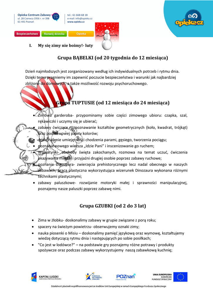 Opieka Centrum Zabawy tel.: 61 668 68 18 ul. 28 Czerwca 1956 r. nr 398 61-441 Poznań e-mail: [email protected] www.opieka.cz I. My się zimy nie boimy!- luty Grupa BĄBELKI (od 20 tygodnia do 12 miesiąca) Dzień najmłodszych jest zorganizowany według ich indywidualnych potrzeb i rytmu dnia. Dzięki temu pragniemy im zapewnić poczucie bezpieczeństwa i warunki jak najbardziej zbliżone do domowych, a także możliwość rozwoju psychoruchowego. Grupa TUPTUSIE (od 12 miesiąca do 24 miesiąca) Zimowa garderoba- przypominamy sobie części zimowego ubioru: czapka, szal, rękawiczki i uczymy się je ubierać; zabawy ćwiczące rozpoznawanie kształtów geometrycznych (koło, kwadrat, trójkąt) oraz podstawowej palety kolorów; doskonalenie umiejętności chodzenia parami, gęsiego, tworzenia pociągu; poznanie nowego wiersza „Idzie Pani” i inscenizowanie go ruchem; Walentynki- obchody święta zakochanych, rozmowa na temat uczuć, ćwiczenia okazywania miłości i przyjaźni drugiej osobie poprzez zabawy ruchowe; poznanie Dinozaura- zwierzęcia prehistorycznego lecz nadal obecnego w naszych zabawach, praca plastyczna wykorzystująca wizerunek Dinozaura wykonana różnymi technikami plastycznymi; zabawy paluszkowe- rozwijanie motoryki małej i sprawności manipulacyjnej, poznajemy nasze paluszki poprzez zabawę nimi. Grupa GZUBKI (od 2 do 3 lat) Zima w żłobku- doskonalimy zabawy w grupie związane z porą roku; spacery na świeżym powietrzu- obserwujemy oznaki zimy; nauka piosenki o Misiu – doskonalimy pamięć językową oraz wymowę, kształtujemy wiedzę dotyczącą rytmu dnia i następujących po sobie posiłkach; "Co jest w lodówce?" – na podstawie gry poznajemy różne potrawy i produkty spożywcze oraz podczas zabawy wykorzystujemy naszą zabawkową kuchnię; Opieka Centrum Zabawy tel.: 61 668 68 18 ul. 28 Czerwca 1956 r. nr 398 61-441 Poznań e-mail: [email protected] www.opieka.cz doskonalenie znajomości wiersza „Biegały ptaszki"- inscenizujemy go ruchem oraz rozwijamy przy tym narządy mowy; karmniki dla ptaków - poznajemy czym jest karmnik, do czego służy i kto z niego korzysta oraz tworzymy własnoręcznie wykonane karmniki przy wykorzystaniu różnorodnych materiałów plastycznych; doskonalenie umiejętności porządkowych - odkładanie zabawek na odpowiednie miejsce, sprzątanie zabawek przed posiłkami. II. Ruch to zdrowie: Zabawy ruchowe w grupie z wykorzystaniem elementów wspólnej zabawy oraz doskonalące umiejętność nazywania poszczególnych części swojego ciała; ćwiczenia dużych grup mięśniowych: skłony, podskoki, turlanie się, przysiady; pokonywanie torów przeszkód z wykorzystaniem elementów o różnej płaszczyźnie, wielkości i kształcie. III. Czynności samoobsługowe: Kształtowanie nawyku samodzielnego spożywania posiłków oraz prawidłowego trzymania i posługiwania się sztućcami; wyrabianie nawyku używania form grzecznościowych (Dzień dobry, Do widzenia, Przepraszam, Proszę, Dziękuję); wspieranie procesu kształtowania nawyków higienicznych i prozdrowotnych; kształtowanie umiejętności samodzielnego ubierania i rozbierania się. IV. Jakie święta spotkamy w Lutym?: 2 lutego- Dzień Świstaka, Dzień Niedźwiedzia, Dzień Pozytywnego Myślenia; 9 lutego- Międzynarodowy Dzień Pizzy; 11 lutego - Światowy Dzień Chorego; 12 lutego- Tłusty Czwartek; 13 lutego- Światowy Dzień Radia; 14 lutego- Walentynki; 16 lutego- Dzień Poczty Polskiej; 17 lutego- Dzień Kota; 21 lutego- Międzynarodowy Dzień Języka Ojczystego; 24 lutego- Dzień niespodziewanego całusa; 26 lutego- Dzień Dinozaura; 27 lutego- Dzień Niedźwiedzia Polarnego; Opieka Centrum Zabawy tel.: 61 668 68 18 ul. 28 Czerwca 1956 r. nr 398 61-441 Poznań e-mail: [email protected] www.opieka.cz PIOSENKI I WIERSZYKI, KTÓRYCH SIĘ UCZYMY Piosenka "Misio Mniam Mniam" Mały Miś jest głodny i ma pusty brzuszek. Nie jadł jeszcze dziś śniadania mały Łakomczuszek. Misio mniam mniam, misio mniam mniam i ma pełny brzuszek. Raz, dwa, trzy zjedz śniadanie i Ty! Wiersz " Biegały ptaszki" Biegały, ptaszki biegały po śniegu jak płótno białym. Stukały dzióbkiem w okienko: Rzućcie nam proszę ziarenko! Ziemia na kamień zmarznięta. Czy o nas nikt nie pamięta? Wybiegły dzieci z przedszkola, sypią ziarenka dokoła. Ptaszki ziarenka zebrały i dalej – frrr – poleciały. Wiersz „Idzie Pani” Idzie Pani- tup, tup; Puka do drzwi- stuk, stuk. Dzieci skaczą –hop, hop; Żabka robi -duży skok. Wieje wietrzyk- szu, szu; Sowa huczy- hu, hu. Pada deszczyk- kap, kap; A ja klaszczę- klap, klap.